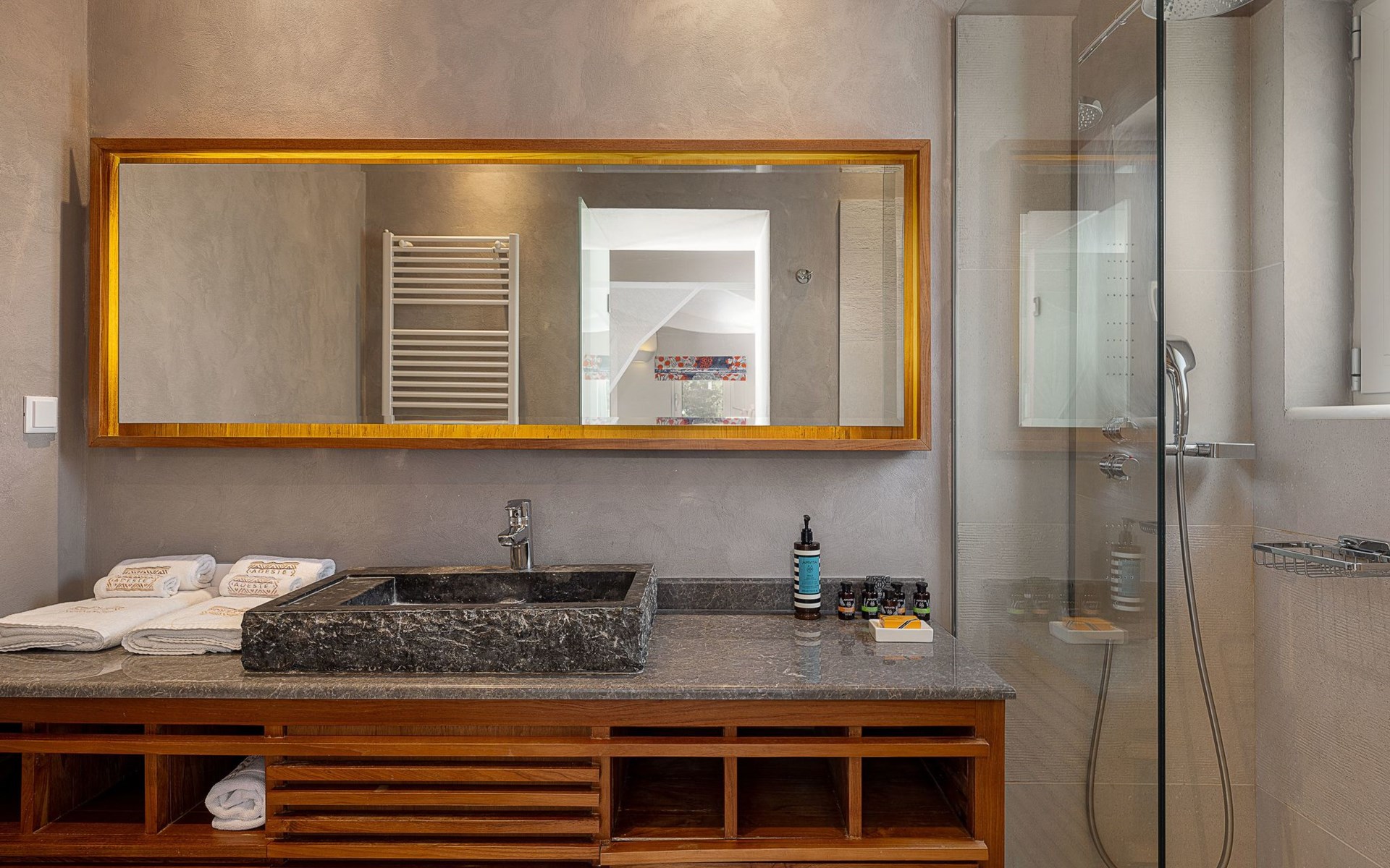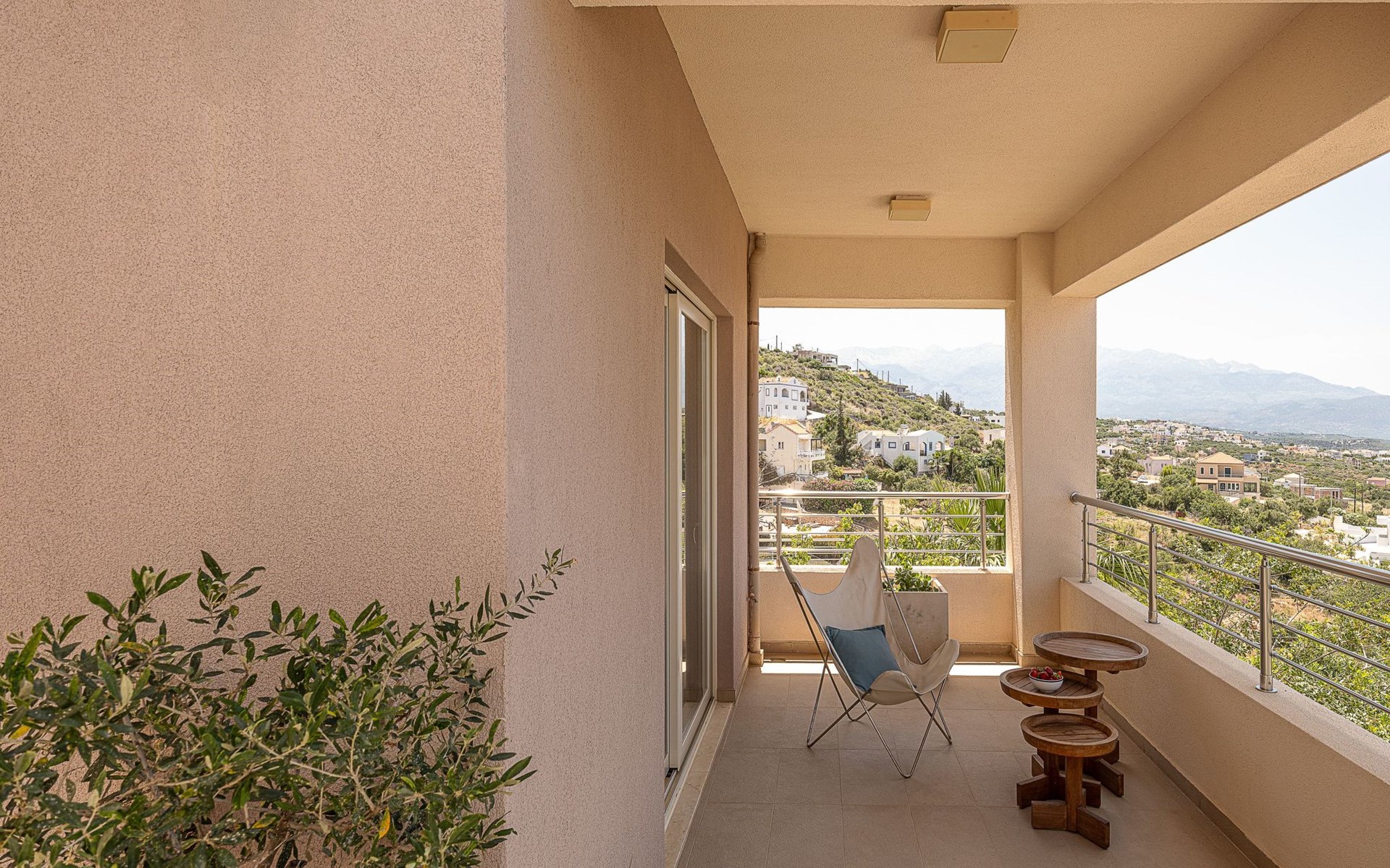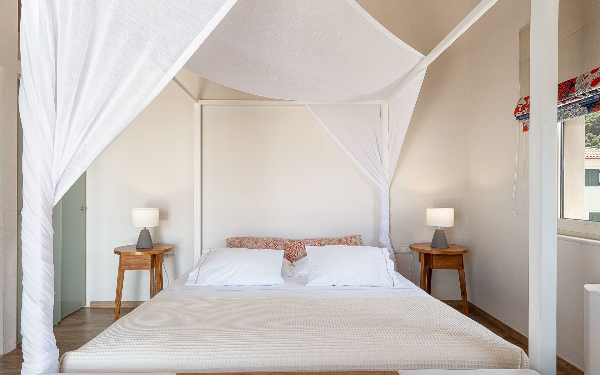 Schlafzimmer 2: Kingsize-Bett (1,80×2,00) mit Himmelbett, en-suite Badezimmer mit Badewanne, 36'' LED TV, große Terrasse mit Liegestühlen, Sofa und Panoramablick