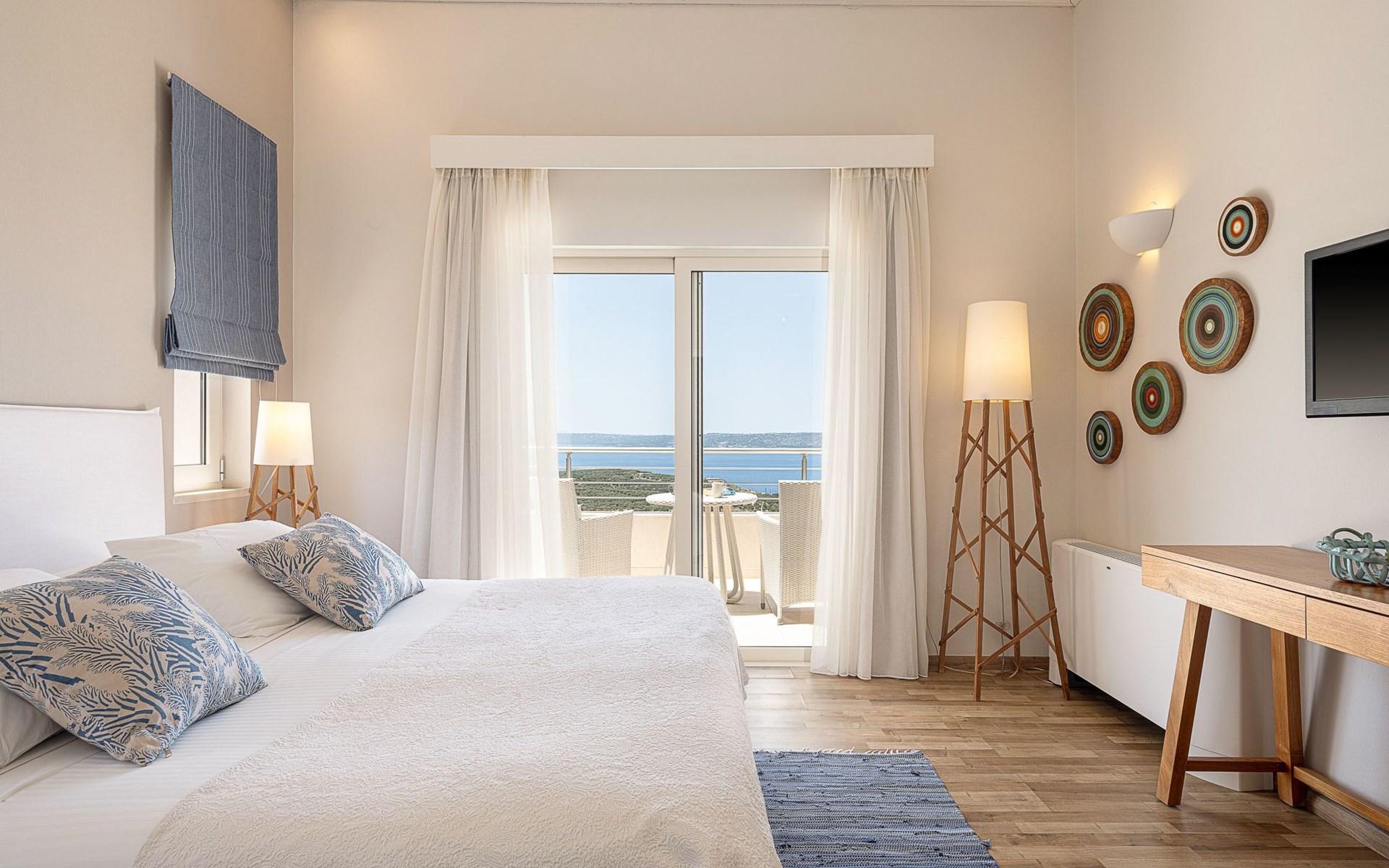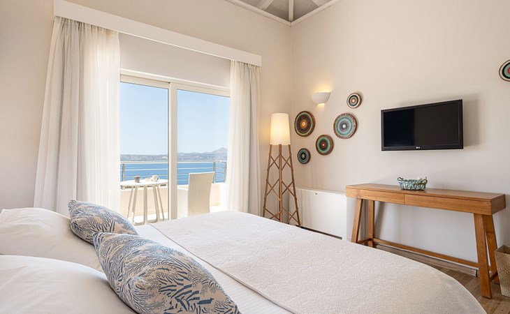 Schlafzimmer 1: Kingsize-Bett (1,80×2,00), en-suite Badezimmer mit Hydromassage-Dusche, 36" LED TV, privater Balkon mit Meer- und Gartenblick