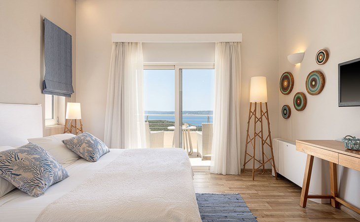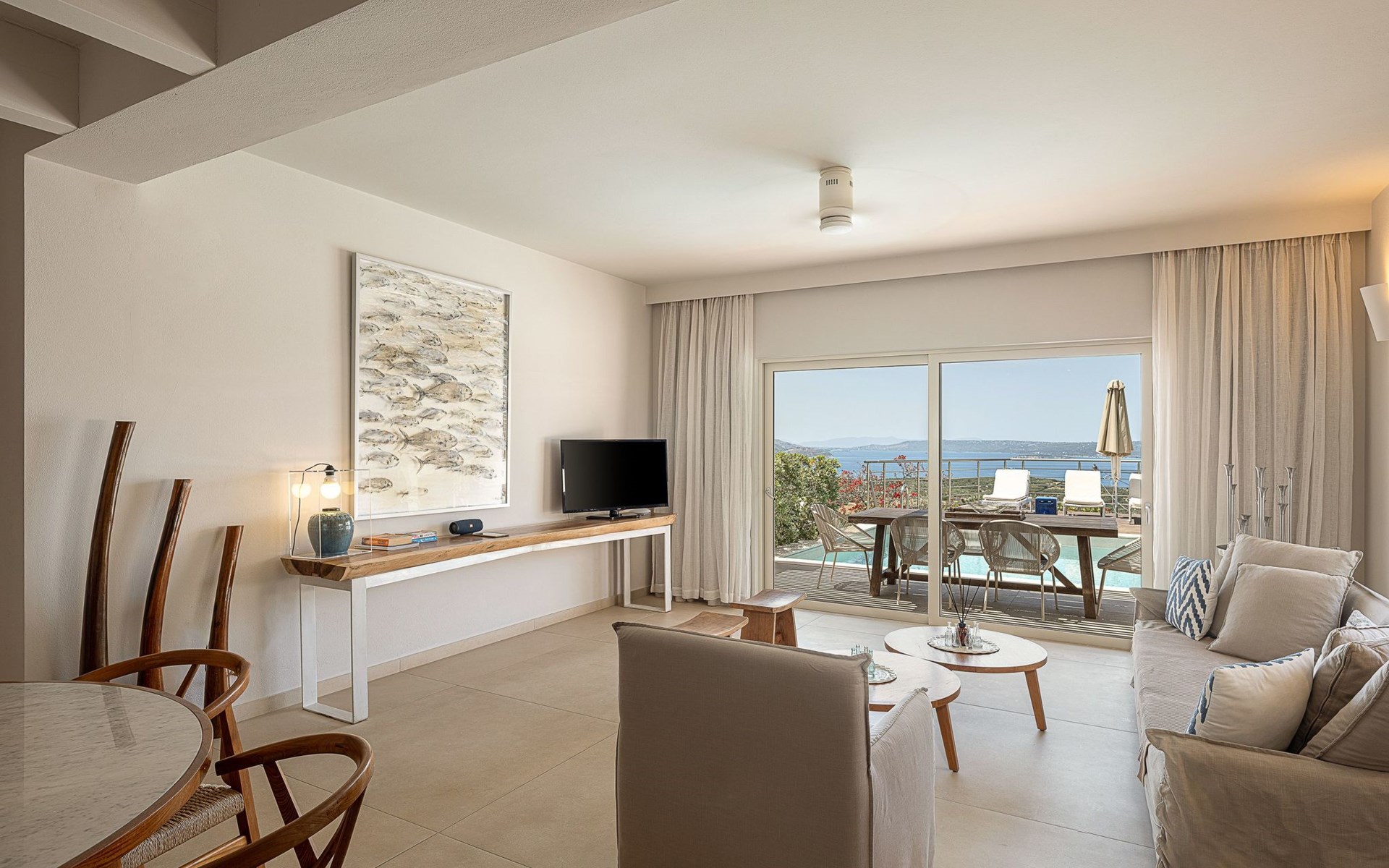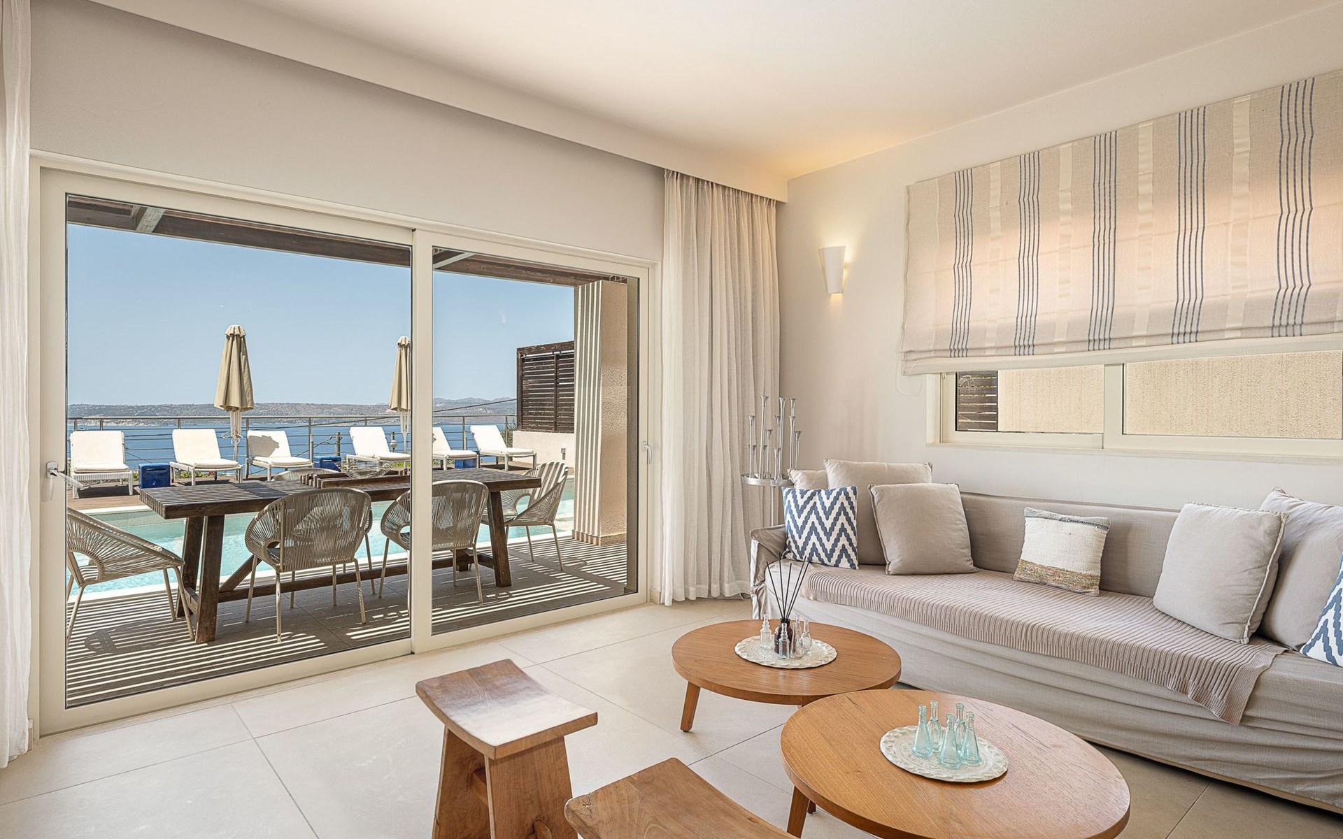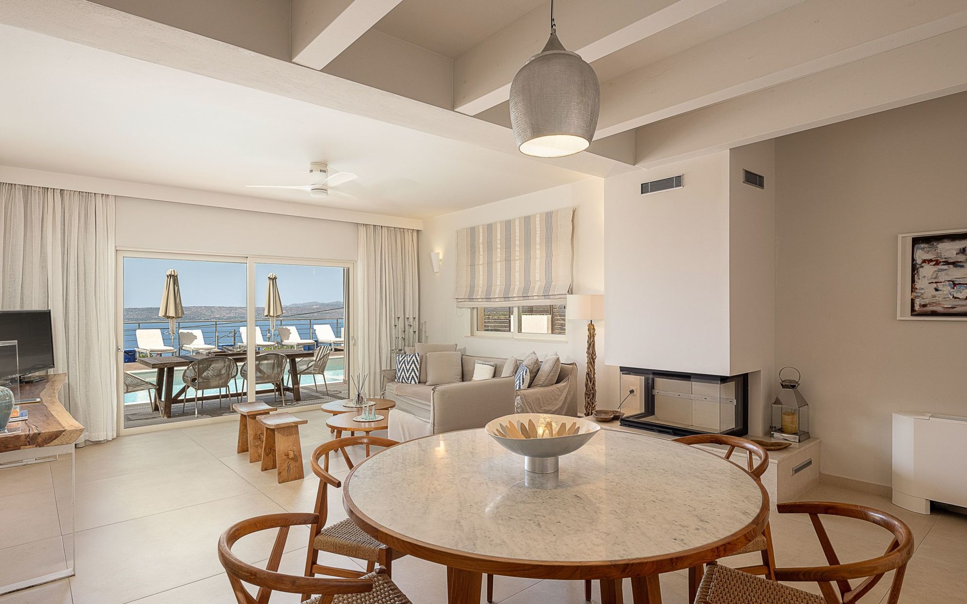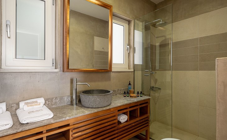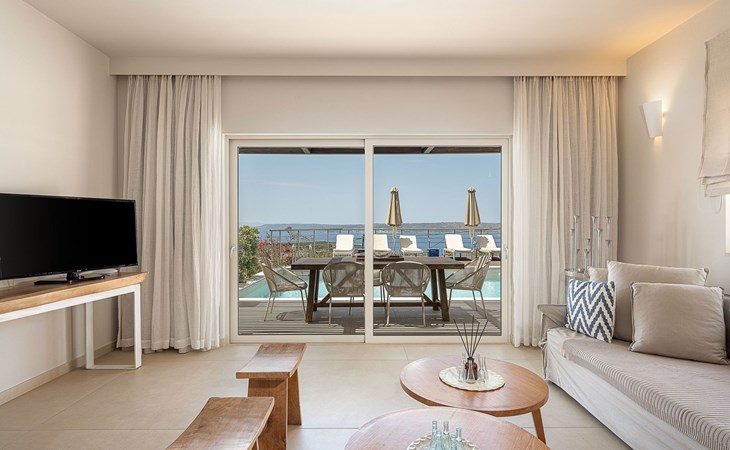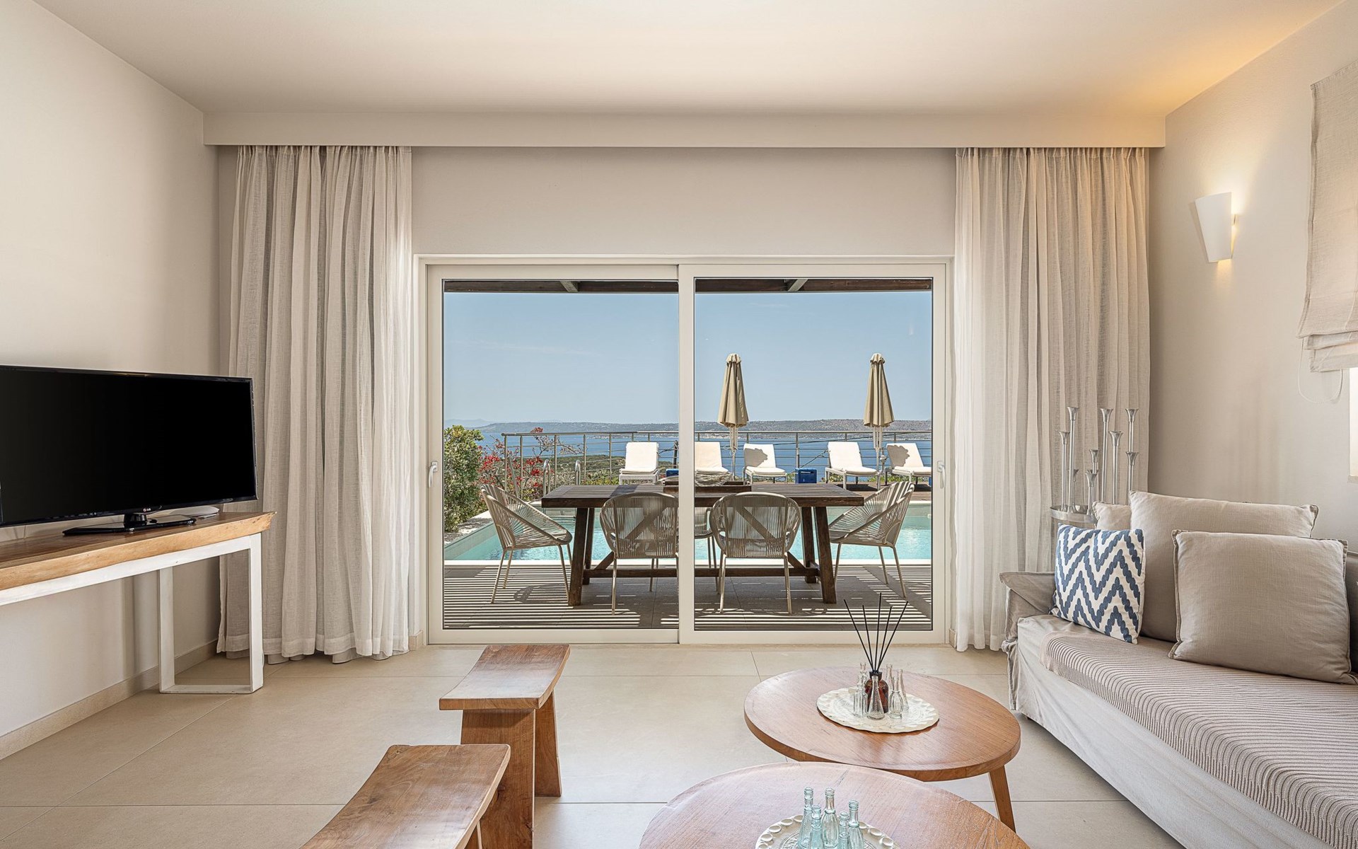Adeste Seaview Villa l ist eine zweistöckige Villa mit drei Schlafzimmern, von denen sich zwei im Obergeschoss befinden, eines mit zwei Einzelbetten und Meerblick, das andere mit einem Kingsize-Himmelbett. Das dritte Schlafzimmer im Erdgeschoss hat ein Kingsize-Bett mit Meerblick. Im Erdgeschoss gibt es ein Gemeinschafts-WC und ein eigenes Bad, im Obergeschoss 2 eigene Bäder. Luxus und modernes Design vervollständigen die Szenerie aus zeitgenössischer Architektur und hochwertigen Produkten. Wenn Sie die Villa im Erdgeschoss betreten, finden Sie einen geräumigen, offenen Bereich mit einer voll ausgestatteten, modernen Küche, die mit Markengeräten und -einrichtungen ausgestattet ist, die das Kochen im Urlaub zu einem angenehmen Erlebnis machen. Der Bereich wird durch ein Esszimmer und ein Wohnzimmer mit einem 42'' LED-Satellitenfernseher vervollständigt. Die großen Fenster schaffen die Illusion von Transparenz und sorgen für einen nahtlosen Übergang zwischen dem Innen- und Außenbereich.