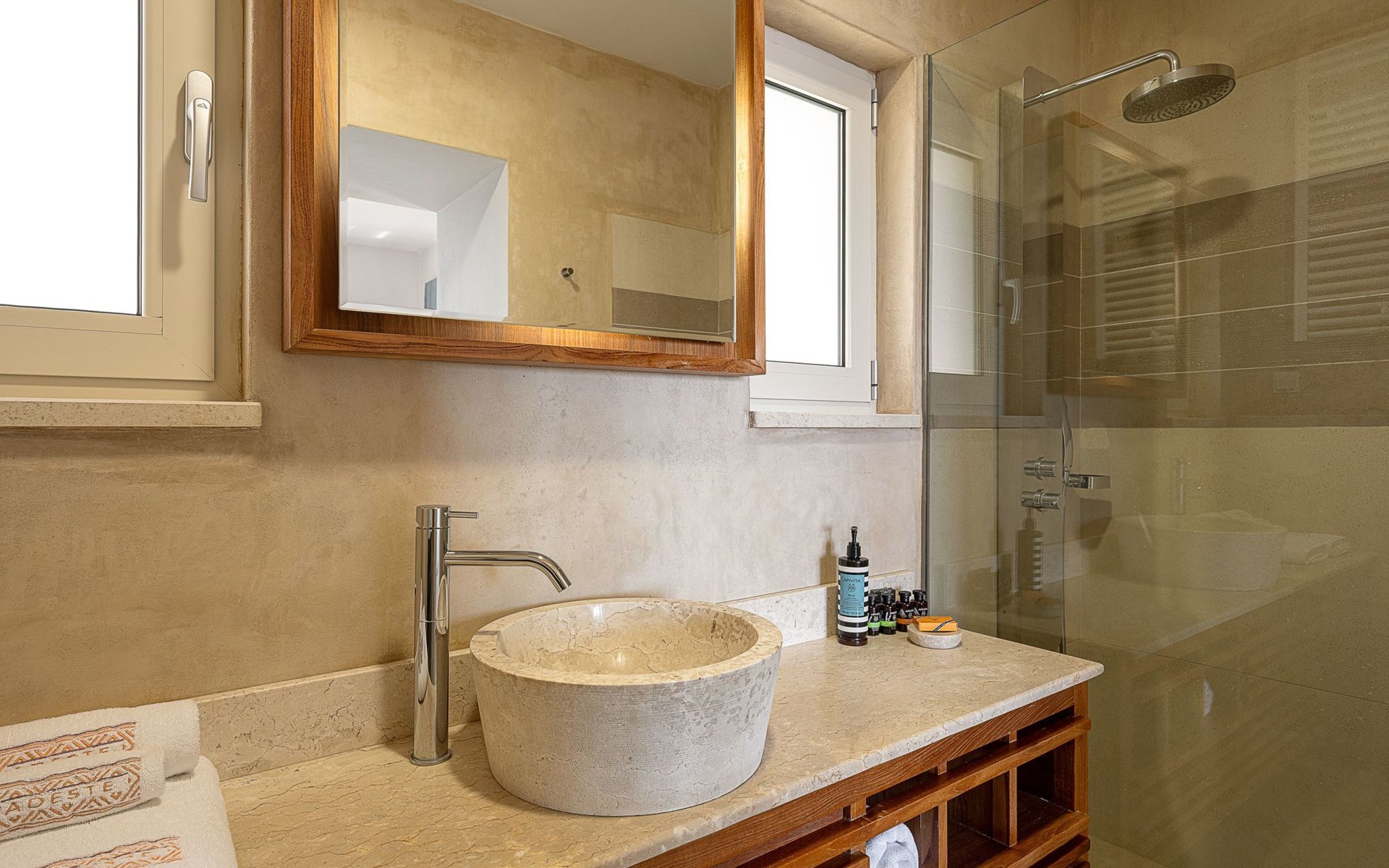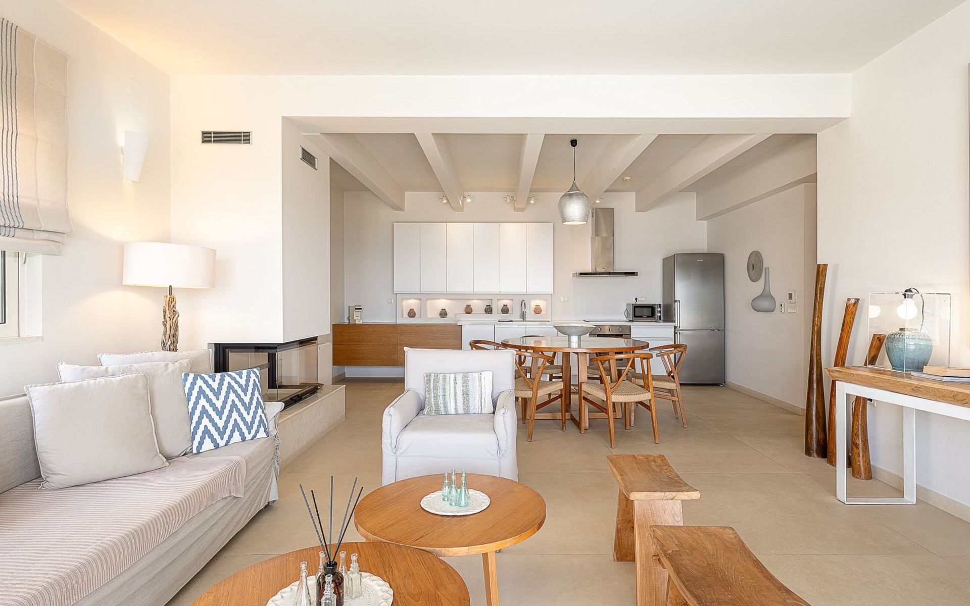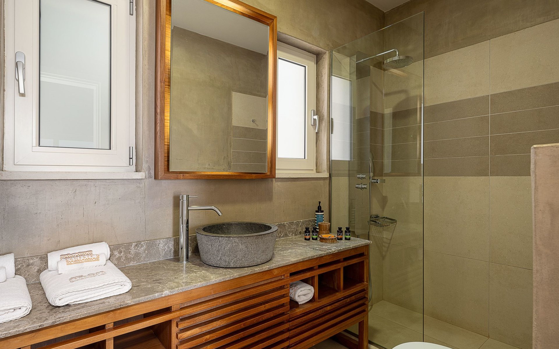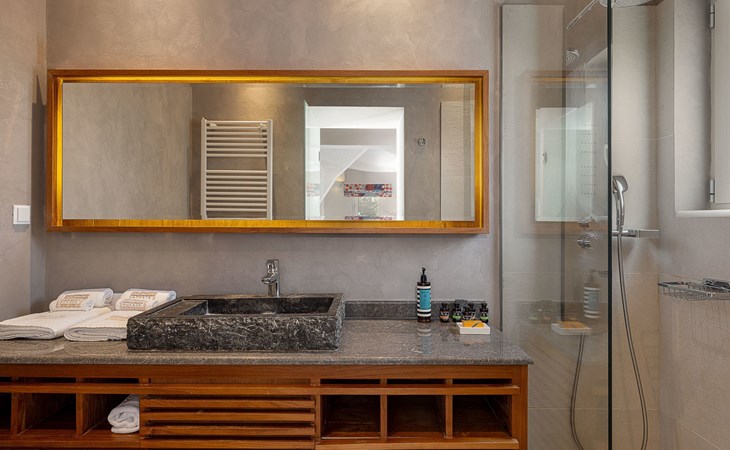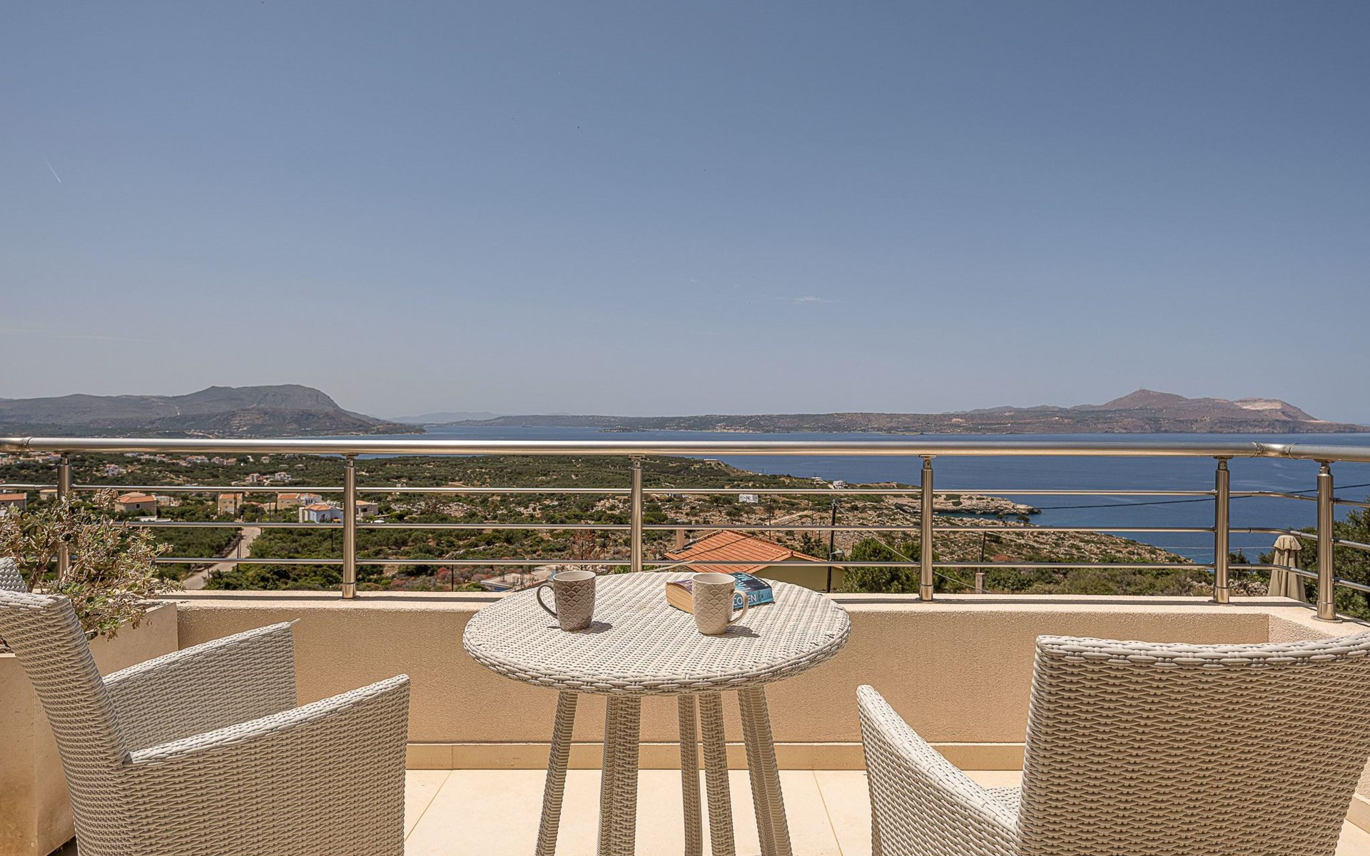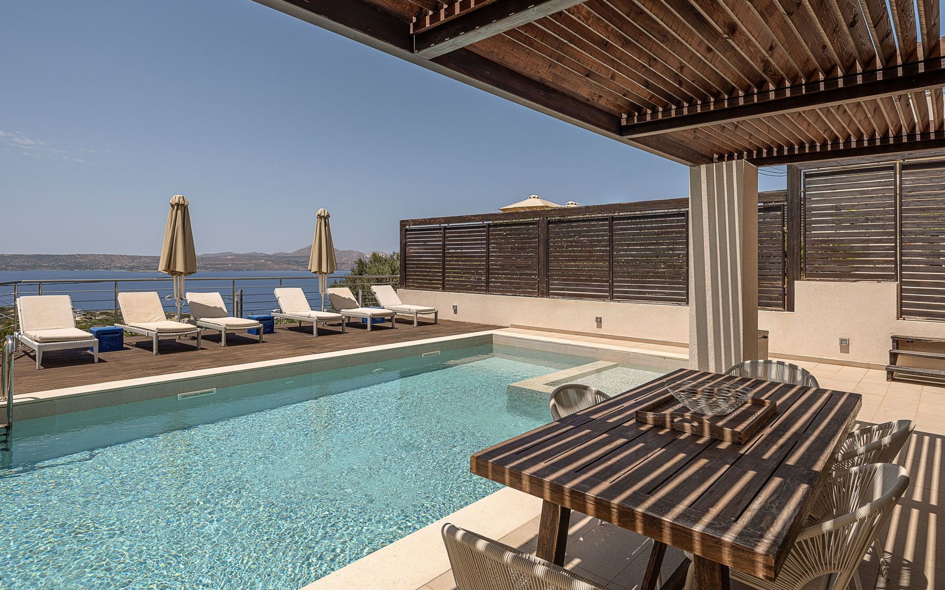 Adeste Seaview Villa l ist eine zweistöckige Villa mit drei Schlafzimmern, von denen sich zwei im Obergeschoss befinden, eines mit zwei Einzelbetten und Meerblick, das andere mit einem Kingsize-Himmelbett. Das dritte Schlafzimmer im Erdgeschoss hat ein Kingsize-Bett mit Meerblick. Im Erdgeschoss gibt es ein Gemeinschafts-WC und ein eigenes Bad, im Obergeschoss 2 eigene Bäder. Luxus und modernes Design vervollständigen die Szenerie aus zeitgenössischer Architektur und hochwertigen Produkten. Wenn Sie die Villa im Erdgeschoss betreten, finden Sie einen geräumigen, offenen Bereich mit einer voll ausgestatteten, modernen Küche, die mit Markengeräten und -einrichtungen ausgestattet ist, die das Kochen im Urlaub zu einem angenehmen Erlebnis machen. Der Bereich wird durch ein Esszimmer und ein Wohnzimmer mit einem 42'' LED-Satellitenfernseher vervollständigt. Die großen Fenster schaffen die Illusion von Transparenz und sorgen für einen nahtlosen Übergang zwischen dem Innen- und Außenbereich.