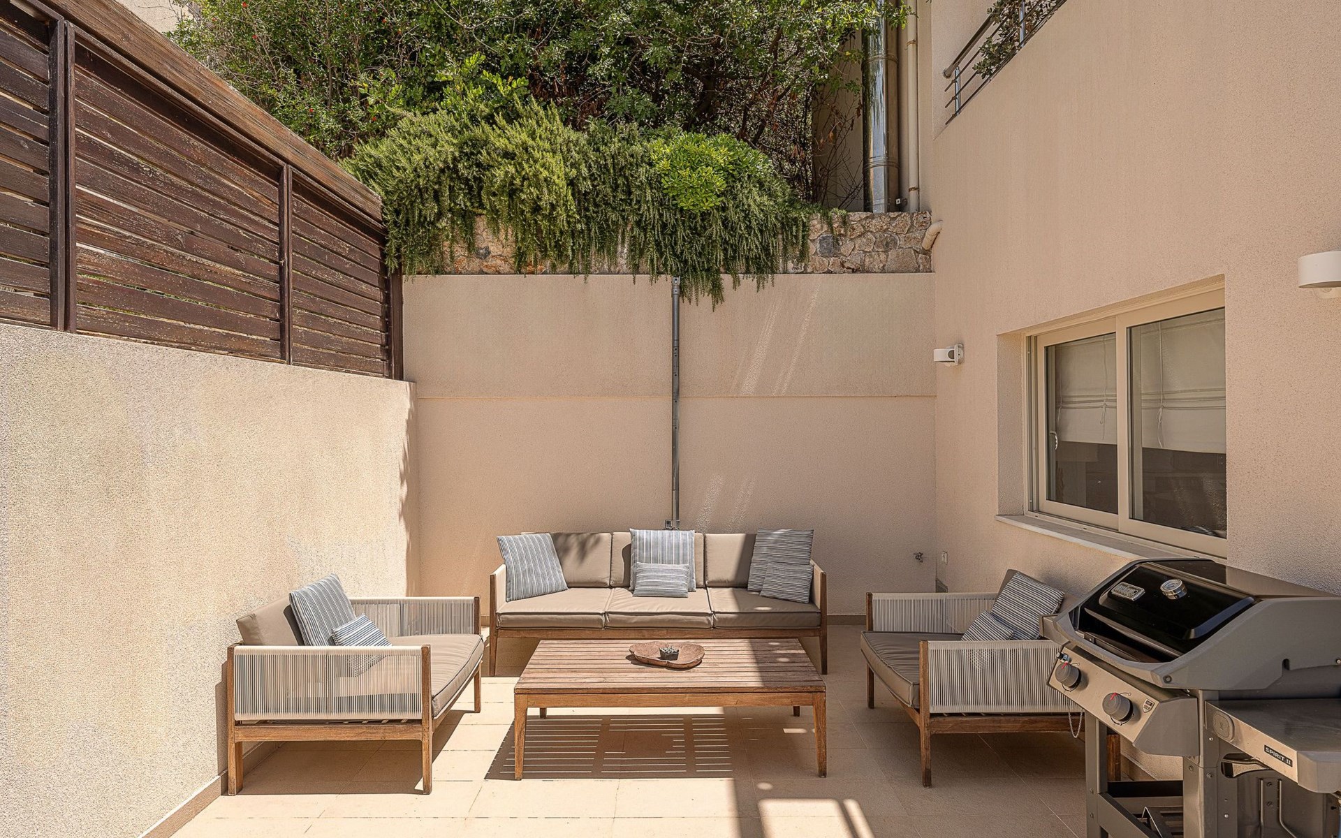 Pergola-geschützter Aufenthalts- und Essbereich