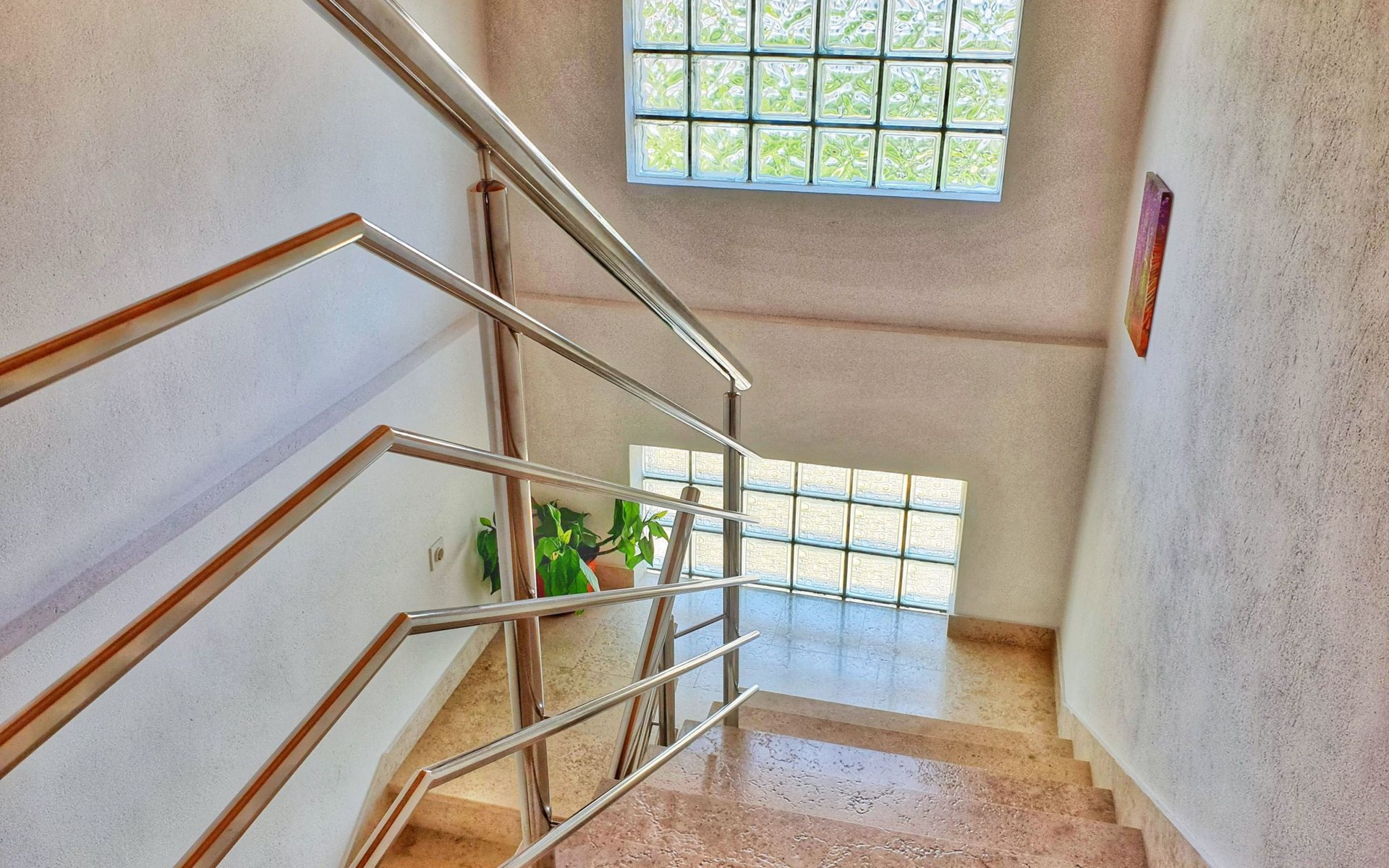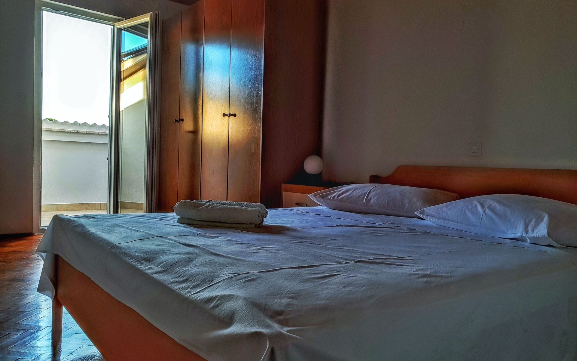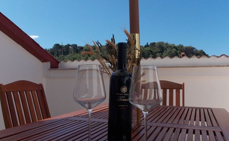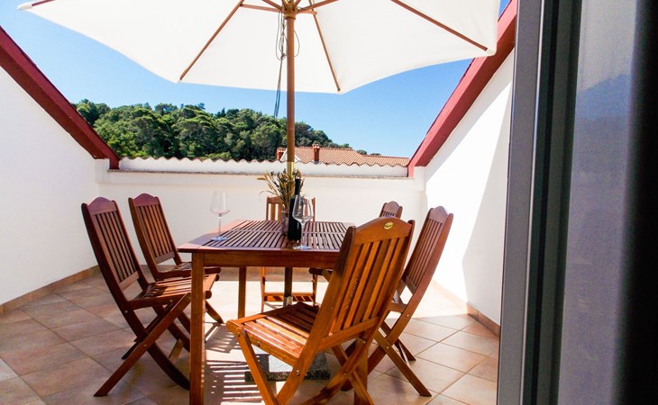 Von einem der Schlafzimmer aus führt eine Balkontür auf die private Dachterrasse, die mit einem Sonnenschirm sowie Tisch mit Stühlen eingerichtet ist.
