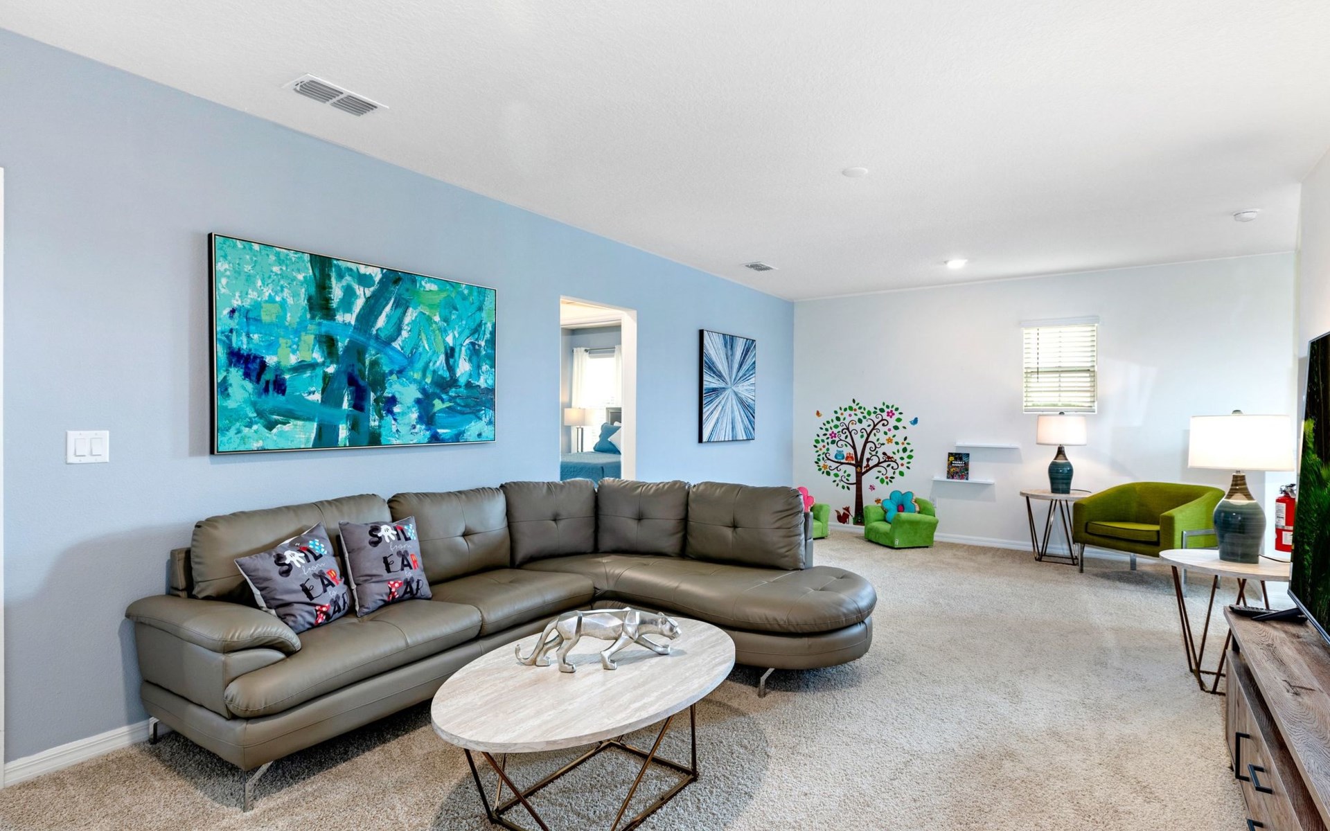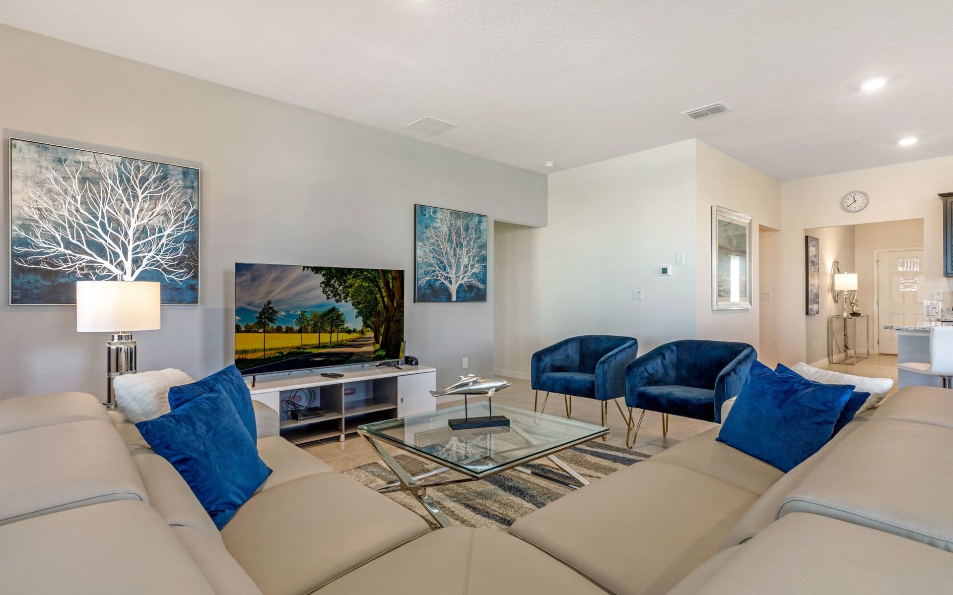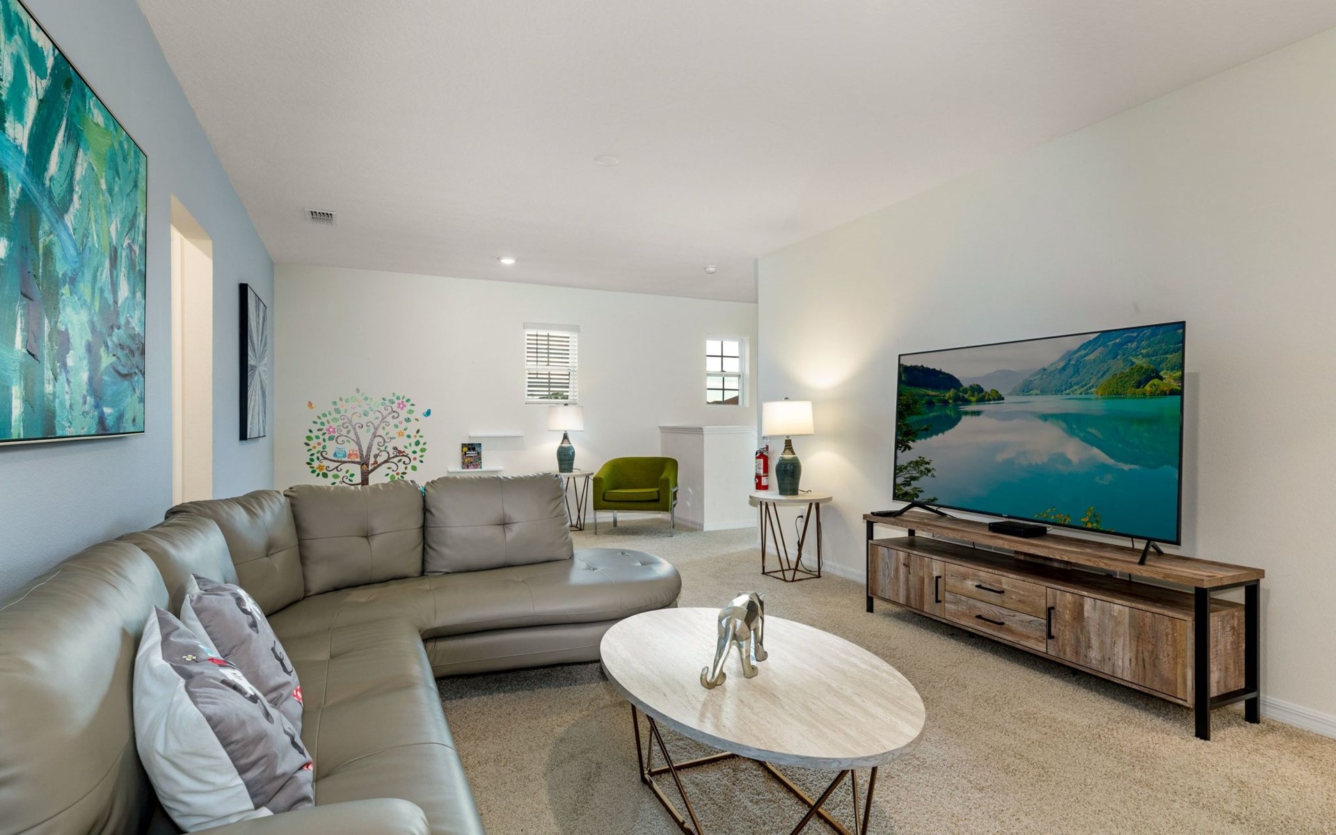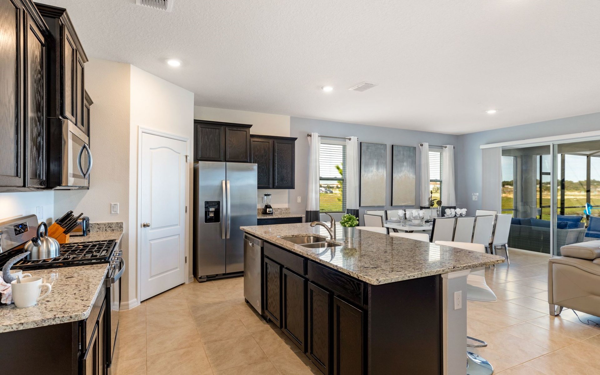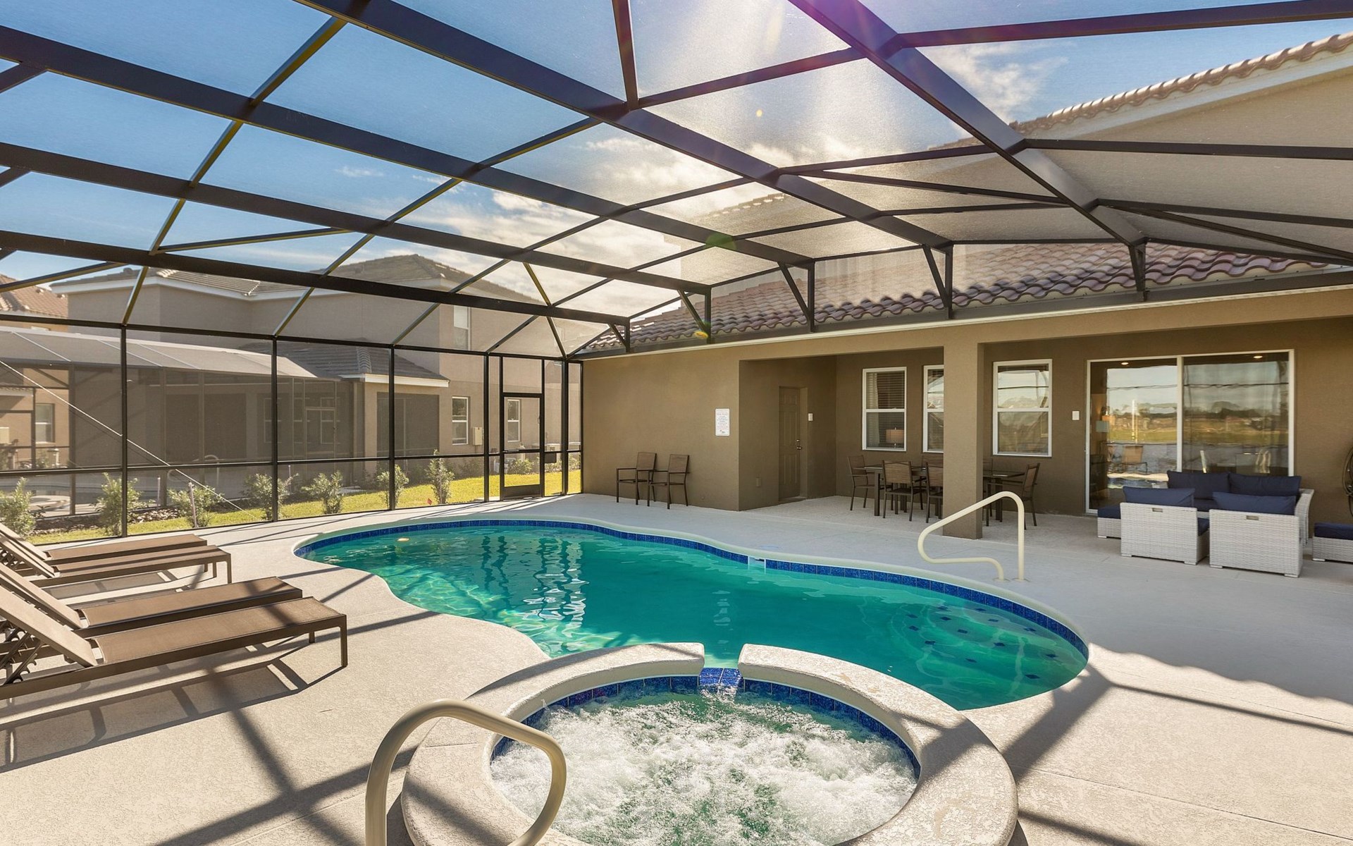 Treten Sie ein und erleben Sie eine Oase des Luxus und Komforts. Die Villa verfügt über ein modernes, offenes Design mit einem Familienbereich, in dem ein großes Ecksofa und ein Fernseher zum Entspannen einladen. Am eleganten Esstisch finden 10 Personen bequem Platz. In der geräumigen Küche, die mit modernen Geräten und einer gemütlichen Insel mit Sitzgelegenheiten ausgestattet ist, können Sie Gourmet-Mahlzeiten zubereiten. Unterhaltung ist im Spielzimmer garantiert, das mit einem Billardtisch, Airhockey und Tischfußball ausgestattet ist und jeden Moment zu einem Vergnügen macht.