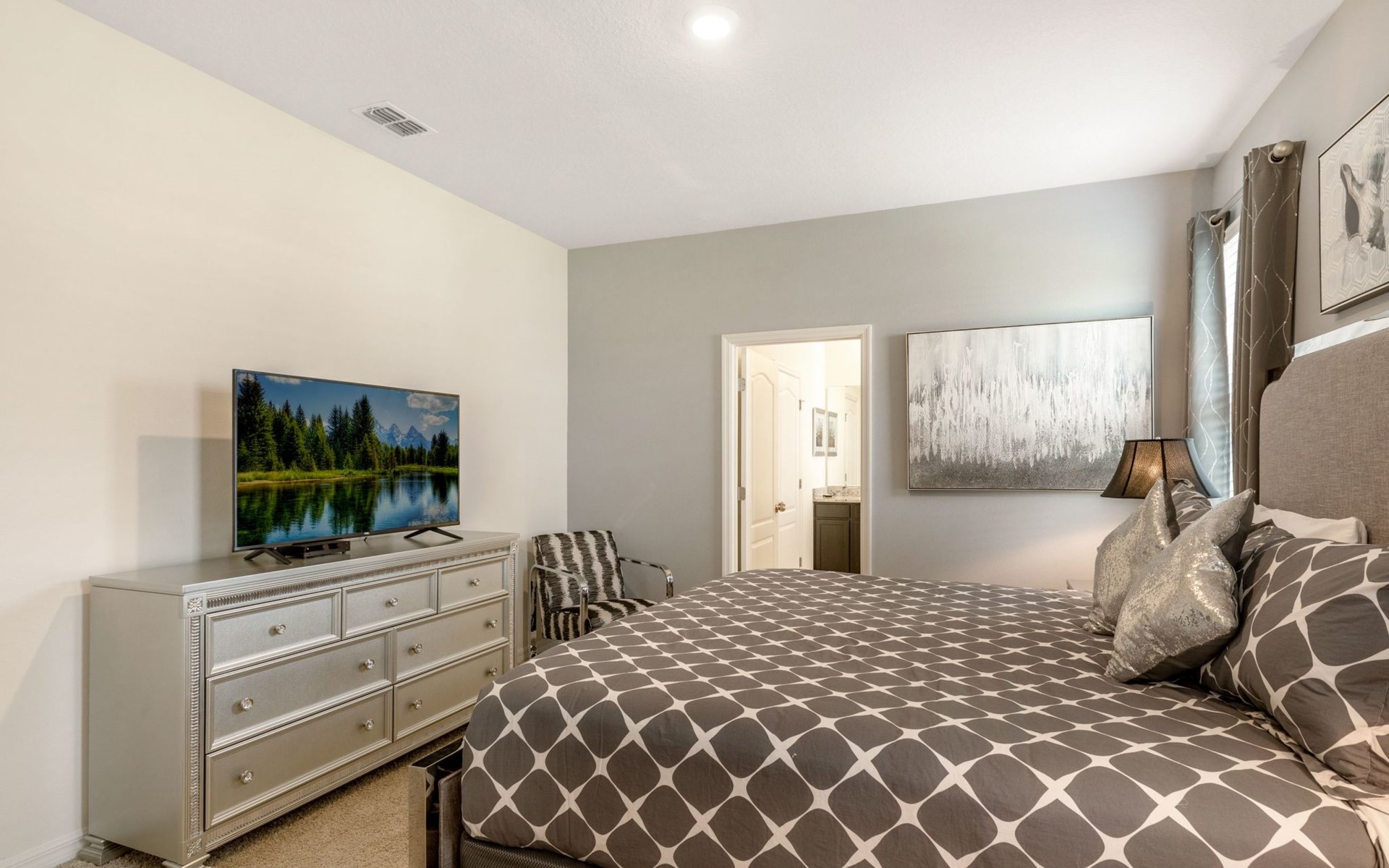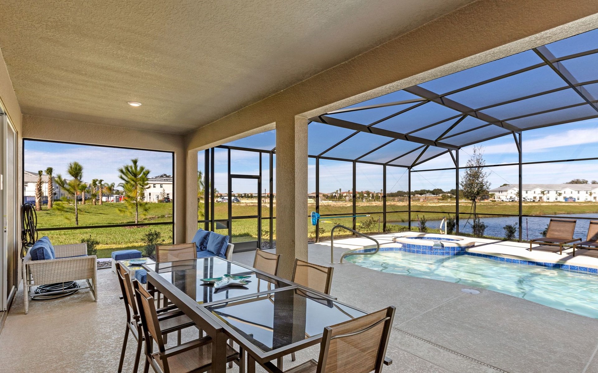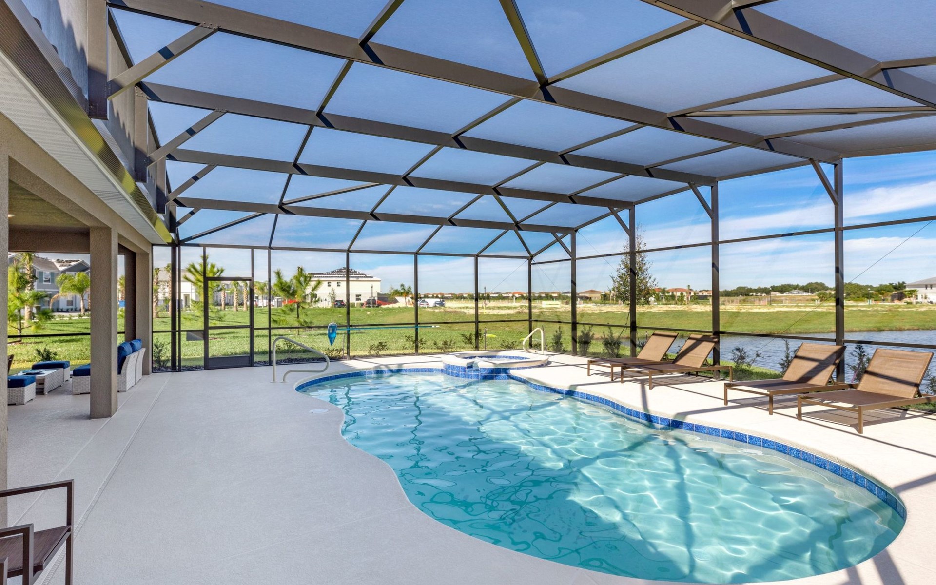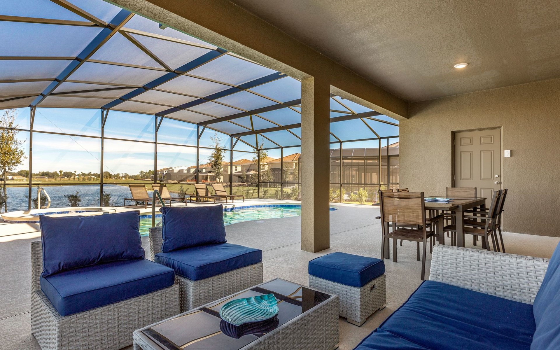 Der Außenbereich dieses Anwesens ist ebenso beeindruckend mit seinem 30-Fuß-Pool mit Blick auf einen atemberaubenden See, der ruhige Aussichten und friedliche Momente verspricht. Das ausgedehnte Pooldeck verfügt über luxuriöse Poolmöbel und eine überdachte Veranda mit einem Esstisch im Freien, ideal für Mahlzeiten inmitten der Natur. Ein kostenloser Grill macht das Leben im Freien noch verlockender und ermöglicht es Ihnen, köstliche Mahlzeiten im Freien zu genießen, während Sie die wunderbare Umgebung bewundern.