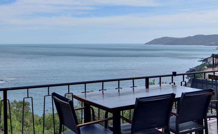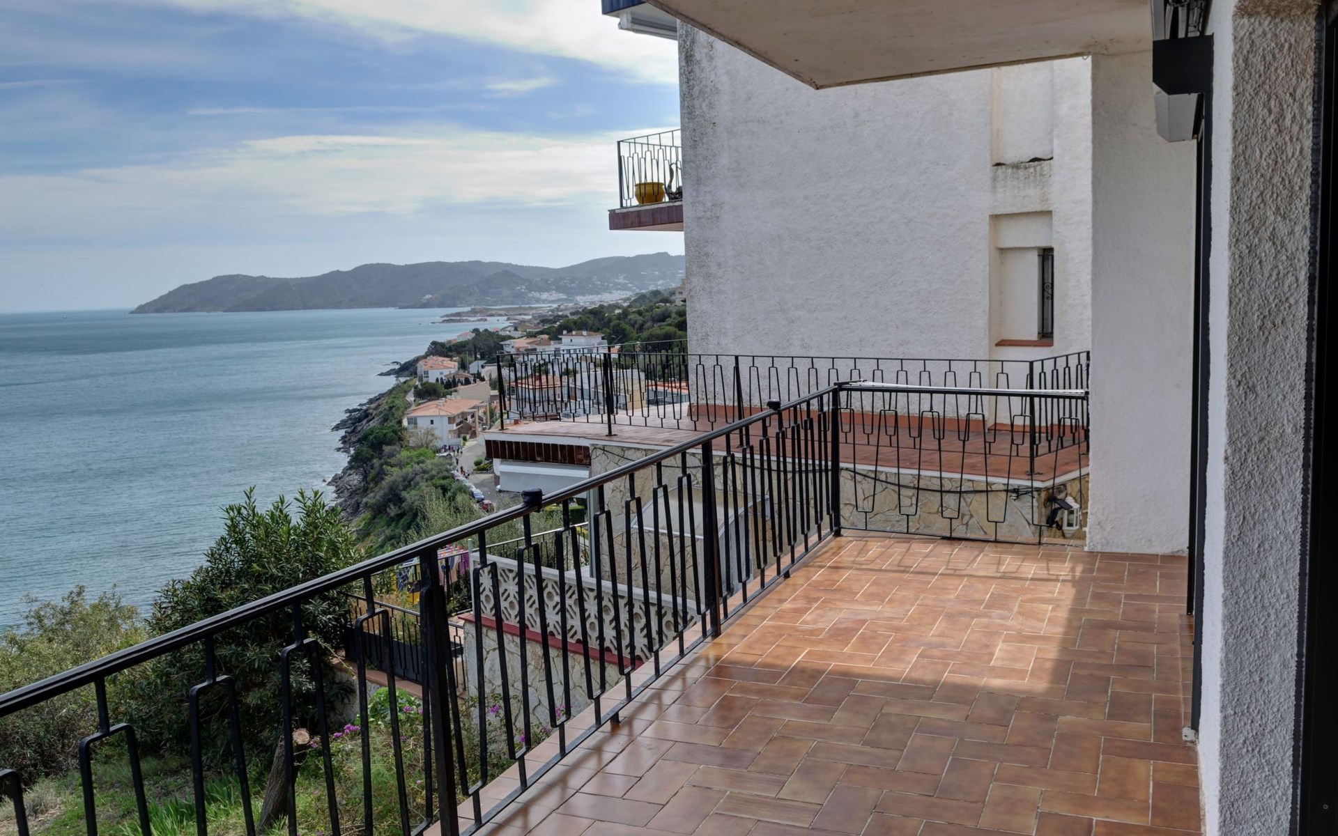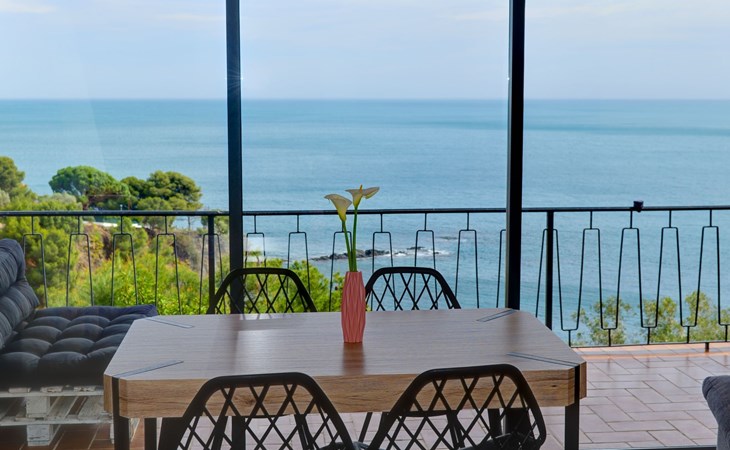 Große, mit einem Geländer umzäunte Terrasse mit privilegiertem Blick auf das Mittelmeer, mit elektrischer Markise und Tischen und Stühlen im Freien.