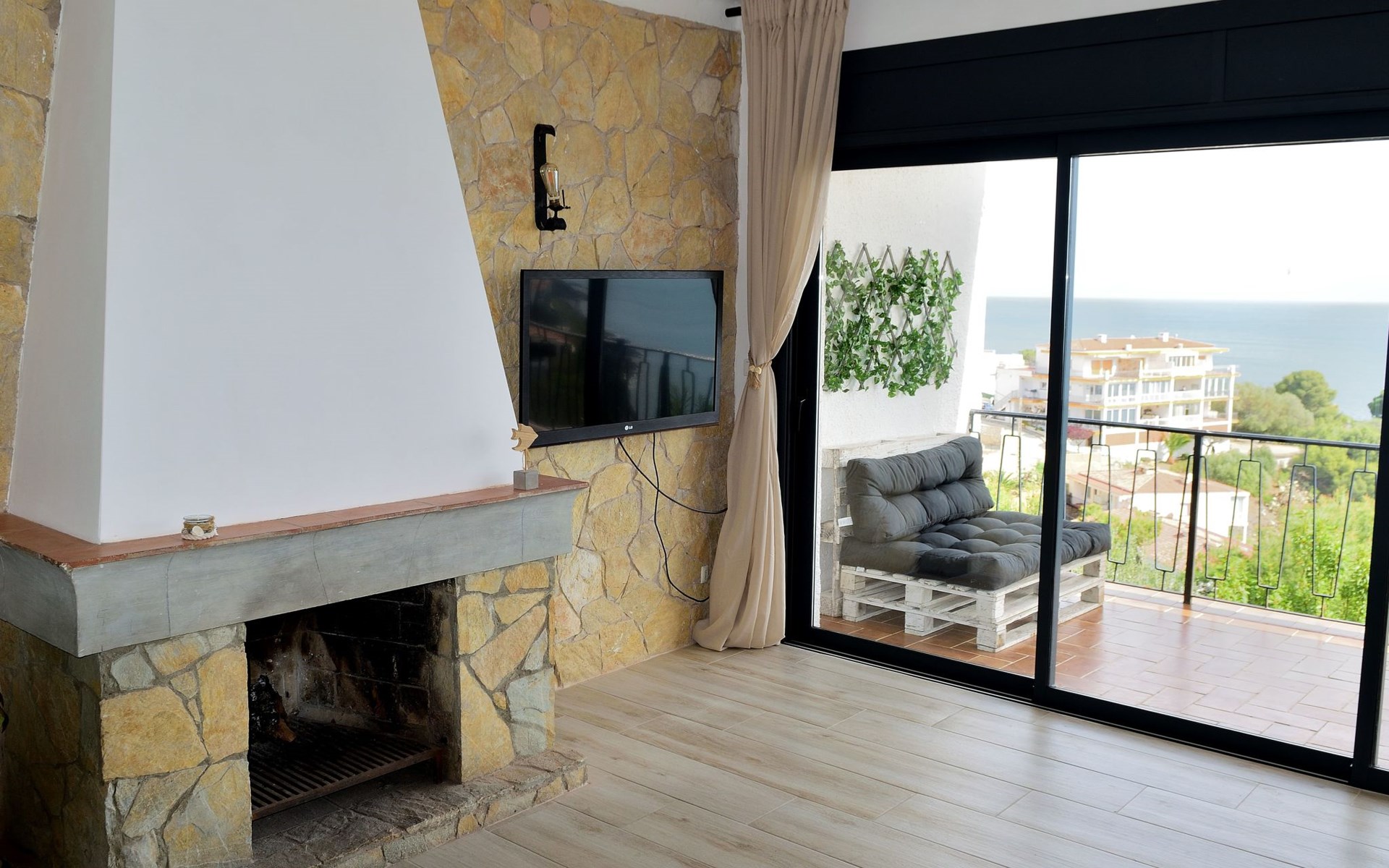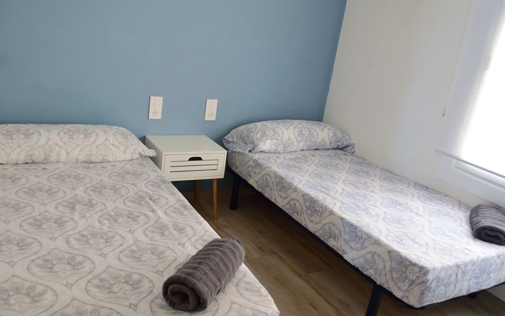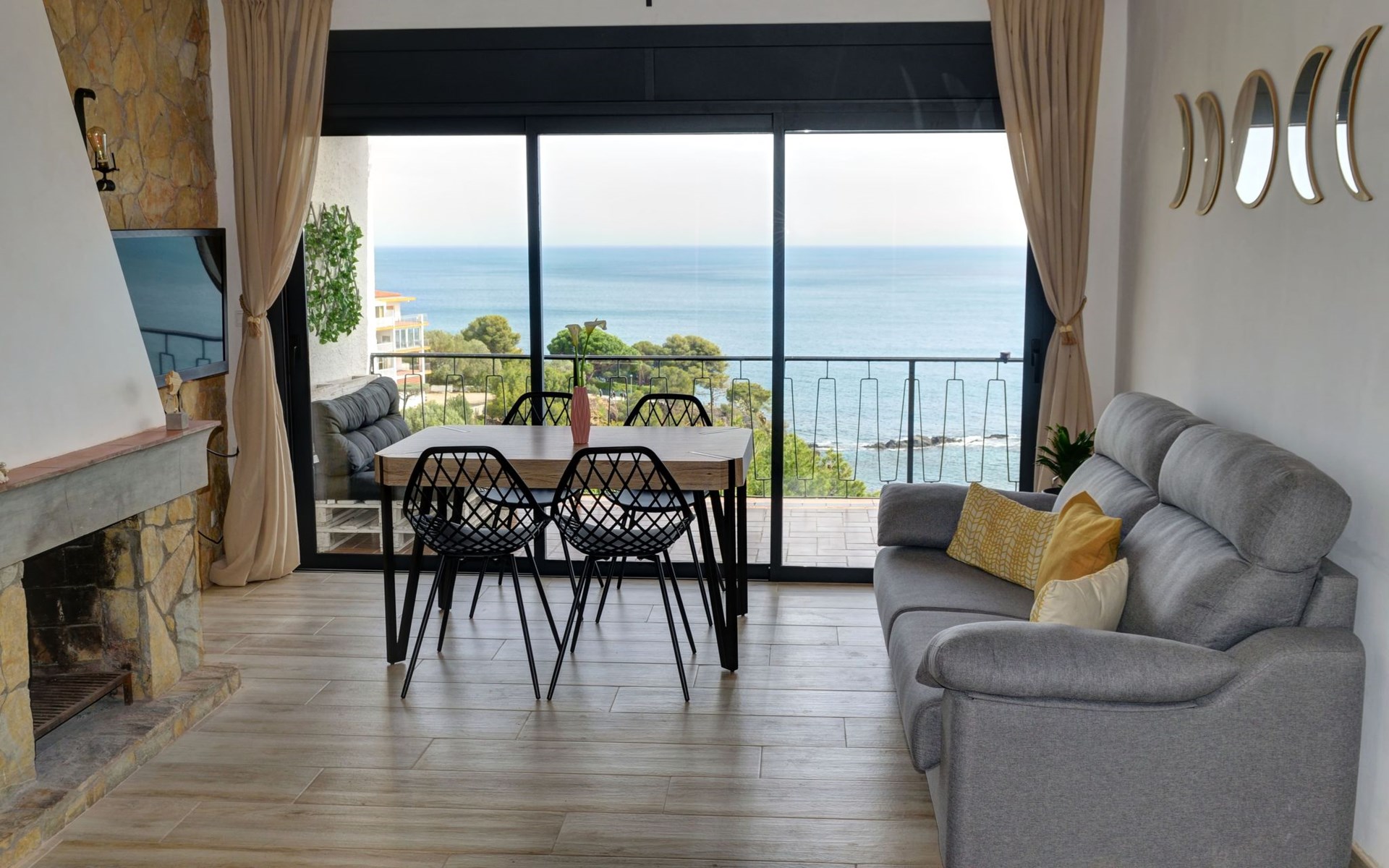 es besteht aus einer großen terrasse von 16 M2 plus 65 M2 der unterkunft verteilt in 2 schlafzimmer, eines mit doppelbett von 1,50 mit flachbildfernseher und deckenventilator, ein weiteres schlafzimmer mit 2 einzelbetten von 90 cm und deckenventilator, wohnzimmer mit einem schlafsofa, flachbildfernseher, voll ausgestattete küche mit backofen, mikrowelle, geschirrspüler, nespresso-kaffeemaschine, elektrischer kocher, toaster, induktionskochfeld, kühlschrank mit gefrierfach mit einer angrenzenden galerie mit waschmaschine. Bad mit WC, extra flacher Duschwanne und Regendusche, Bettwäsche und Handtücher inklusive.