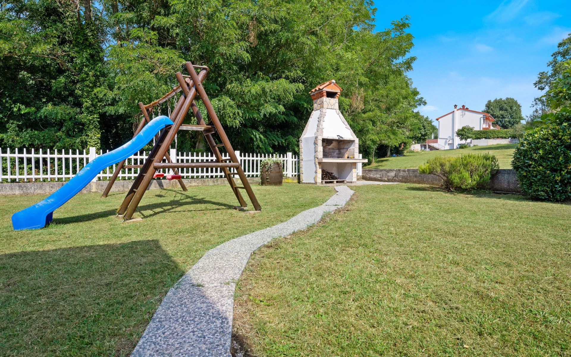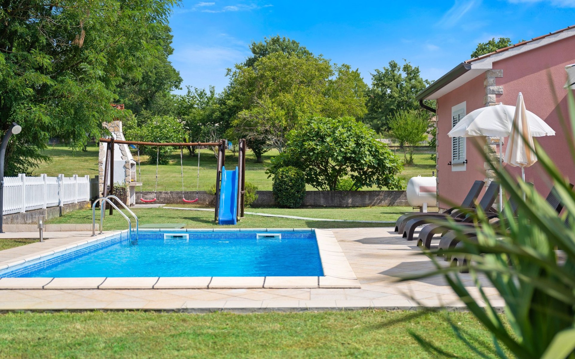 Treten Sie nach draußen in den wunderschön gestalteten Garten, der sich über 2000 m² erstreckt. Hier finden Sie einen einladenden Außenpool, Sonnenliegen und einen Grillbereich – ein perfekter Ort zum Entspannen und Genießen. Die einladende Atmosphäre des Gartens unterstreicht den Charme des gesamten Anwesens und bietet eine perfekte Kulisse für unvergessliche Momente mit Familie und Freunden.