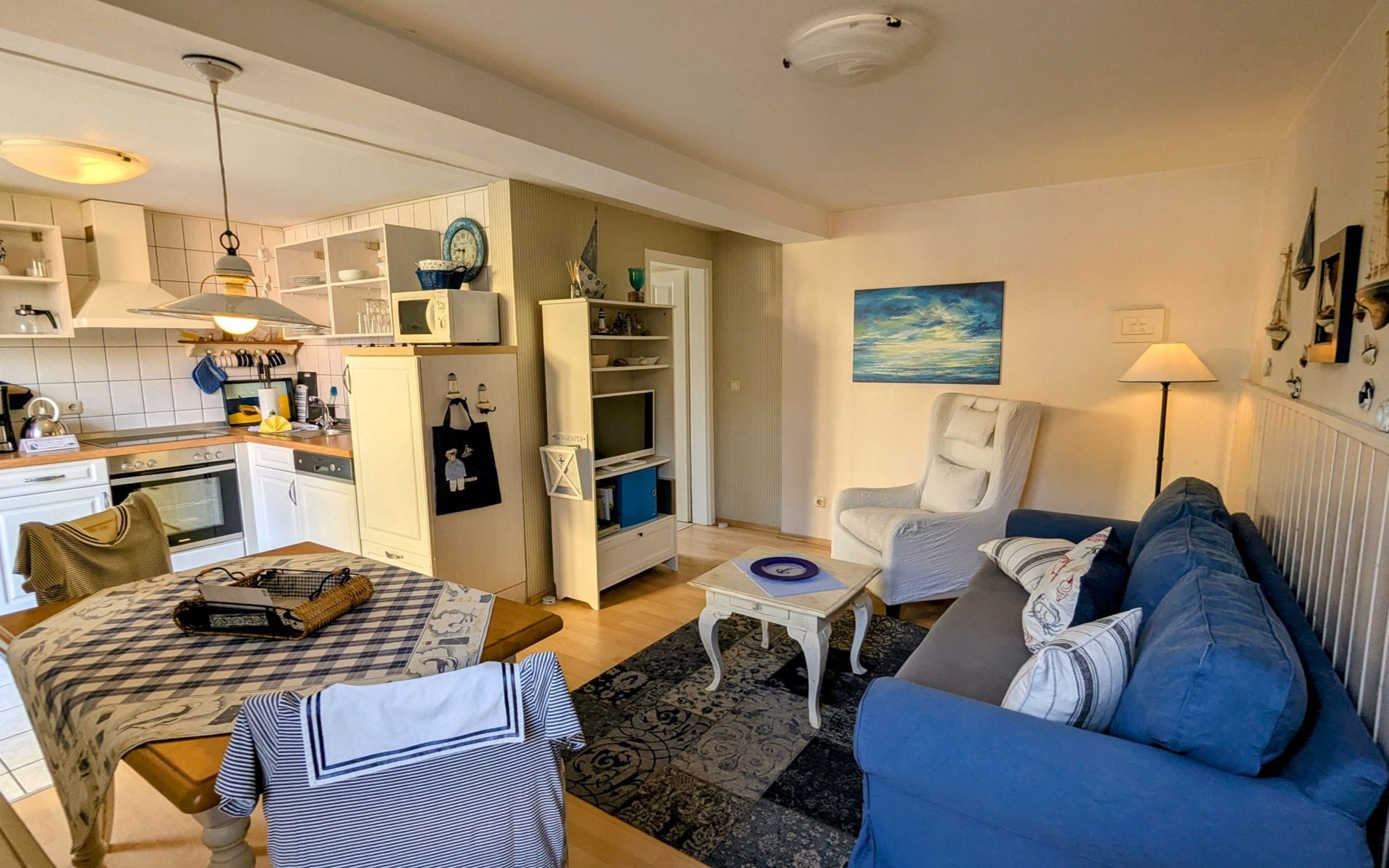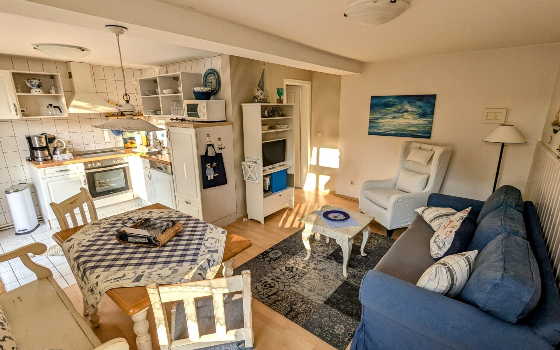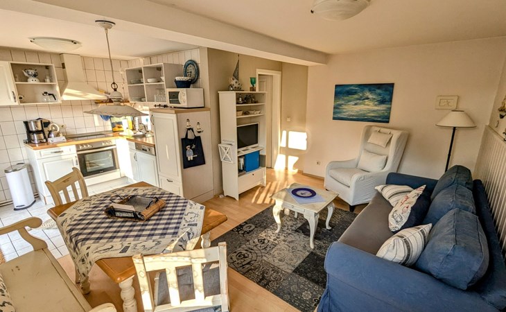 Die Wohnung verfügt über ein Schlafzimmer und einen offenen Wohn-Essbereich, beides gemütlich und liebevoll eingerichtet. Die Küche ist voll ausgestattet und das Bad ist kürzlich modernisiert worden. Die vor der Tür befindliche Terrasse lädt zum entspannten Verweilen ein.
