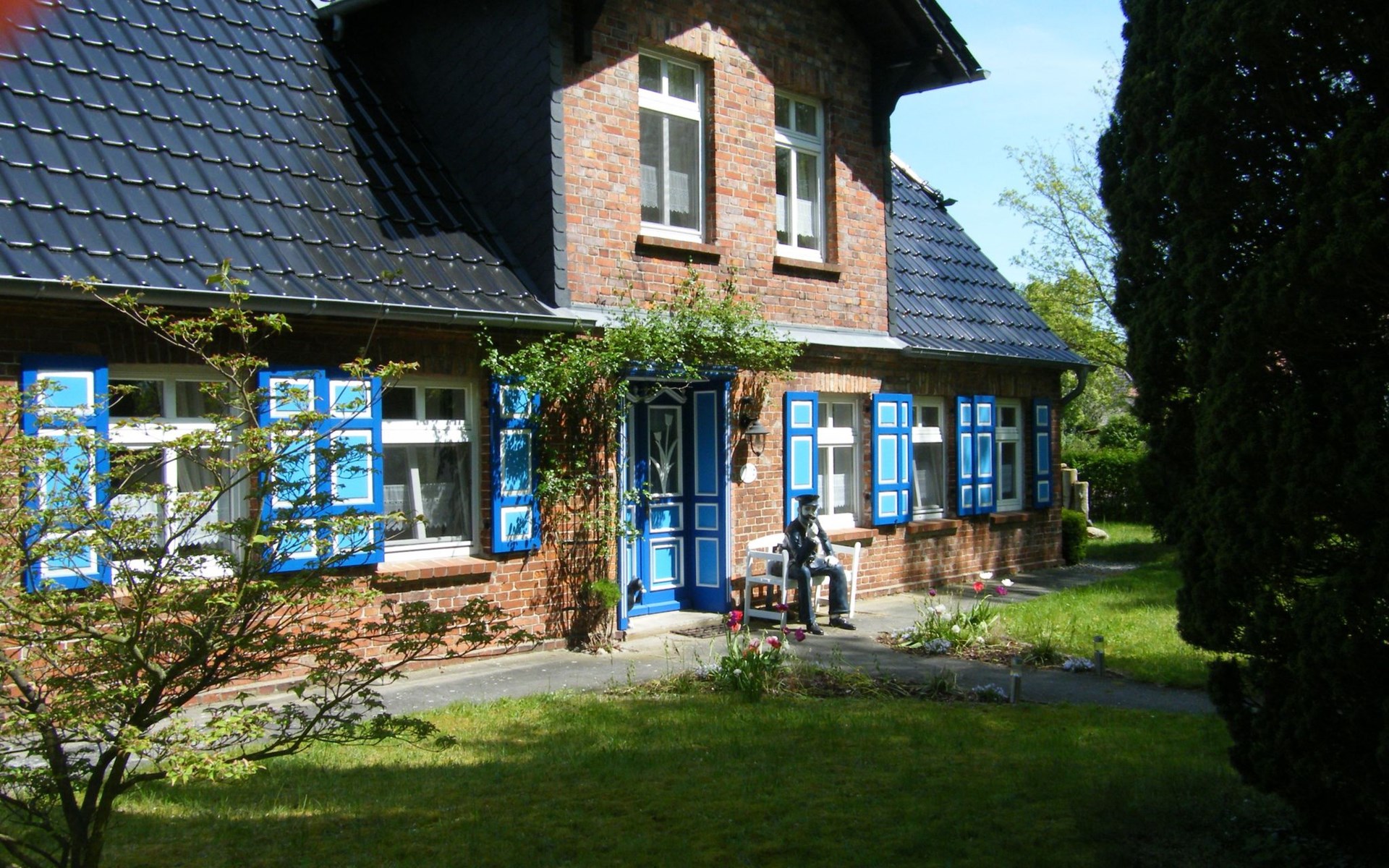 Unser Haus ist ein typisches Kapitänshaus , errichtet vermutlich so um 1900 und liegt auf einem ca. 1000 qm großen, verwunschenen Grundstück, vor dem Westwind durch große Eichen und Linden entlang