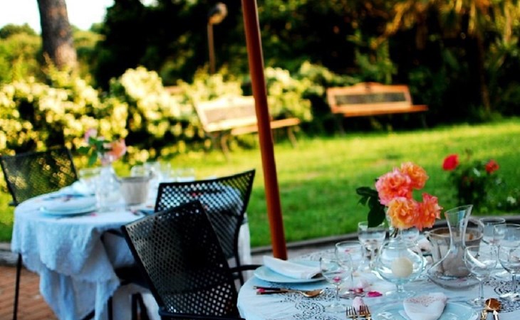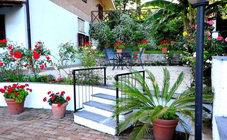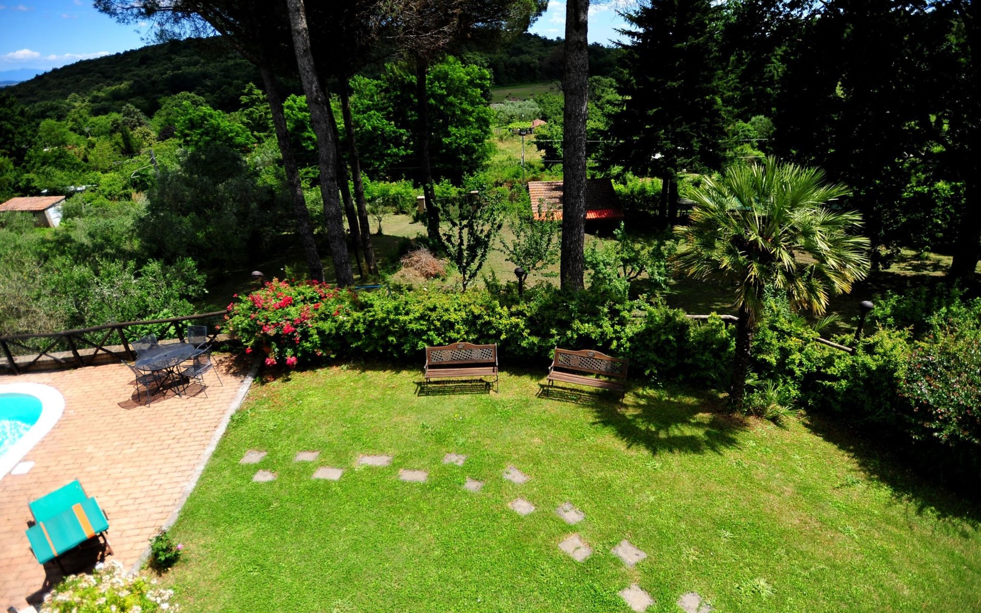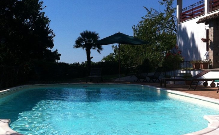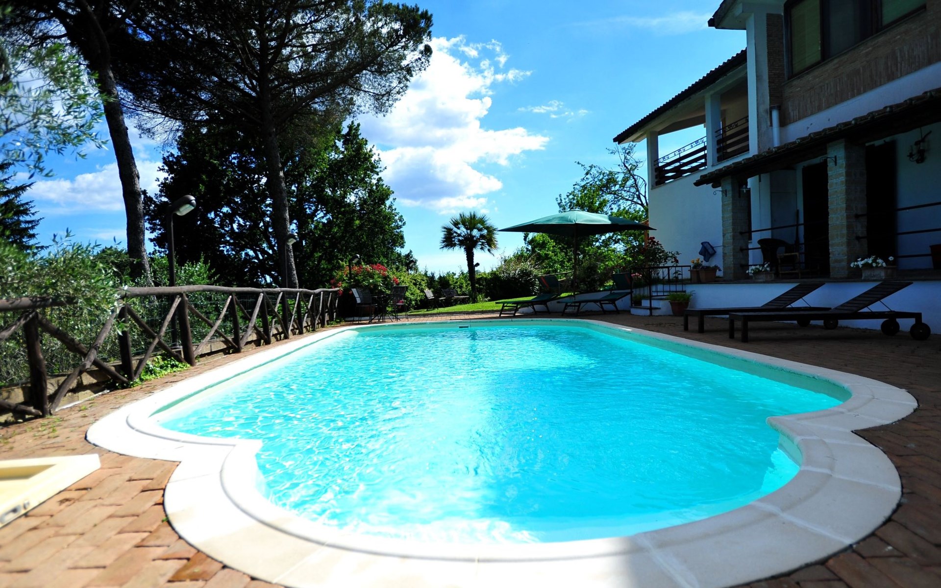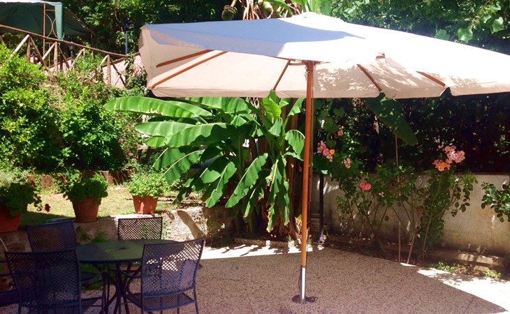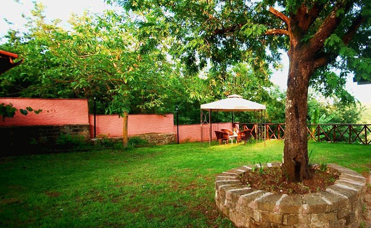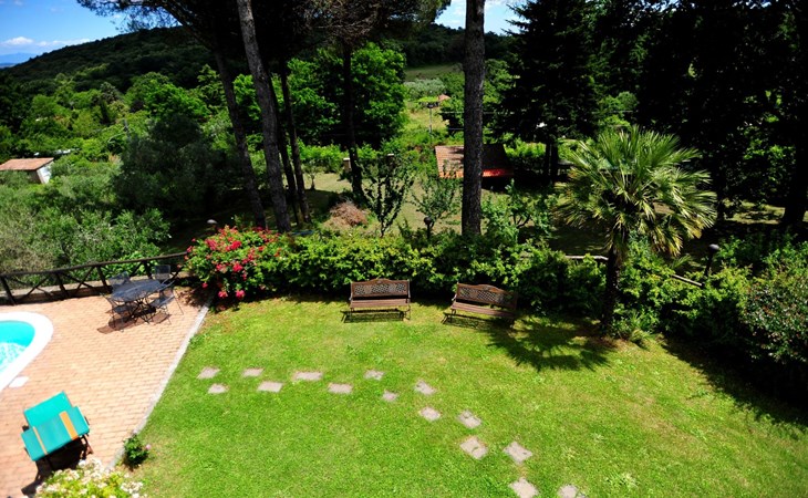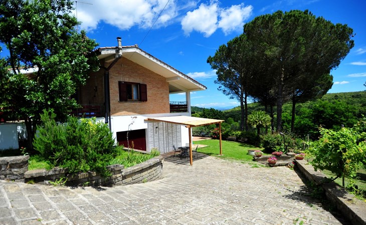 Die Villa verfügt über große Außenbereiche, Gärten, eine Panoramaterrasse, einen Pavillon, Tische und Stühle im Freien, Liegestühle und Sonnenliegen, Sonnenschirme, einen Grillplatz, einen Holzofen und einen internen Parkplatz. Zur Verfügung der Gäste steht ein privates Schwimmbad mit flachem Boden, Höhe 1,45 m, 12 x 6 m, und eine Außendusche am Pool.