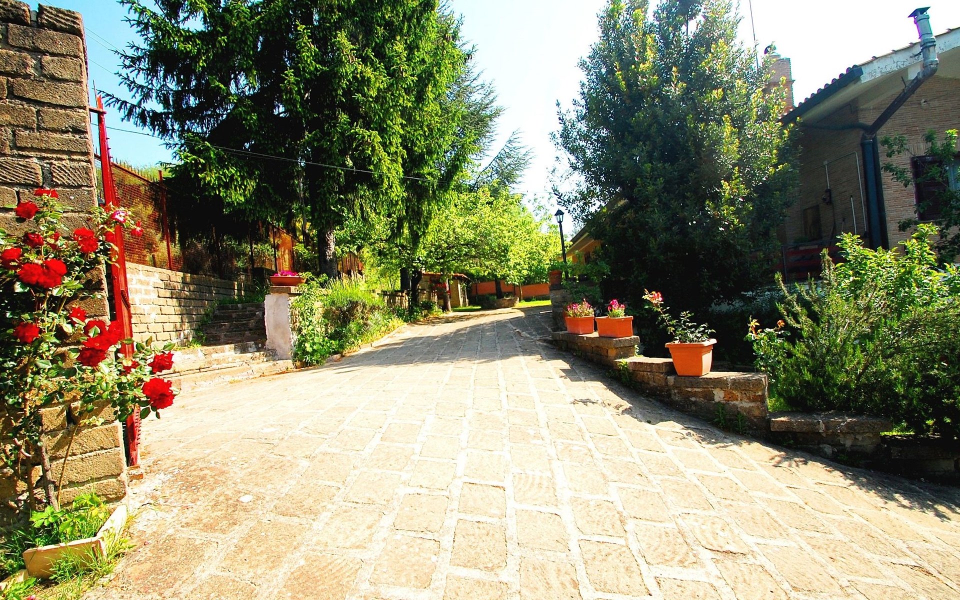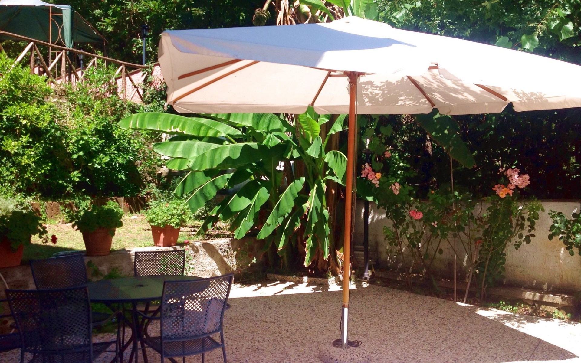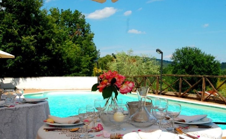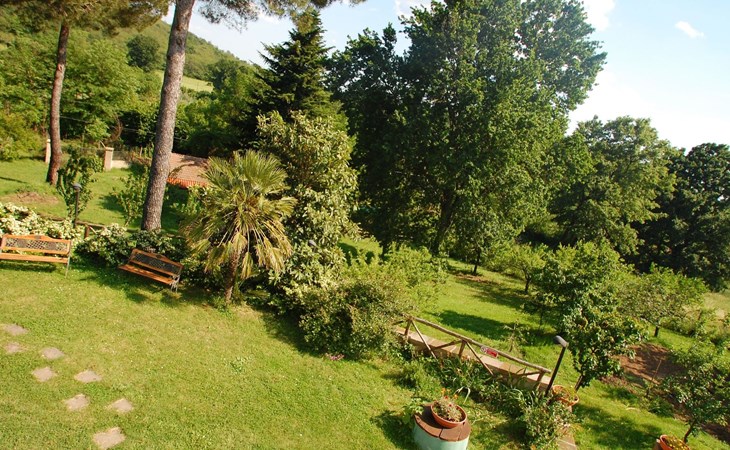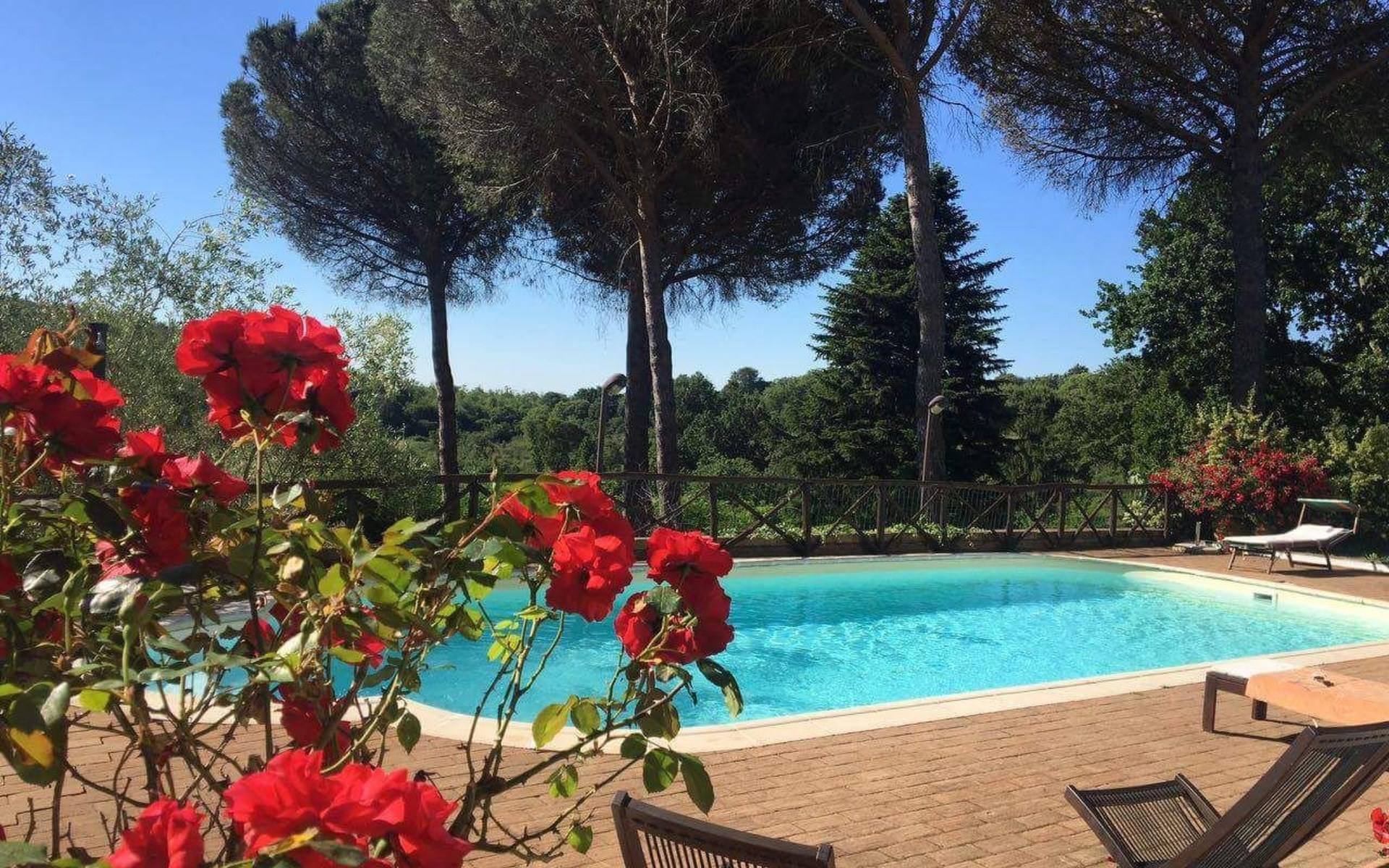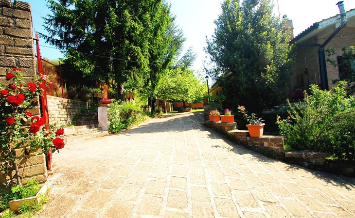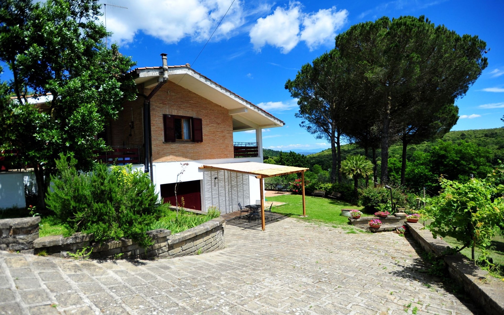 Die Villa verfügt über große Außenbereiche, Gärten, eine Panoramaterrasse, einen Pavillon, Tische und Stühle im Freien, Liegestühle und Sonnenliegen, Sonnenschirme, einen Grillplatz, einen Holzofen und einen internen Parkplatz. Zur Verfügung der Gäste steht ein privates Schwimmbad mit flachem Boden, Höhe 1,45 m, 12 x 6 m, und eine Außendusche am Pool.
