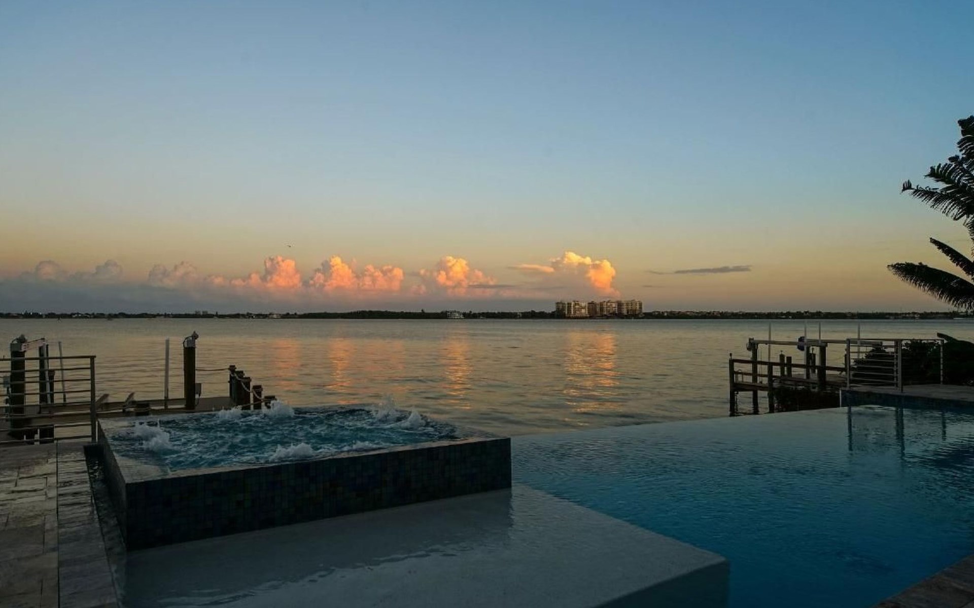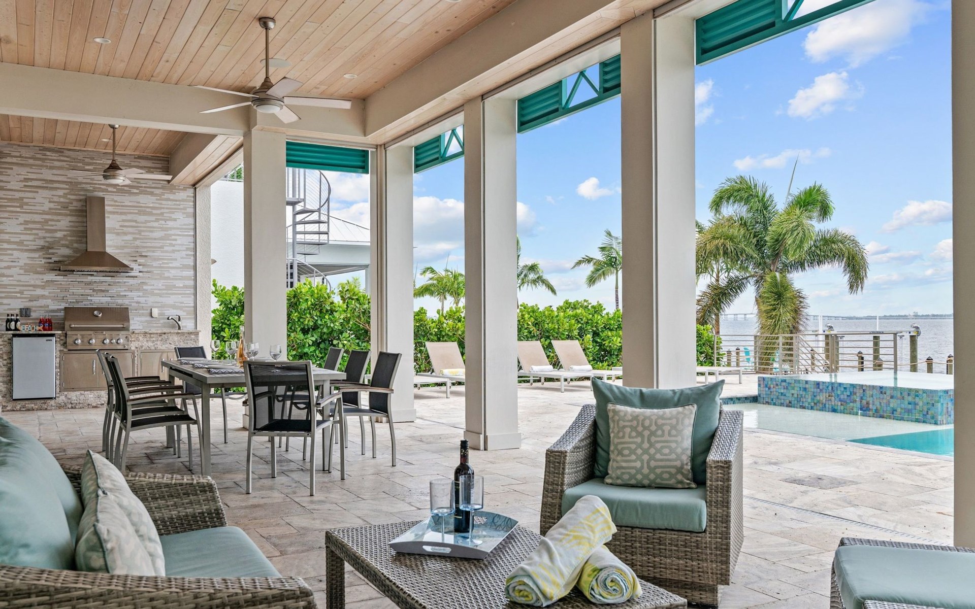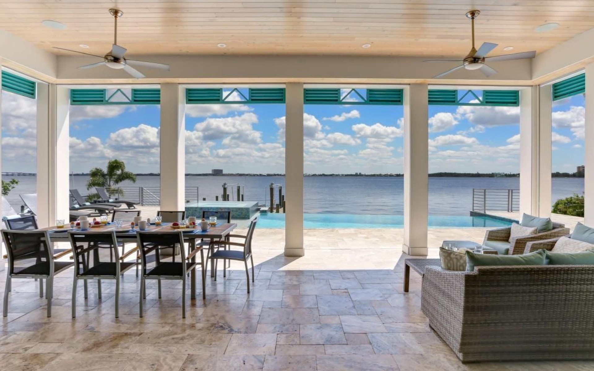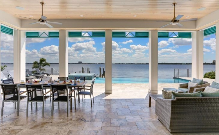 Von überall hat man einem grossartigen Blick auf den Aussenbereich mit Pool, sowie auf den dahinter liegenden Kanal.