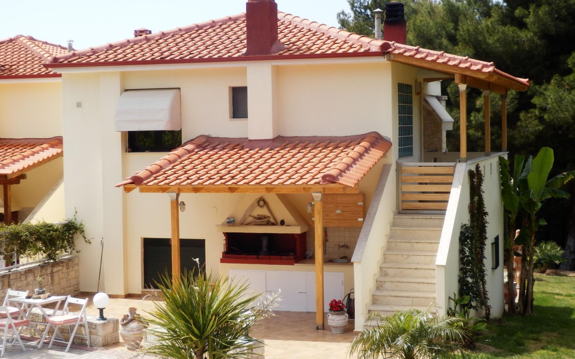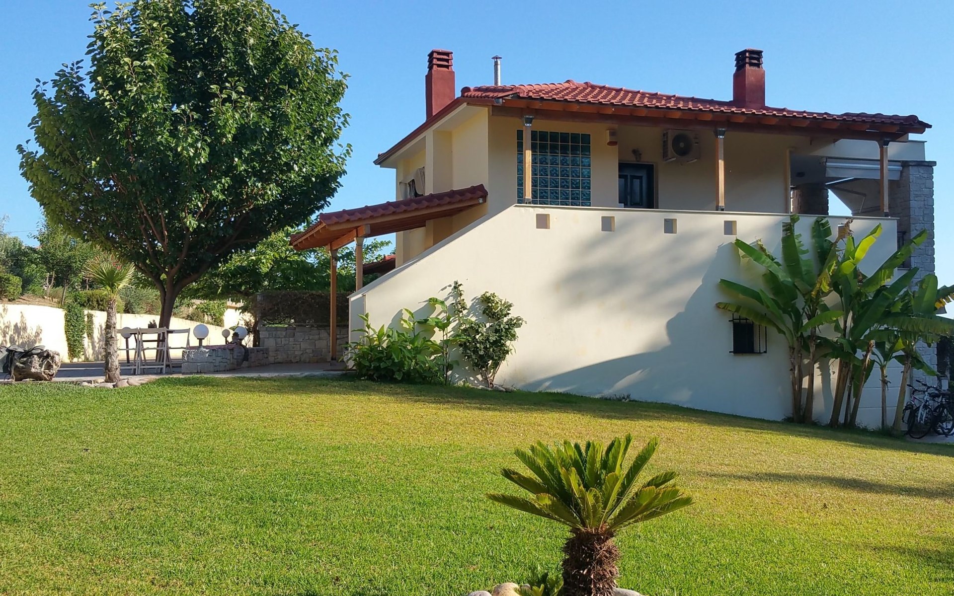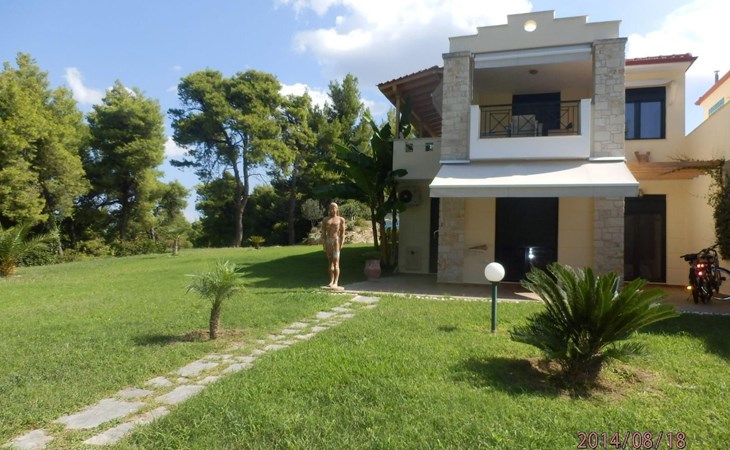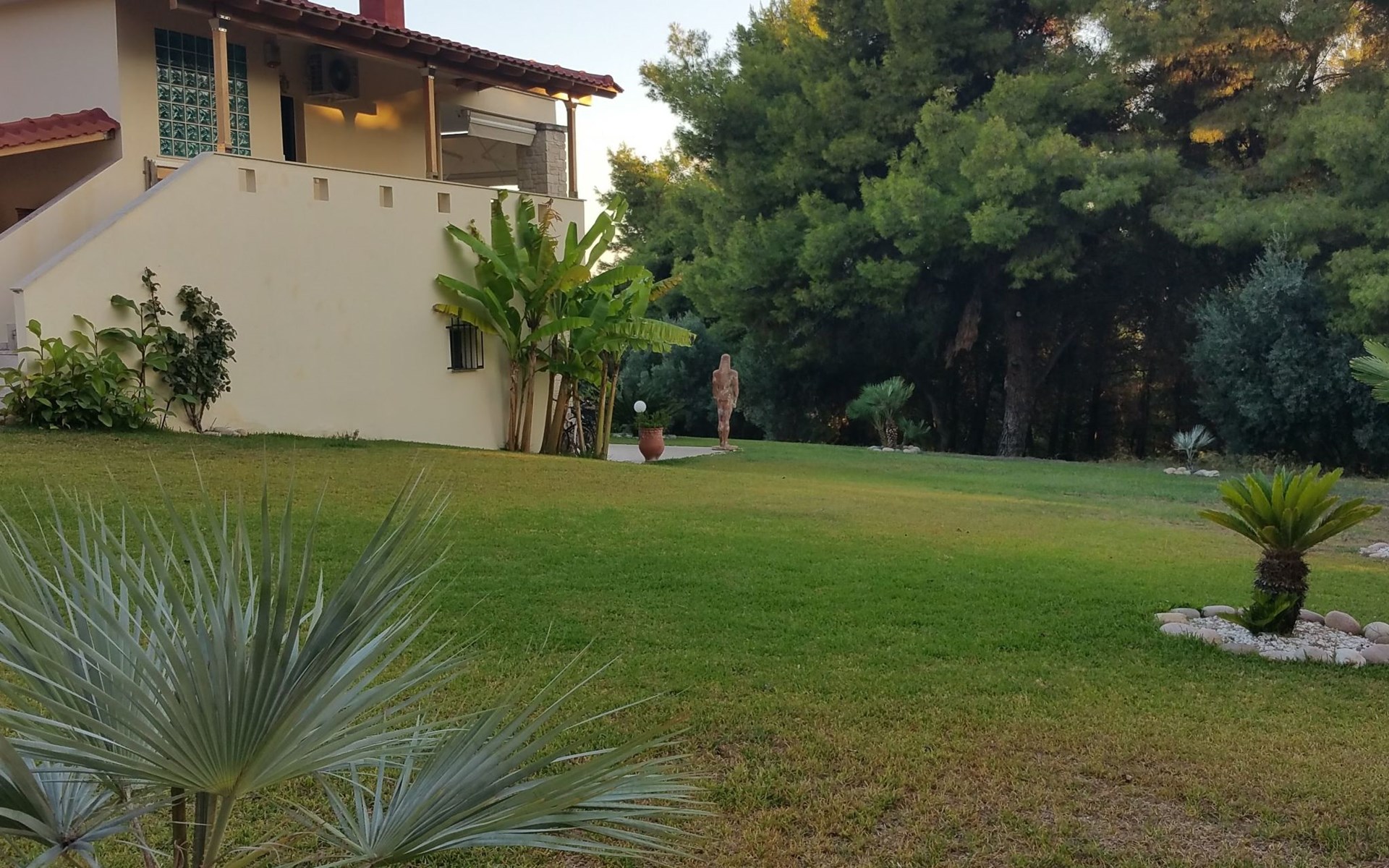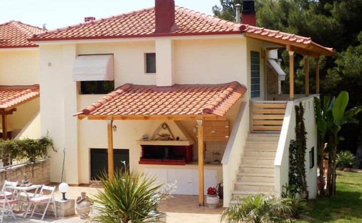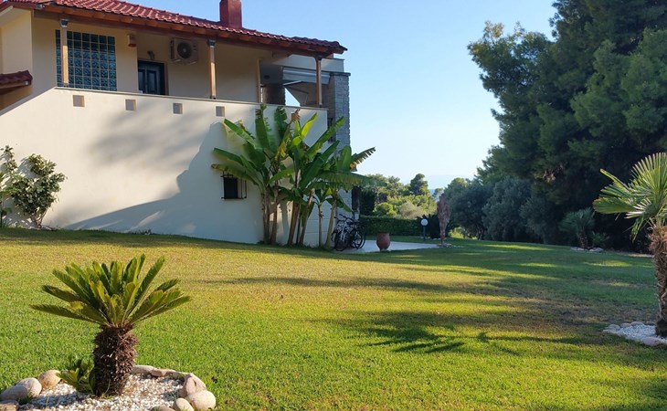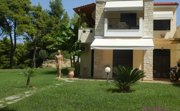 Das sehr geschmackvolle und komfortable Ferienhaus liegt am Ortsrand von Possidi am traumhaften Sandstrand. Es ist das Endhaus einer Häuserreihe und liegt direkt auf einem kleinen Hügel, umgeben von vielen Bäumen des angrenzenden Waldes und vielen Pflanzen. Das Haus ist 100m² groß und hat zwei Etagen. Auf der unteren befinden sich die drei Schlafzimmer, die im Sommer 2021 frisch renoviert wurden. Eins davon ist mit zwei Einzelbetten und je einem Kleiderschrank ausgestattet. In den anderen beiden Schlafzimmer steht je ein Doppelbett. Für alle Betten steht je ein Satz Wechselbettwäsche zur Verfügung. Auf dieser Etage finden Sie das Badezimmer mit WC, Waschbecken und einer modernen Dusch- und Dampfkabine. Handtücher sowie die Waschmaschine stehen hier zur Verfügung. Im Flur befindet sich eine kleine Minibar mit Kühlschrank, in welcher Sie Ihre Getränke unterbringen können. Die obere Etage des Hauses besteht aus dem Wohn- und Küchenbereich. Im großen Wohnraum steht ein gemütliches Ledersofa. An kühleren Abenden kann man hier entspannt vor dem Kamin sitzen. Die offene Küche ist modern ausgestattet mit E-Herd (Ceran-Platte), Backofen, Toaster, Wasserkocher und großem Kühlschrank mit Gefrierfach. Am runden Tisch können vier Personen sitzen. Auf dieser Etage befindet sich das zweite Badezimmer mit WC, Waschbecken und Dusche. Alle Fenster des Hauses sind mit Mückenschutzgitter versehen. Der große Balkon gibt dem Haus eine besondere Note, denn hier kann man beim Duft der Nadelbäume den Ausblick auf den Wald bis hin zum Meer genießen. Ein eigener Grill sowie Parkplätze für bis zu drei Autos stehen zur Verfügung. Der Pool der Wohnanlage kann mitbenutzt werden. Dieser wird mit 5 weiteren Ferienhäusern geteilt. Possidi befindet sich auf dem ersten Finger der Halbinsel Chalkidiki. Der Ort verfügt über herrliche Sandstrände, auf denen man die Sonnenuntergänge mit einem bezaubernden Blick auf den Götterberg Olymp genießen kann. Kleine Tavernen direkt am Strand, Pizzerien, Fast-Food-Läden, Bars sowie Souvenirshops und ein kleiner Supermarkt sind fußläufig in ca. 15 Minuten zu erreichen, der Strand in 10 Minuten. Wer mit dem Auto unterwegs ist findet überall Parkmöglichkeiten. Die Anreise vom nächsten Flughafen von Thessaloniki dauert mit dem Mietwagen ca. 1 Stunde und 15 Minuten.