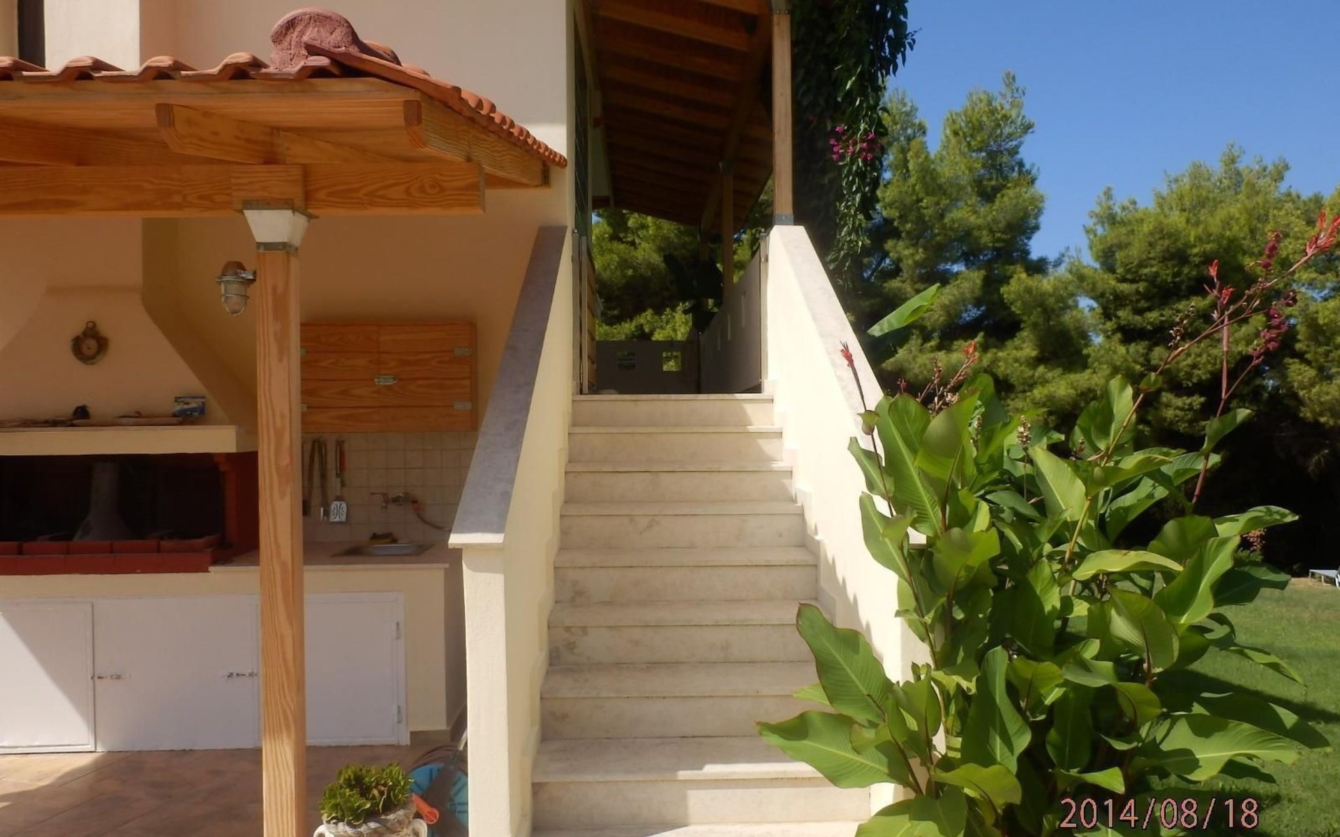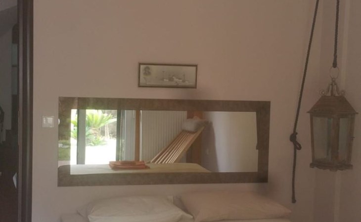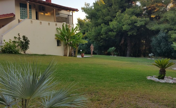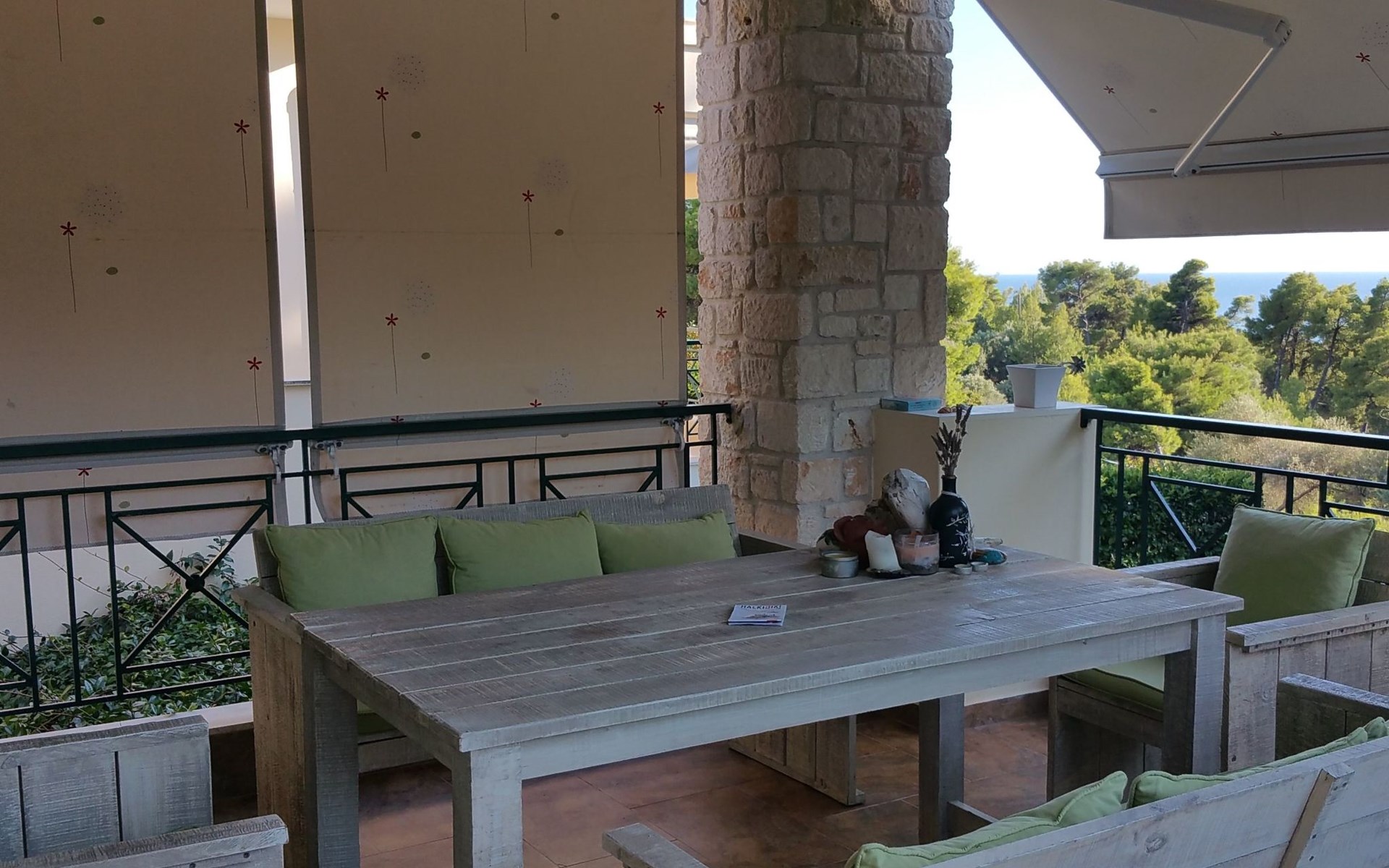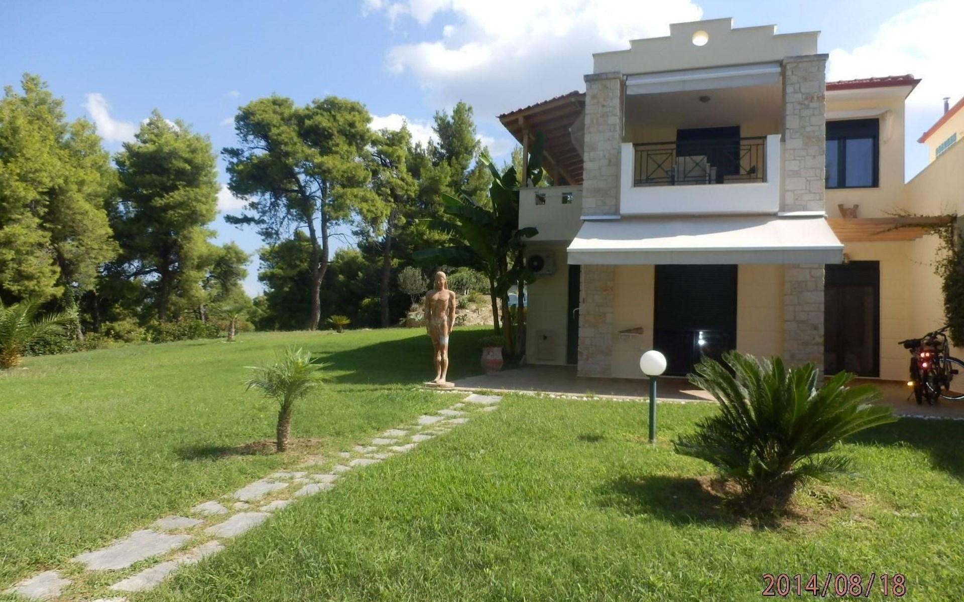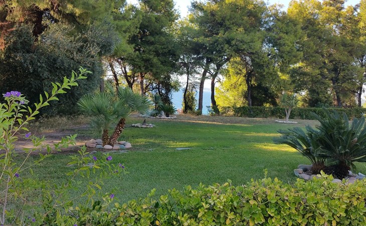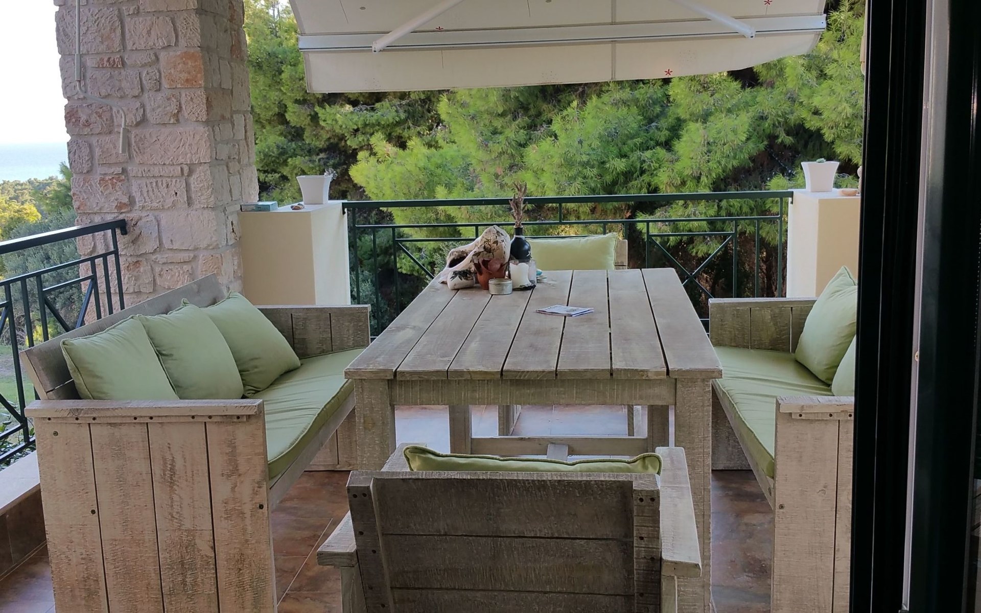 Das sehr geschmackvolle und komfortable Ferienhaus liegt am Ortsrand von Possidi am traumhaften Sandstrand. Es ist das Endhaus einer Häuserreihe und liegt direkt auf einem kleinen Hügel, umgeben von vielen Bäumen des angrenzenden Waldes und vielen Pflanzen. Das Haus ist 100m² groß und hat zwei Etagen. Auf der unteren befinden sich die drei Schlafzimmer, die im Sommer 2021 frisch renoviert wurden. Eins davon ist mit zwei Einzelbetten und je einem Kleiderschrank ausgestattet. In den anderen beiden Schlafzimmer steht je ein Doppelbett. Für alle Betten steht je ein Satz Wechselbettwäsche zur Verfügung. Auf dieser Etage finden Sie das Badezimmer mit WC, Waschbecken und einer modernen Dusch- und Dampfkabine. Handtücher sowie die Waschmaschine stehen hier zur Verfügung. Im Flur befindet sich eine kleine Minibar mit Kühlschrank, in welcher Sie Ihre Getränke unterbringen können. Die obere Etage des Hauses besteht aus dem Wohn- und Küchenbereich. Im großen Wohnraum steht ein gemütliches Ledersofa. An kühleren Abenden kann man hier entspannt vor dem Kamin sitzen. Die offene Küche ist modern ausgestattet mit E-Herd (Ceran-Platte), Backofen, Toaster, Wasserkocher und großem Kühlschrank mit Gefrierfach. Am runden Tisch können vier Personen sitzen. Auf dieser Etage befindet sich das zweite Badezimmer mit WC, Waschbecken und Dusche. Alle Fenster des Hauses sind mit Mückenschutzgitter versehen. Der große Balkon gibt dem Haus eine besondere Note, denn hier kann man beim Duft der Nadelbäume den Ausblick auf den Wald bis hin zum Meer genießen. Ein eigener Grill sowie Parkplätze für bis zu drei Autos stehen zur Verfügung. Der Pool der Wohnanlage kann mitbenutzt werden. Dieser wird mit 5 weiteren Ferienhäusern geteilt. Possidi befindet sich auf dem ersten Finger der Halbinsel Chalkidiki. Der Ort verfügt über herrliche Sandstrände, auf denen man die Sonnenuntergänge mit einem bezaubernden Blick auf den Götterberg Olymp genießen kann. Kleine Tavernen direkt am Strand, Pizzerien, Fast-Food-Läden, Bars sowie Souvenirshops und ein kleiner Supermarkt sind fußläufig in ca. 15 Minuten zu erreichen, der Strand in 10 Minuten. Wer mit dem Auto unterwegs ist findet überall Parkmöglichkeiten. Die Anreise vom nächsten Flughafen von Thessaloniki dauert mit dem Mietwagen ca. 1 Stunde und 15 Minuten.