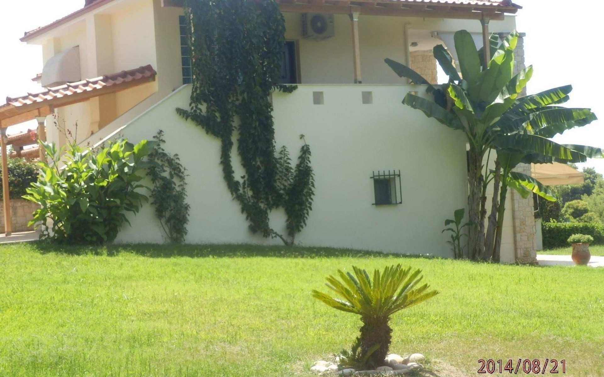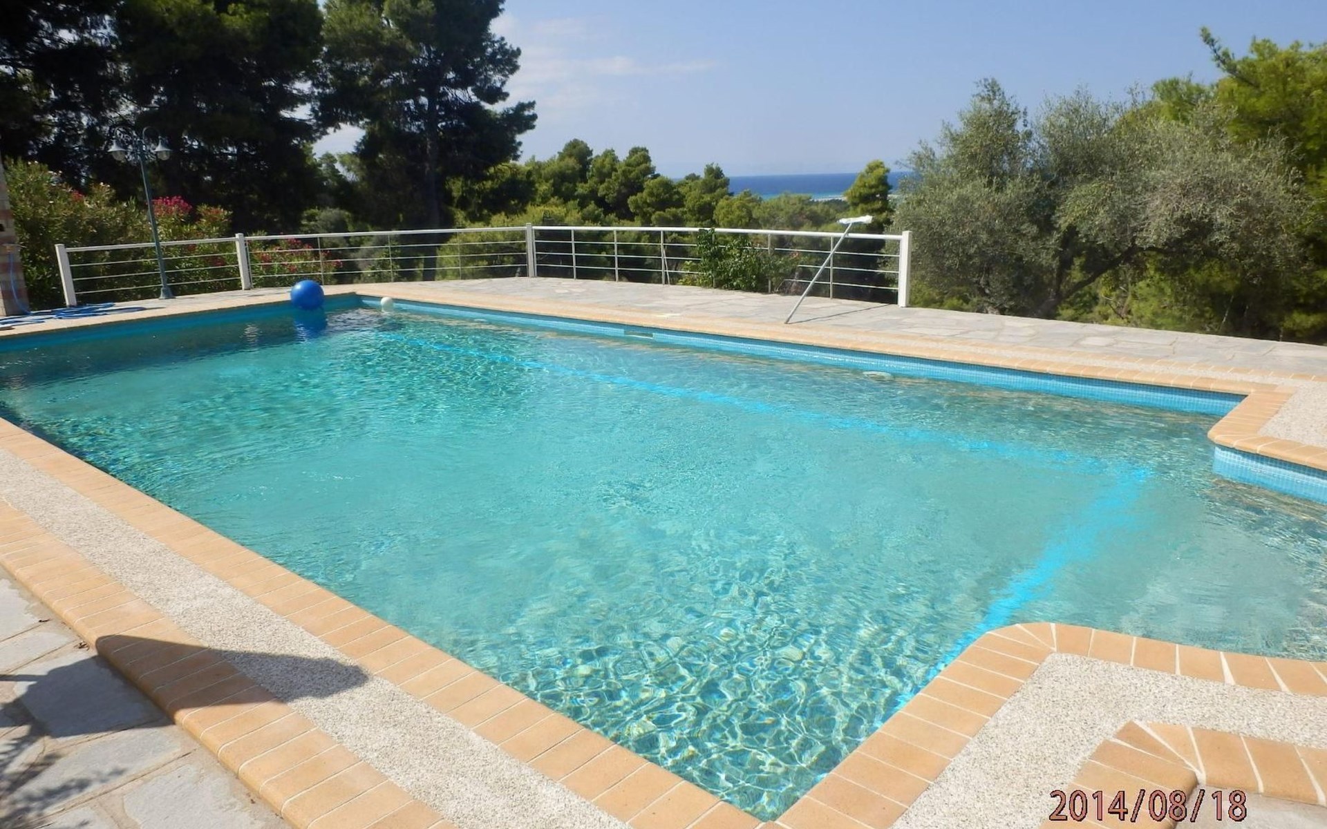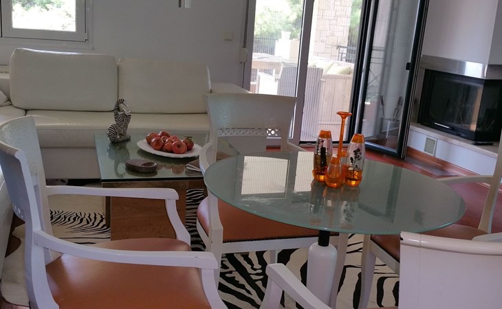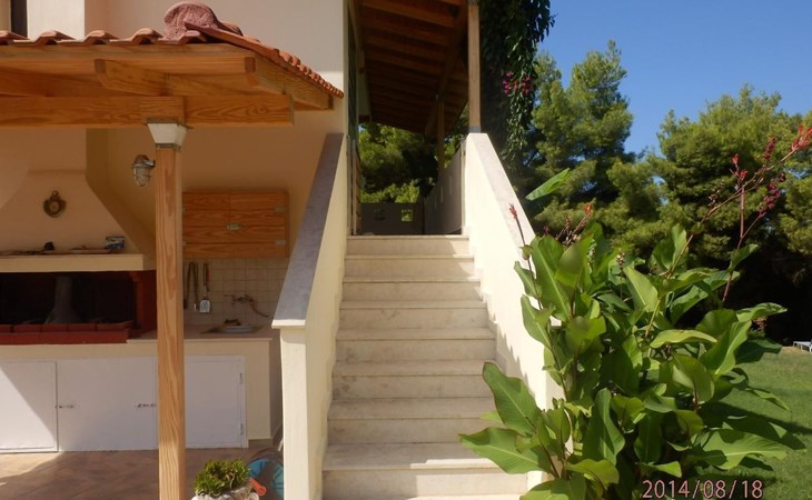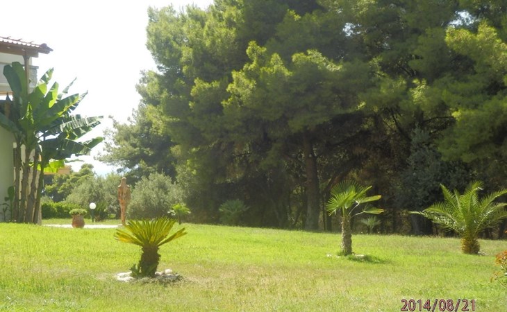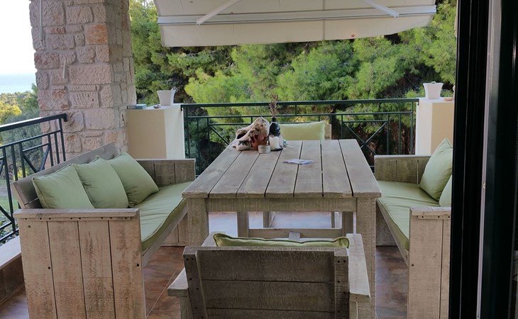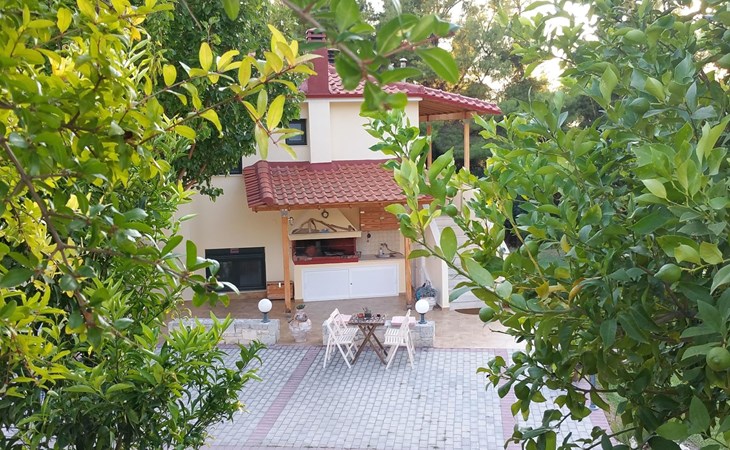 Das sehr geschmackvolle und komfortable Ferienhaus liegt am Ortsrand von Possidi am traumhaften Sandstrand. Es ist das Endhaus einer Häuserreihe und liegt direkt auf einem kleinen Hügel, umgeben von vielen Bäumen des angrenzenden Waldes und vielen Pflanzen. Das Haus ist 100m² groß und hat zwei Etagen. Auf der unteren befinden sich die drei Schlafzimmer, die im Sommer 2021 frisch renoviert wurden. Eins davon ist mit zwei Einzelbetten und je einem Kleiderschrank ausgestattet. In den anderen beiden Schlafzimmer steht je ein Doppelbett. Für alle Betten steht je ein Satz Wechselbettwäsche zur Verfügung. Auf dieser Etage finden Sie das Badezimmer mit WC, Waschbecken und einer modernen Dusch- und Dampfkabine. Handtücher sowie die Waschmaschine stehen hier zur Verfügung. Im Flur befindet sich eine kleine Minibar mit Kühlschrank, in welcher Sie Ihre Getränke unterbringen können. Die obere Etage des Hauses besteht aus dem Wohn- und Küchenbereich. Im großen Wohnraum steht ein gemütliches Ledersofa. An kühleren Abenden kann man hier entspannt vor dem Kamin sitzen. Die offene Küche ist modern ausgestattet mit E-Herd (Ceran-Platte), Backofen, Toaster, Wasserkocher und großem Kühlschrank mit Gefrierfach. Am runden Tisch können vier Personen sitzen. Auf dieser Etage befindet sich das zweite Badezimmer mit WC, Waschbecken und Dusche. Alle Fenster des Hauses sind mit Mückenschutzgitter versehen. Der große Balkon gibt dem Haus eine besondere Note, denn hier kann man beim Duft der Nadelbäume den Ausblick auf den Wald bis hin zum Meer genießen. Ein eigener Grill sowie Parkplätze für bis zu drei Autos stehen zur Verfügung. Der Pool der Wohnanlage kann mitbenutzt werden. Dieser wird mit 5 weiteren Ferienhäusern geteilt. Possidi befindet sich auf dem ersten Finger der Halbinsel Chalkidiki. Der Ort verfügt über herrliche Sandstrände, auf denen man die Sonnenuntergänge mit einem bezaubernden Blick auf den Götterberg Olymp genießen kann. Kleine Tavernen direkt am Strand, Pizzerien, Fast-Food-Läden, Bars sowie Souvenirshops und ein kleiner Supermarkt sind fußläufig in ca. 15 Minuten zu erreichen, der Strand in 10 Minuten. Wer mit dem Auto unterwegs ist findet überall Parkmöglichkeiten. Die Anreise vom nächsten Flughafen von Thessaloniki dauert mit dem Mietwagen ca. 1 Stunde und 15 Minuten.