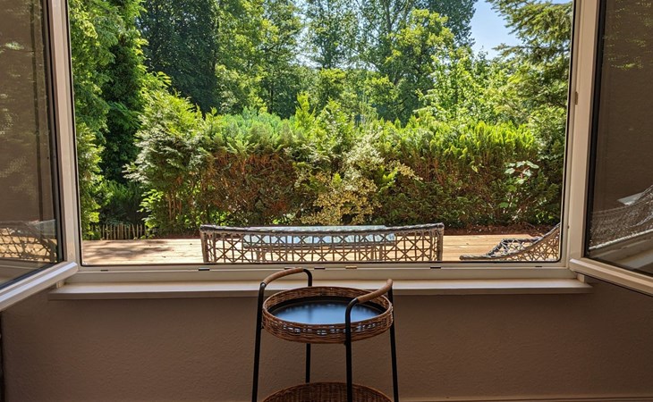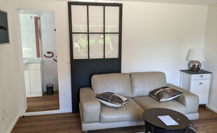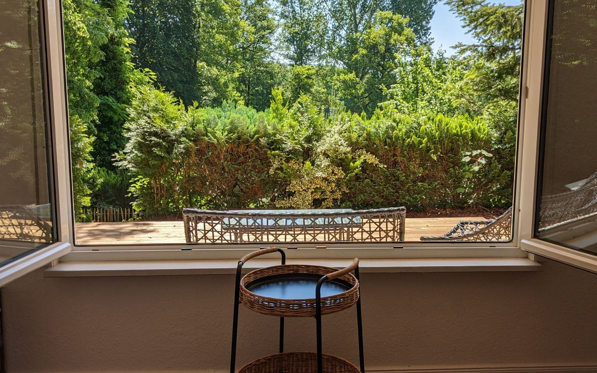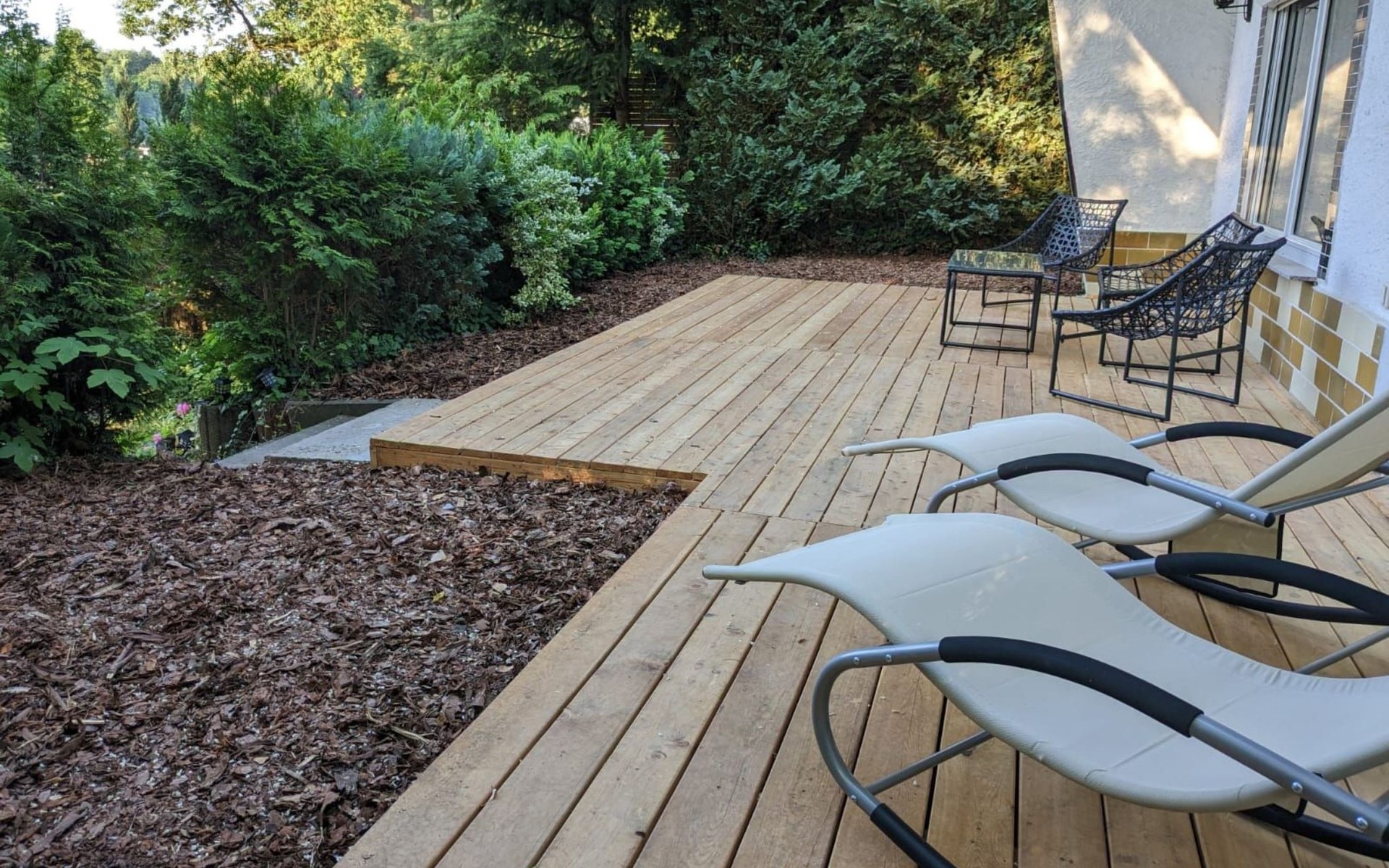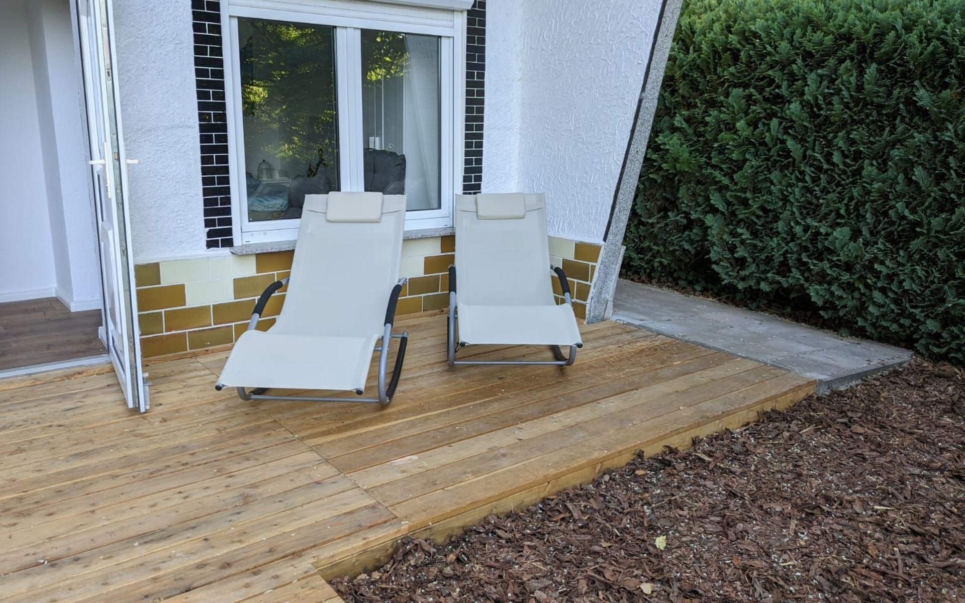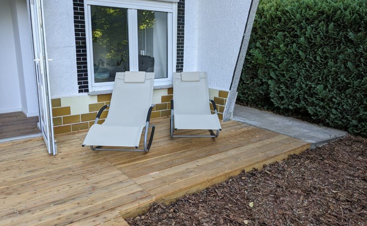 Der von der Straße nicht einsehbare Garten ist halbschattig, besitzt eine große Holzterrasse mit Liegestühlen zum Ruhen. Ein Grill und eine Sitzgruppe mit Sonnenschirm sind ebenso vorhanden.