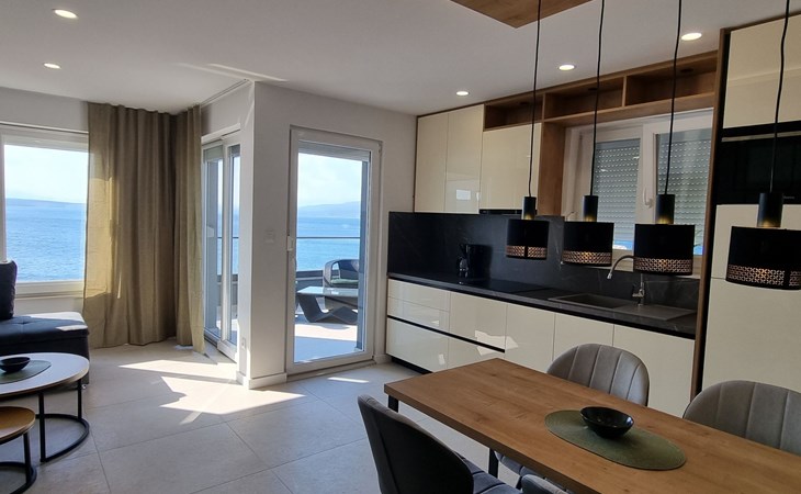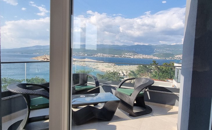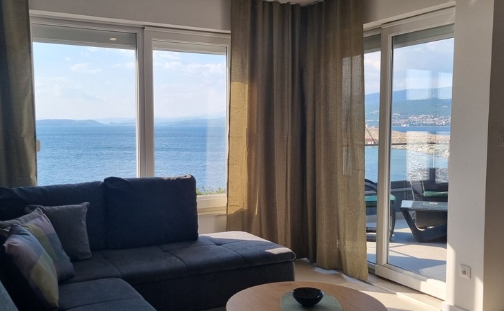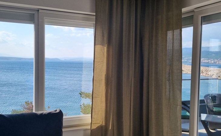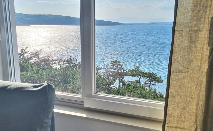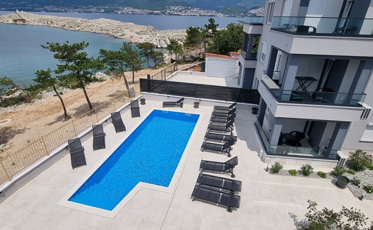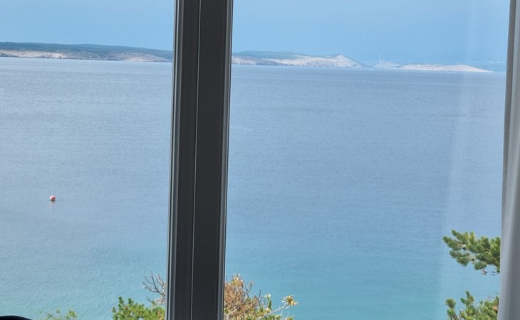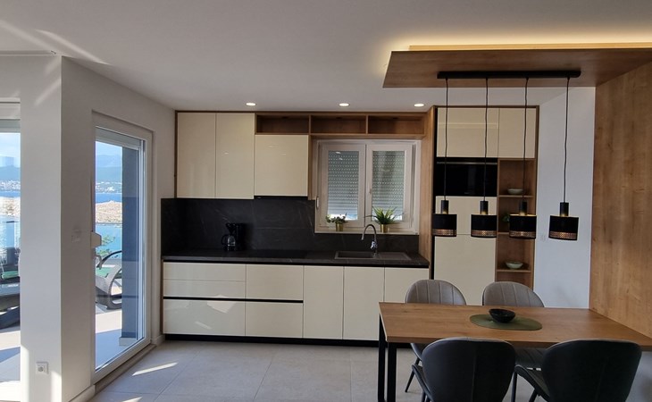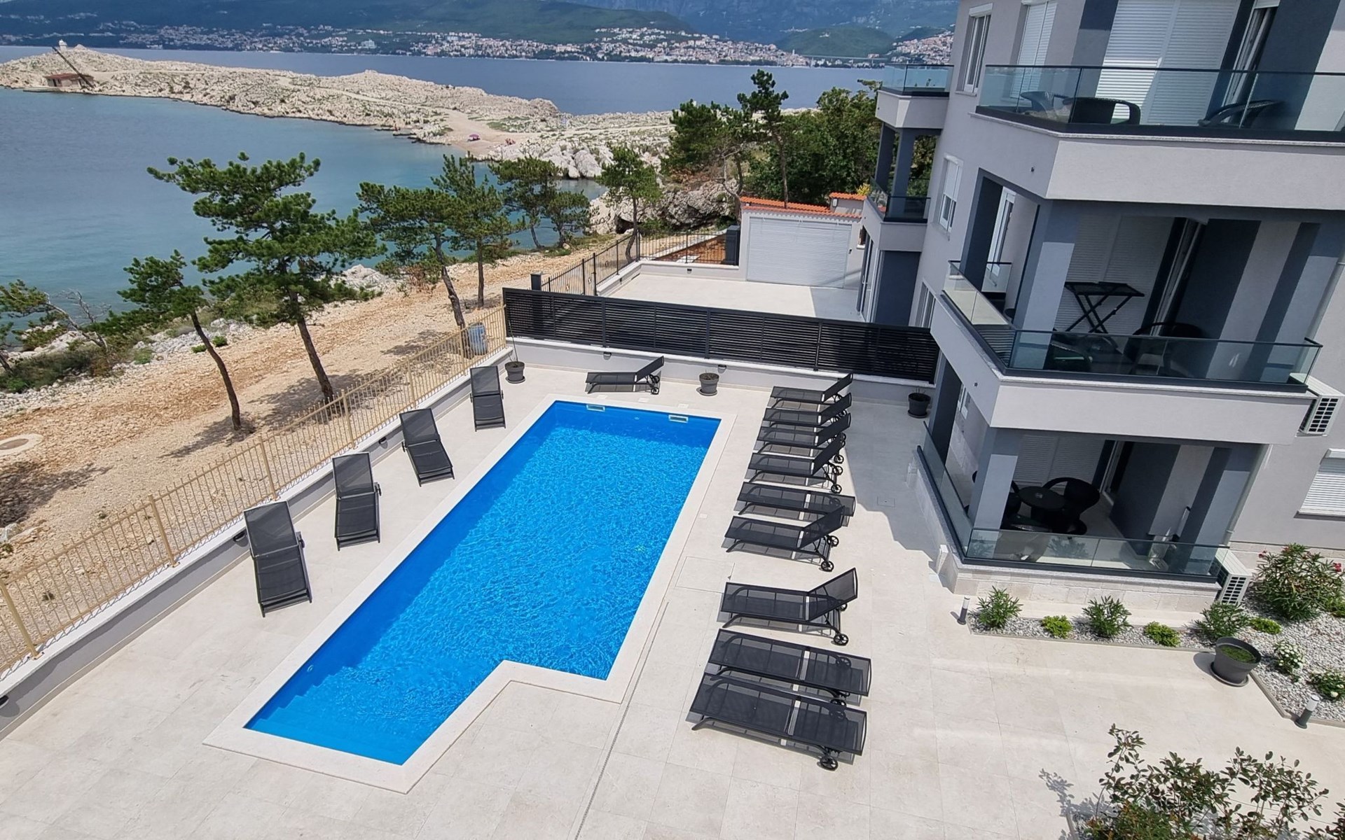 Der Balkon (10 m2) bietet eine wunderschöne Aussicht auf den Pool und das Meer. Der Poolbereich im Erdgeschoss ist mit Sonnenliegen, Sonnenschirmen und einer Außendusche ausgestattet und bietet direkten Zugang zum Meer zum bequemen Schwimmen. Ein gemeinsamer Waschraum im Erdgeschoss umfasst eine Waschmaschine, Waschkapseln/Waschmittel und ein Bügeleisen zur Nutzung durch die Gäste.
