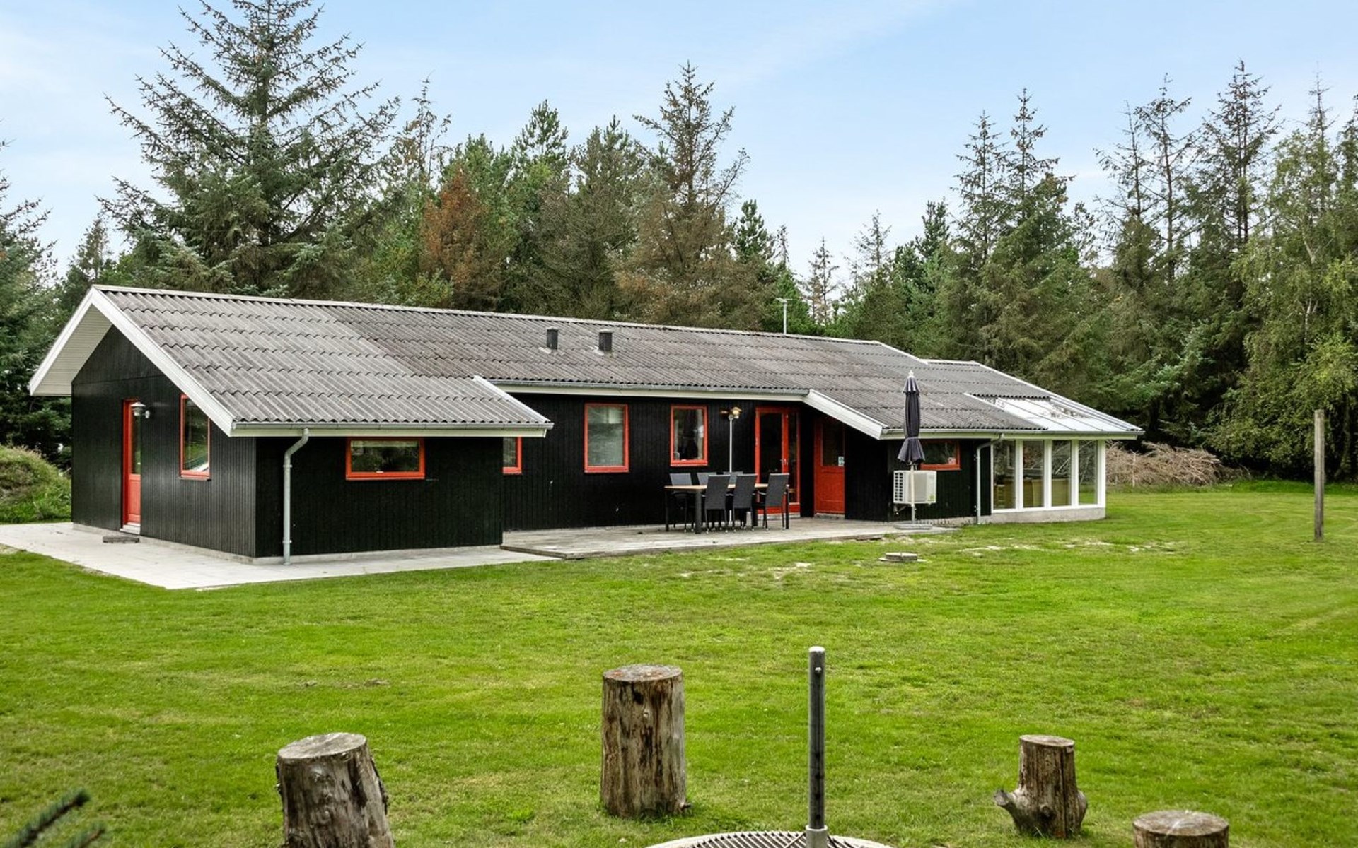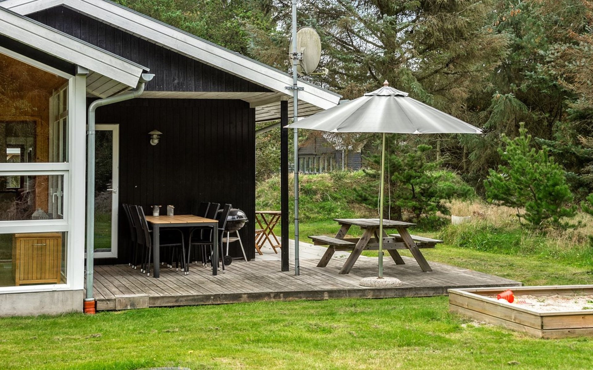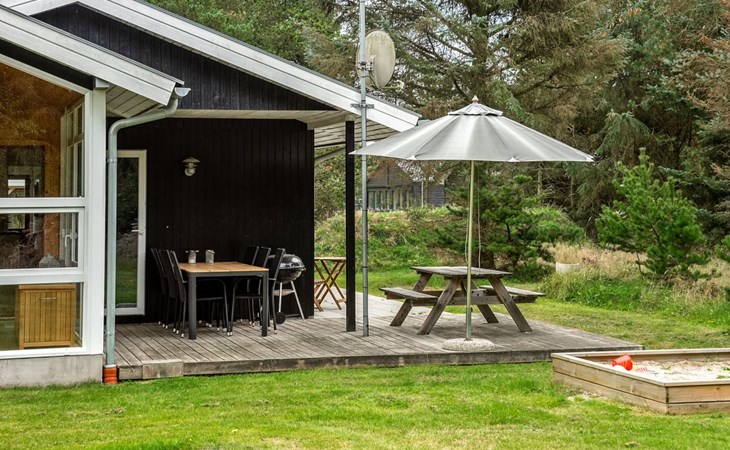 Einfamilienhaus, Baujahr 1977. 2.5 km vom Meer. Zur Alleinbenutzung: naturbelassenes Grundstück 2'900 m2. Terrasse (45 m2), Grill, Kinderspielplatz (Schaukel). Im Hause: Trampolin, Waschmaschine, Wäschetrockner. Carport. Lebensmittelgeschäft 2 km. Der Besitzer akzeptiert keine Jugendgruppen.
