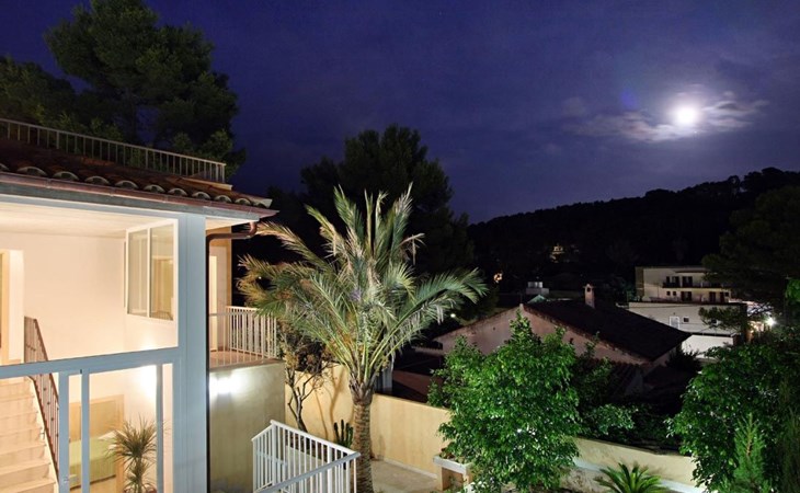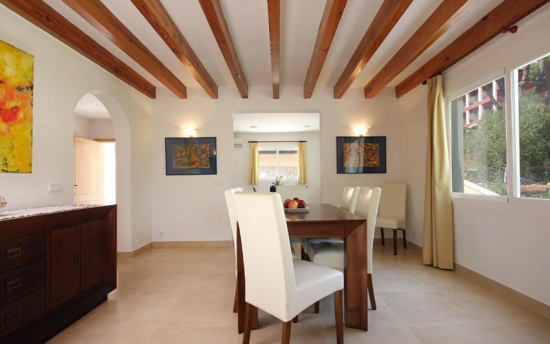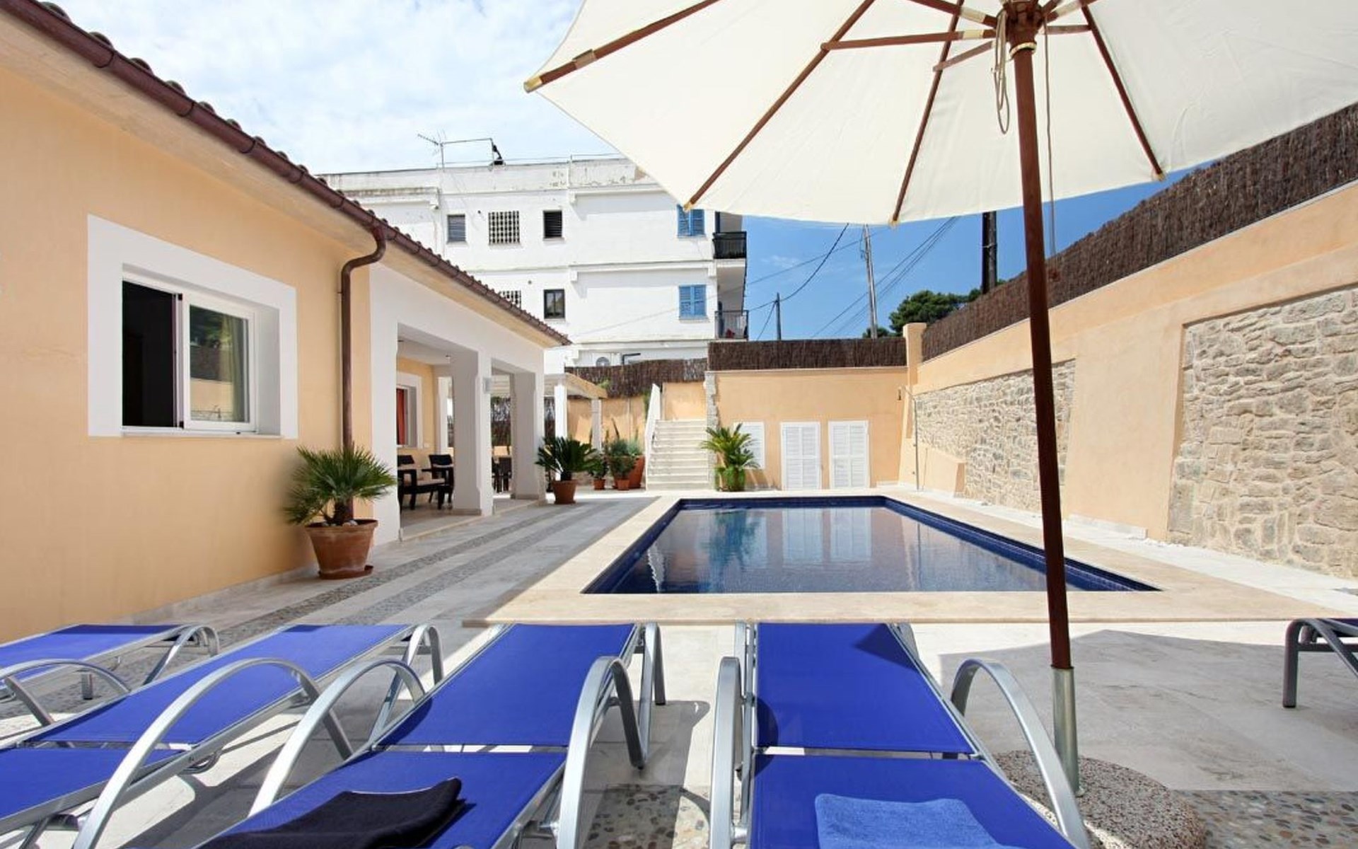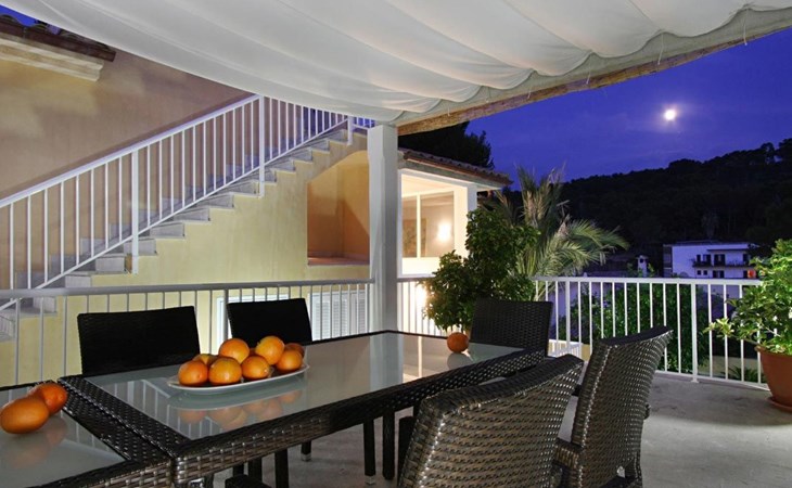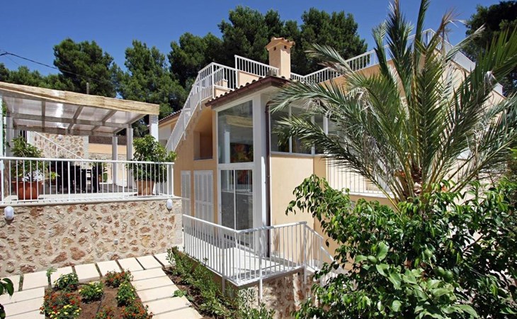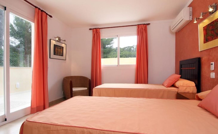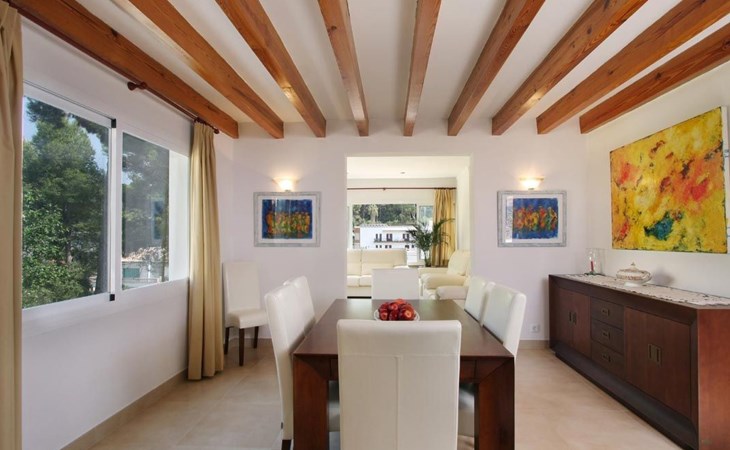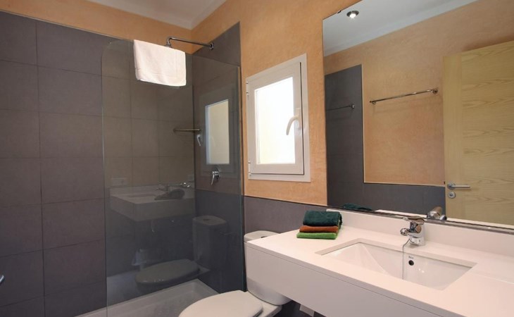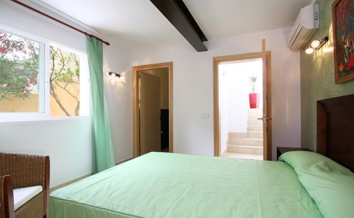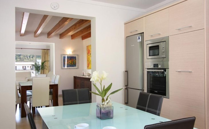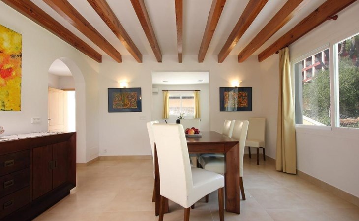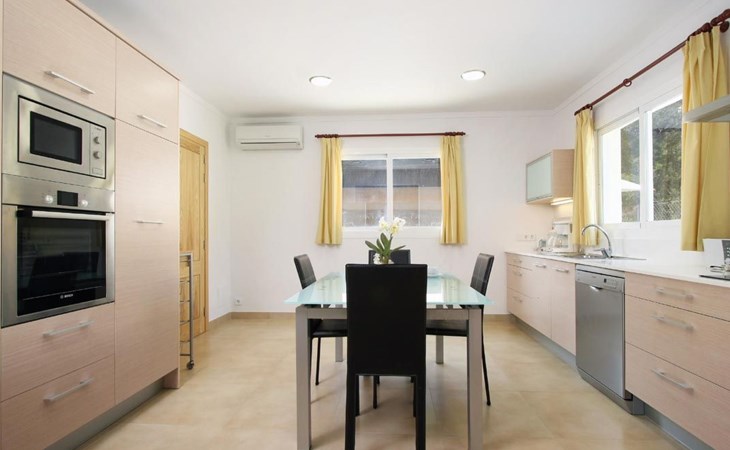 Das Haus ist schön dekoriert und eingerichtet. Von der Straße aus gelangt man über eine Treppe auf das Grundstück. Der Haupteingang befindet sich unter einer kleinen überdachten Terrasse und führt direkt in einen kleinen Saal, der als Diele dient. Auf der linken Seite der Halle befinden sich das Esszimmer, das Wohnzimmer und die Küche. Das Wohnzimmer ist sehr geräumig und zeichnet sich durch seine großen Fenster aus, die ihm eine große Helligkeit und einen schönen Blick bis zum Meer verleihen. Es ist mit drei Sofas, Plasma-TV, Satellit, DVD und Klimaanlage ausgestattet. Das Esszimmer ist ebenfalls geräumig und hell. Es hat einen schönen dunklen Holztisch und weiße Lederstühle. Die Küche ist modern und komfortabel. Sie ist komplett ausgestattet mit Cerankochfeld, Elektroofen, Dunstabzugshaube, Mikrowelle, Geschirrspüler, Kühl-/Gefrierschrank und sogar Klimaanlage. Die Küche hat auch einen Ausgang nach draußen, der direkt zum Poolbereich und den Terrassen führt. Auf der rechten Seite des Flurs befinden sich die vier Schlafzimmer sowie ein Gäste-WC. Zwei dieser Schlafzimmer (ein Doppel- und ein Zweibettzimmer) befinden sich im Erdgeschoss des Hauses. Die anderen beiden Schlafzimmer sind ebenfalls ein Doppel- und ein Zweibettzimmer. Jedes der vier Schlafzimmer hat ein eigenes Badezimmer (eines davon mit Badewanne und die anderen drei mit Dusche). Alle Schlafzimmer sind mit Einbauschränken und Klimaanlage/Wärmepumpe ausgestattet, was Casa Medina zu einer idealen Wahl sowohl für die heißen Sommermonate als auch für die kühleren Herbst- und Frühlingsmonate macht.
