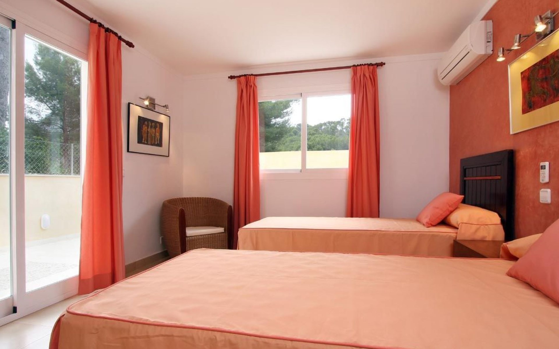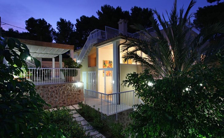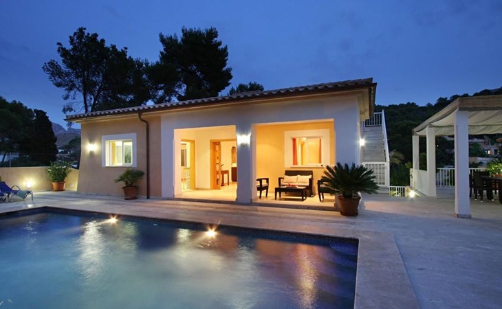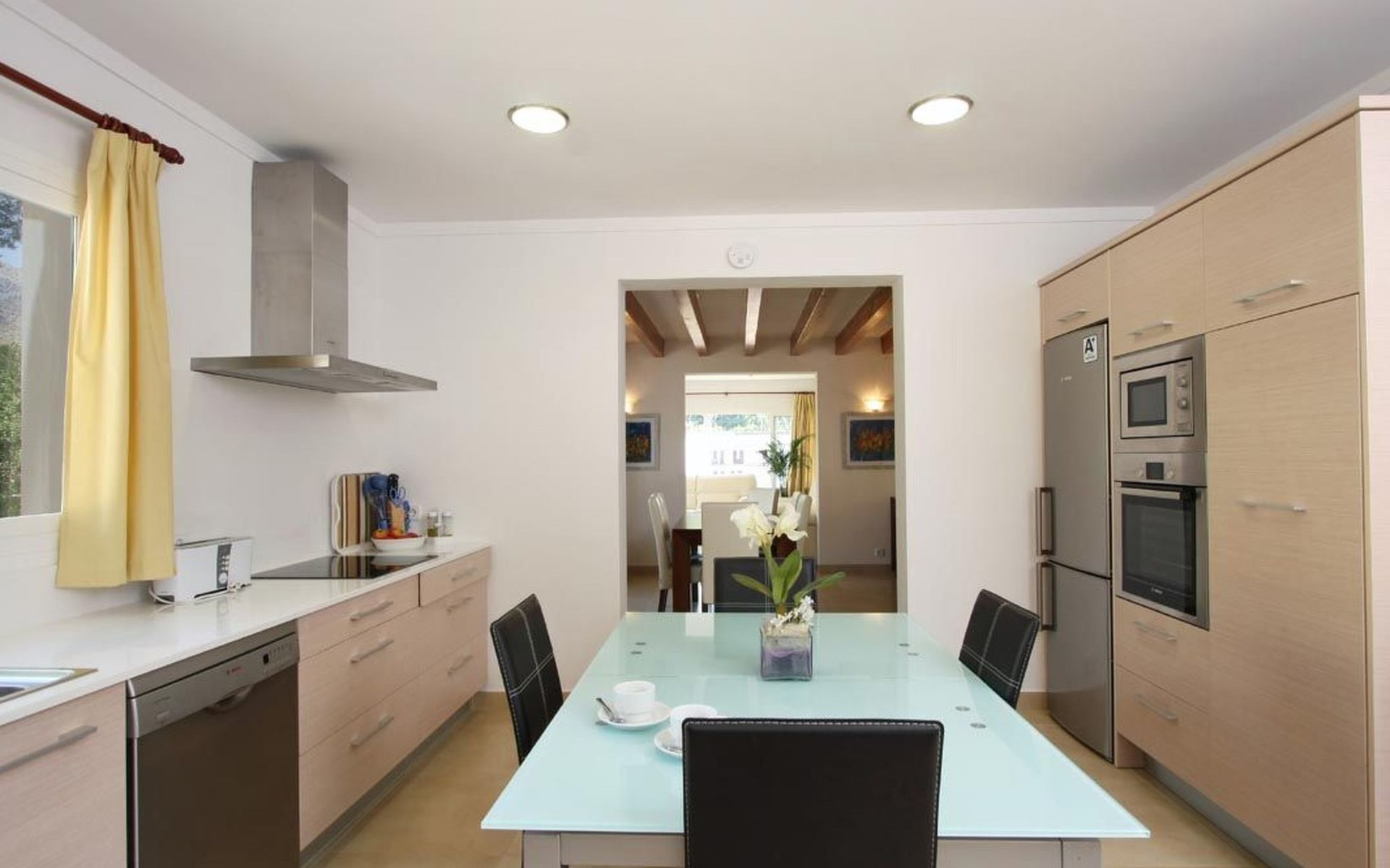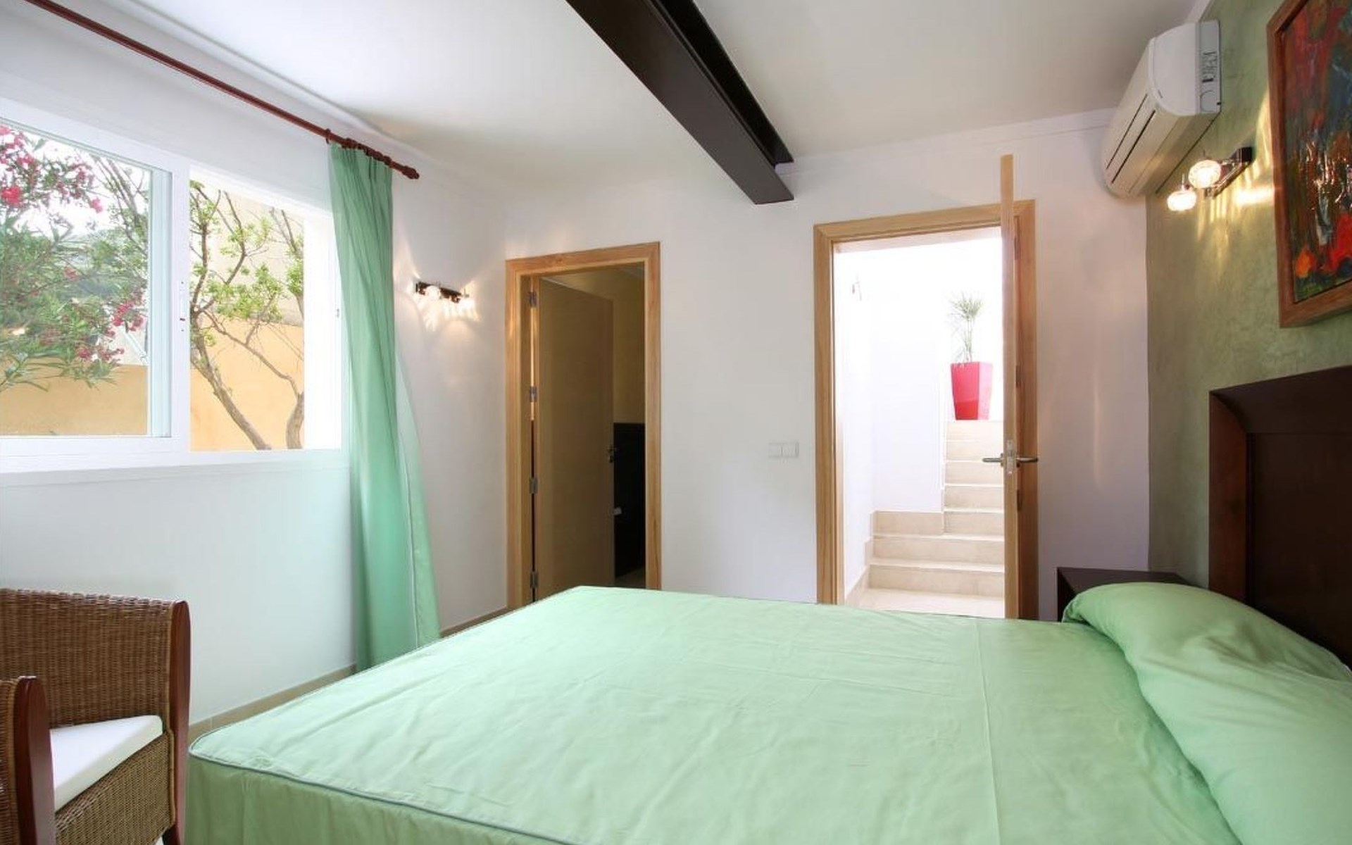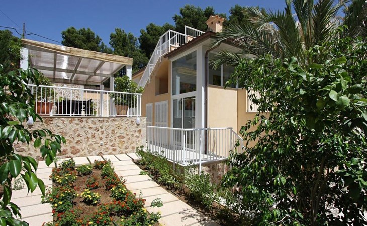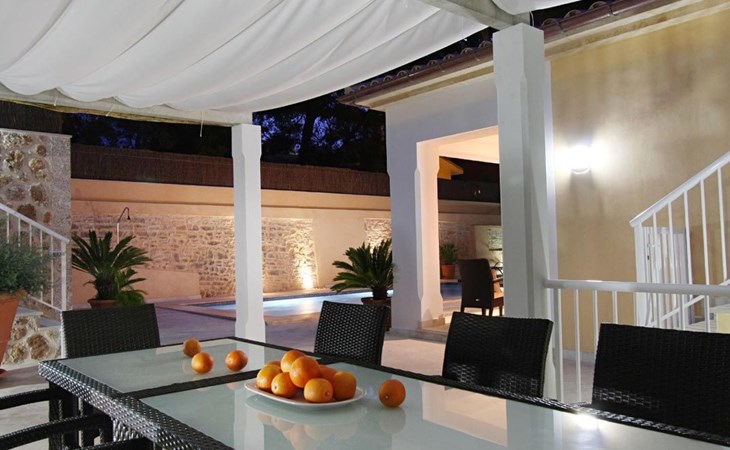 Das Haus ist schön dekoriert und eingerichtet. Von der Straße aus gelangt man über eine Treppe auf das Grundstück. Der Haupteingang befindet sich unter einer kleinen überdachten Terrasse und führt direkt in einen kleinen Saal, der als Diele dient. Auf der linken Seite der Halle befinden sich das Esszimmer, das Wohnzimmer und die Küche. Das Wohnzimmer ist sehr geräumig und zeichnet sich durch seine großen Fenster aus, die ihm eine große Helligkeit und einen schönen Blick bis zum Meer verleihen. Es ist mit drei Sofas, Plasma-TV, Satellit, DVD und Klimaanlage ausgestattet. Das Esszimmer ist ebenfalls geräumig und hell. Es hat einen schönen dunklen Holztisch und weiße Lederstühle. Die Küche ist modern und komfortabel. Sie ist komplett ausgestattet mit Cerankochfeld, Elektroofen, Dunstabzugshaube, Mikrowelle, Geschirrspüler, Kühl-/Gefrierschrank und sogar Klimaanlage. Die Küche hat auch einen Ausgang nach draußen, der direkt zum Poolbereich und den Terrassen führt. Auf der rechten Seite des Flurs befinden sich die vier Schlafzimmer sowie ein Gäste-WC. Zwei dieser Schlafzimmer (ein Doppel- und ein Zweibettzimmer) befinden sich im Erdgeschoss des Hauses. Die anderen beiden Schlafzimmer sind ebenfalls ein Doppel- und ein Zweibettzimmer. Jedes der vier Schlafzimmer hat ein eigenes Badezimmer (eines davon mit Badewanne und die anderen drei mit Dusche). Alle Schlafzimmer sind mit Einbauschränken und Klimaanlage/Wärmepumpe ausgestattet, was Casa Medina zu einer idealen Wahl sowohl für die heißen Sommermonate als auch für die kühleren Herbst- und Frühlingsmonate macht.