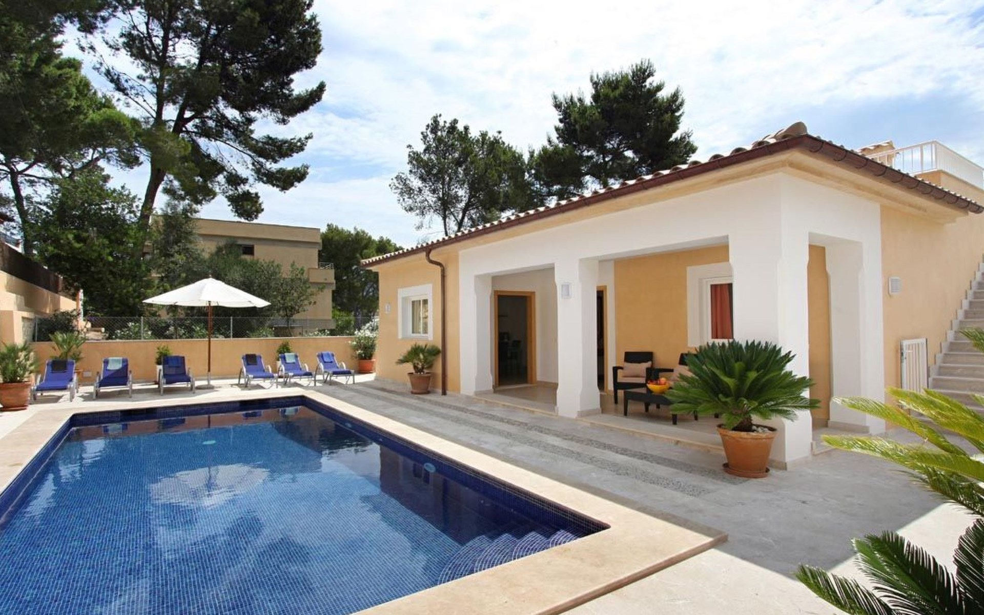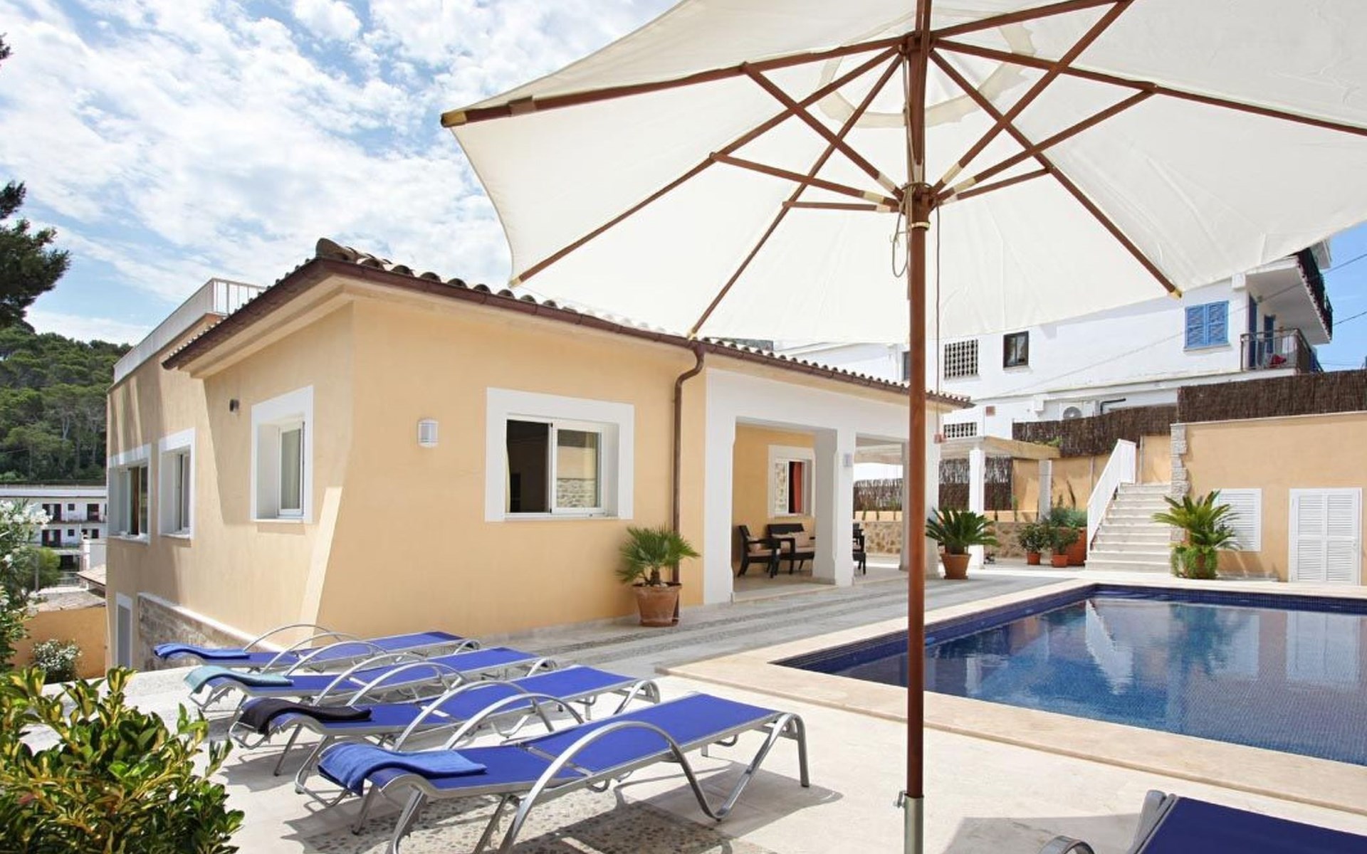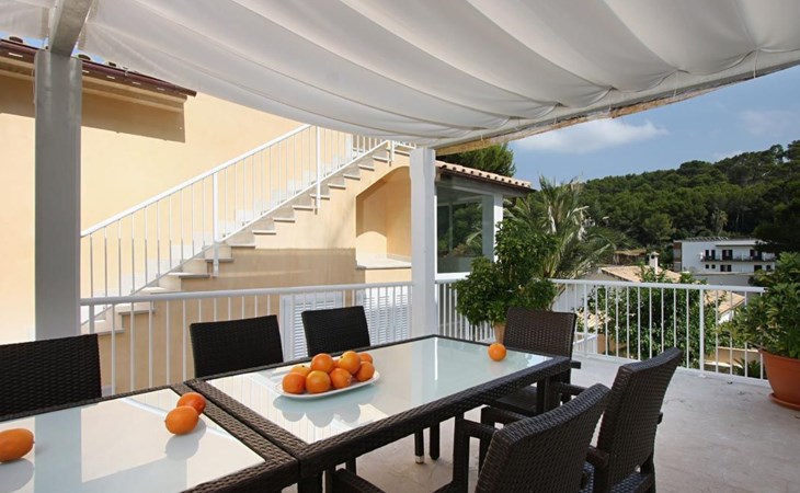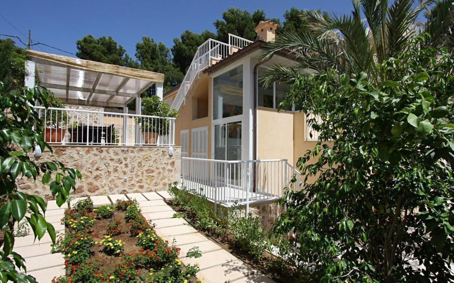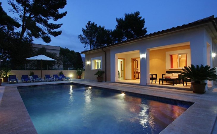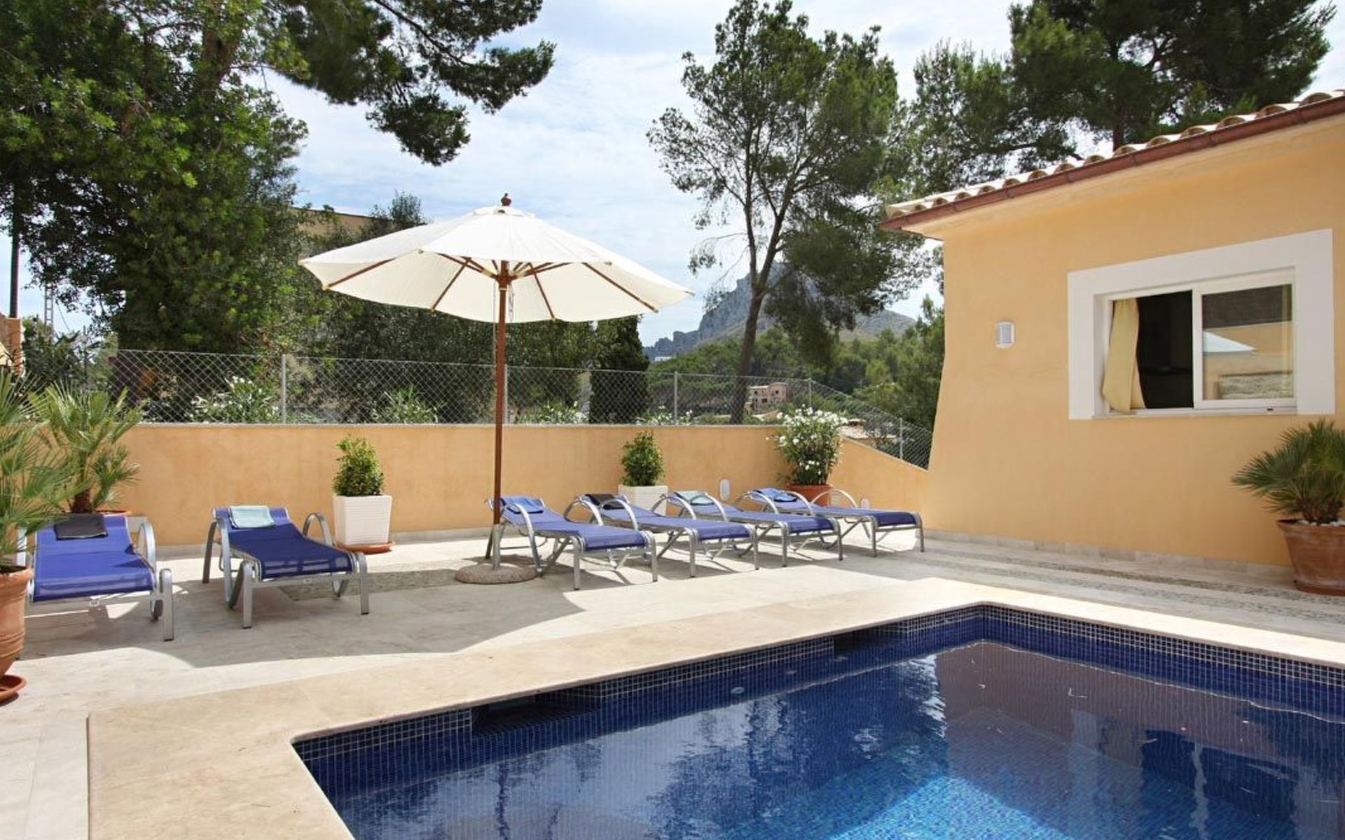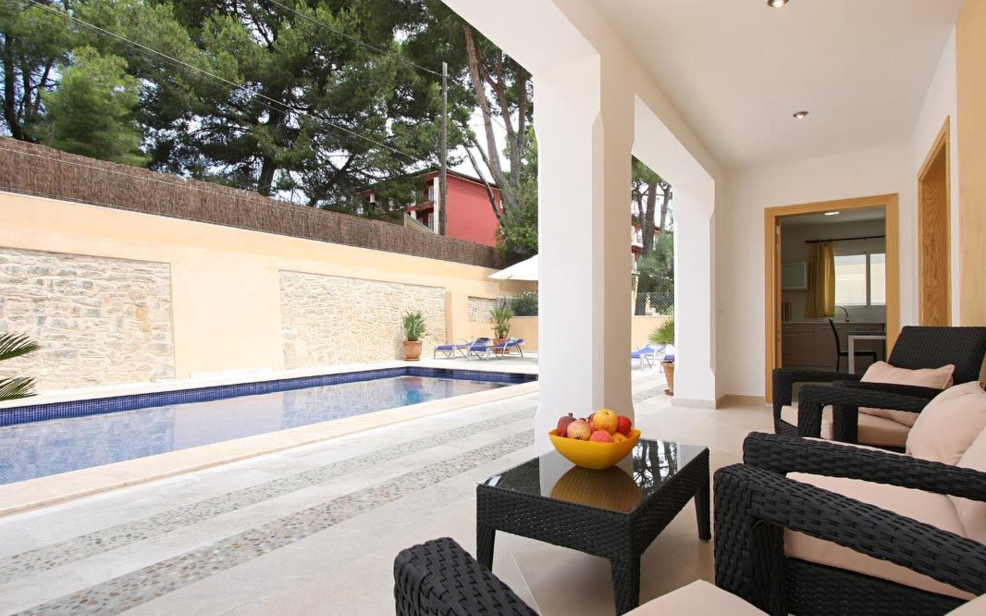 Das Haus ist schön dekoriert und eingerichtet. Von der Straße aus gelangt man über eine Treppe auf das Grundstück. Der Haupteingang befindet sich unter einer kleinen überdachten Terrasse und führt direkt in einen kleinen Saal, der als Diele dient. Auf der linken Seite der Halle befinden sich das Esszimmer, das Wohnzimmer und die Küche. Das Wohnzimmer ist sehr geräumig und zeichnet sich durch seine großen Fenster aus, die ihm eine große Helligkeit und einen schönen Blick bis zum Meer verleihen. Es ist mit drei Sofas, Plasma-TV, Satellit, DVD und Klimaanlage ausgestattet. Das Esszimmer ist ebenfalls geräumig und hell. Es hat einen schönen dunklen Holztisch und weiße Lederstühle. Die Küche ist modern und komfortabel. Sie ist komplett ausgestattet mit Cerankochfeld, Elektroofen, Dunstabzugshaube, Mikrowelle, Geschirrspüler, Kühl-/Gefrierschrank und sogar Klimaanlage. Die Küche hat auch einen Ausgang nach draußen, der direkt zum Poolbereich und den Terrassen führt. Auf der rechten Seite des Flurs befinden sich die vier Schlafzimmer sowie ein Gäste-WC. Zwei dieser Schlafzimmer (ein Doppel- und ein Zweibettzimmer) befinden sich im Erdgeschoss des Hauses. Die anderen beiden Schlafzimmer sind ebenfalls ein Doppel- und ein Zweibettzimmer. Jedes der vier Schlafzimmer hat ein eigenes Badezimmer (eines davon mit Badewanne und die anderen drei mit Dusche). Alle Schlafzimmer sind mit Einbauschränken und Klimaanlage/Wärmepumpe ausgestattet, was Casa Medina zu einer idealen Wahl sowohl für die heißen Sommermonate als auch für die kühleren Herbst- und Frühlingsmonate macht.
