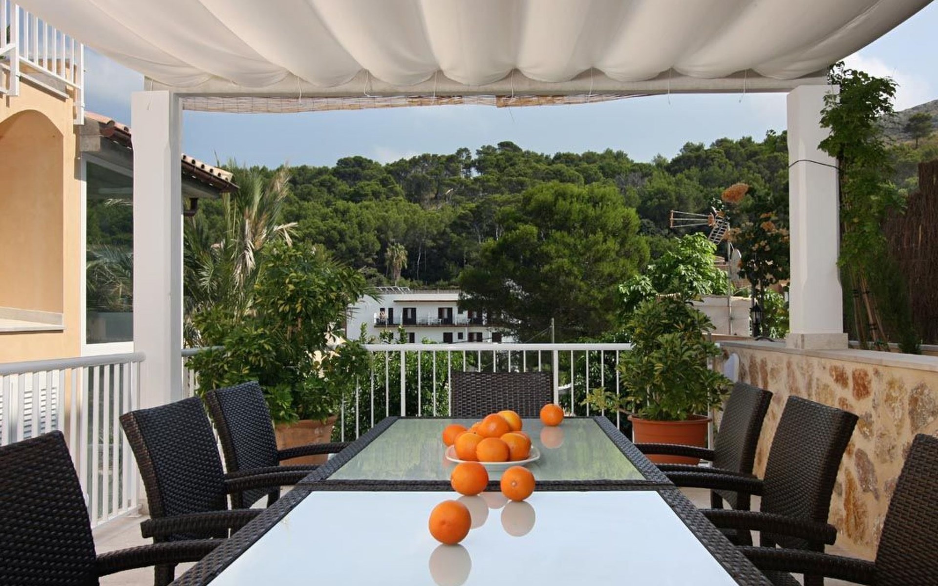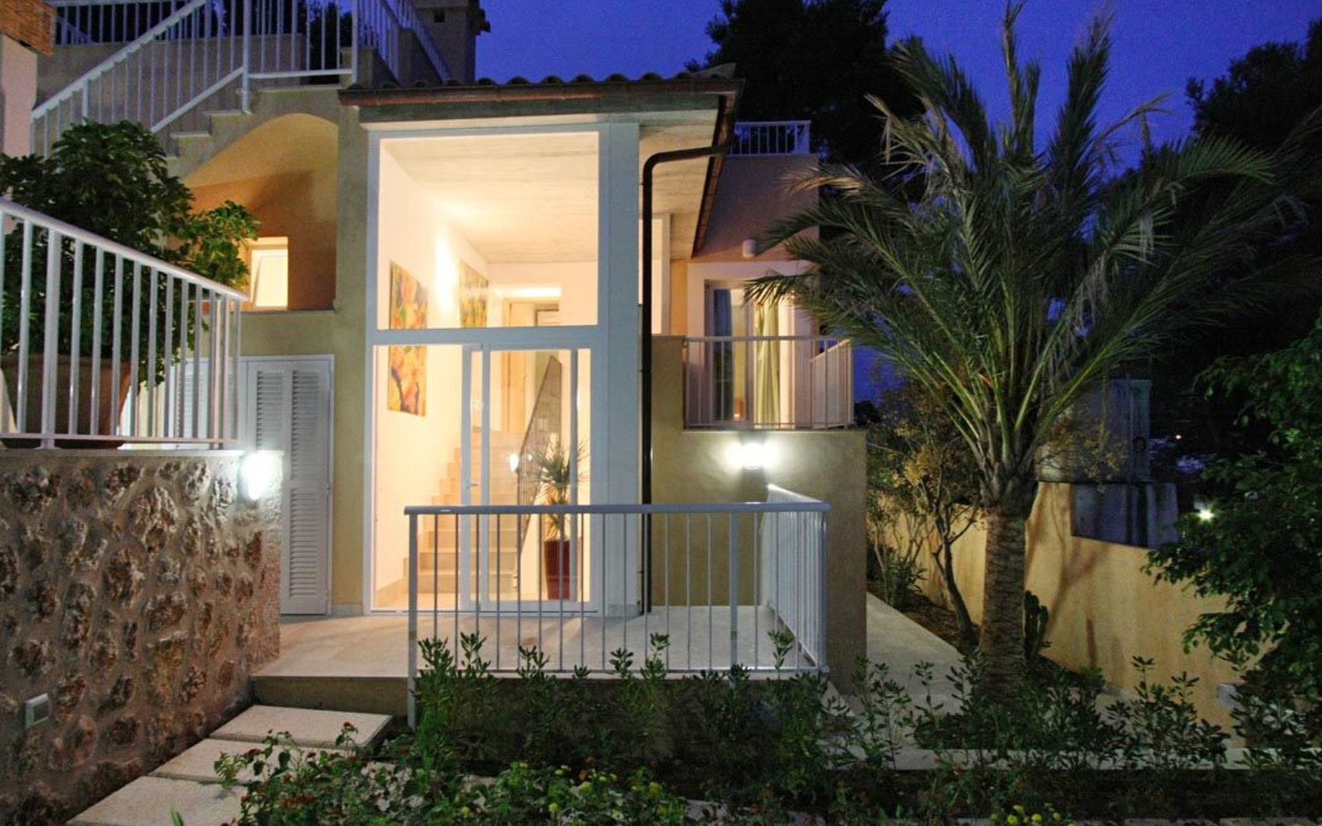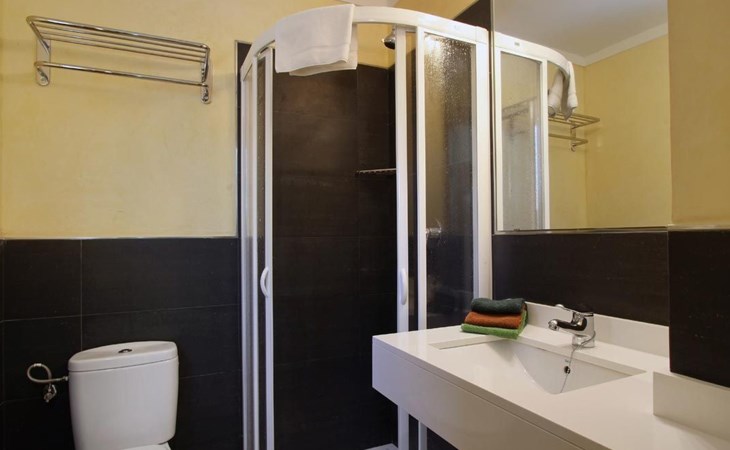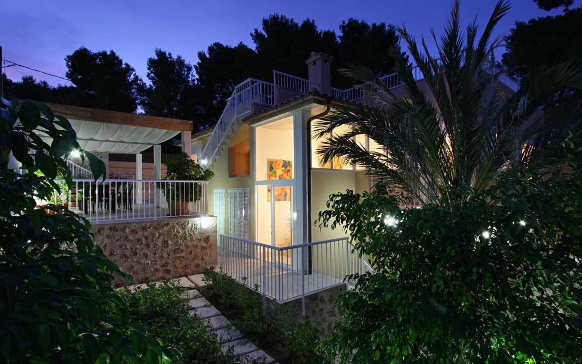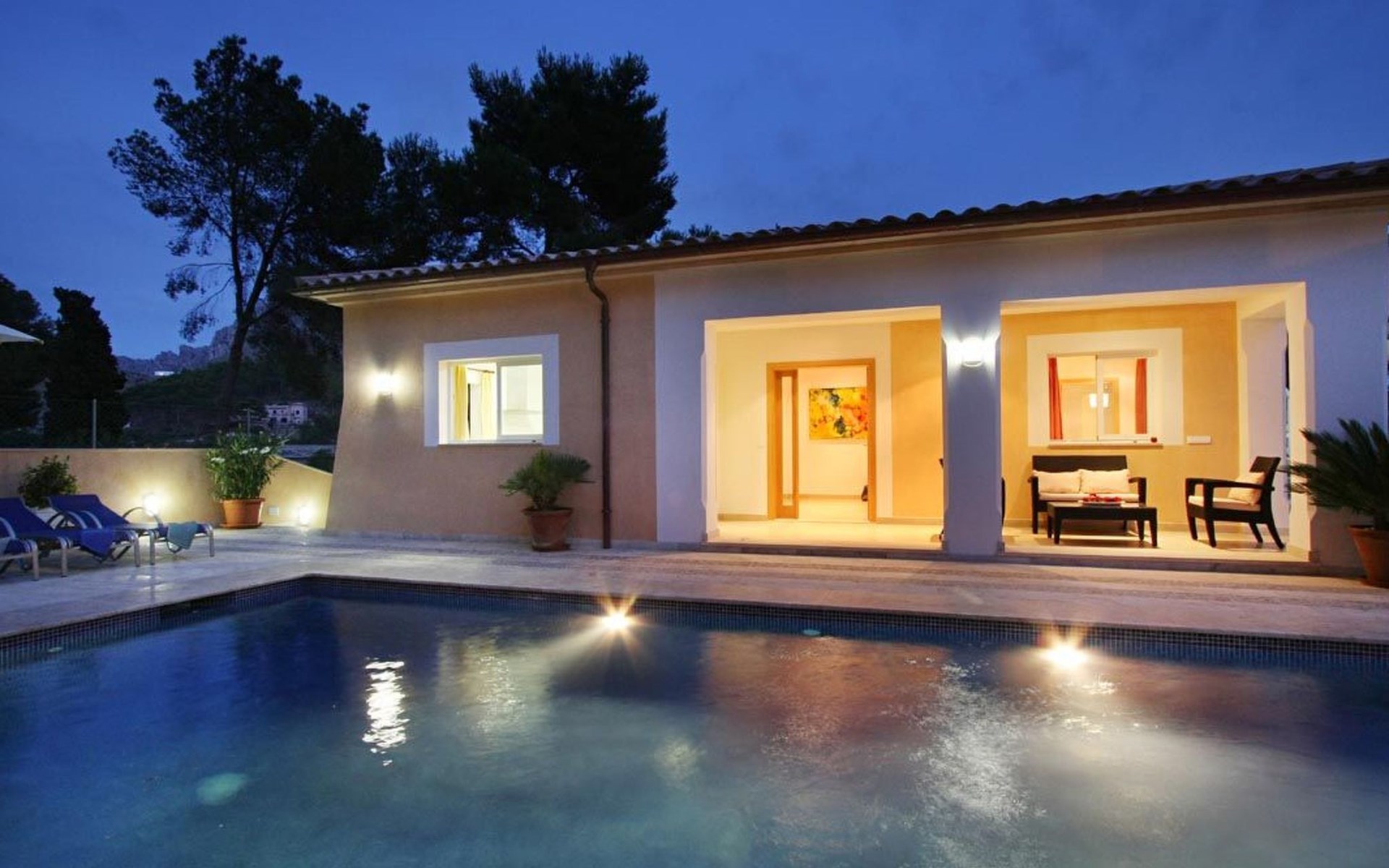 Das Haus ist schön dekoriert und eingerichtet. Von der Straße aus gelangt man über eine Treppe auf das Grundstück. Der Haupteingang befindet sich unter einer kleinen überdachten Terrasse und führt direkt in einen kleinen Saal, der als Diele dient. Auf der linken Seite der Halle befinden sich das Esszimmer, das Wohnzimmer und die Küche. Das Wohnzimmer ist sehr geräumig und zeichnet sich durch seine großen Fenster aus, die ihm eine große Helligkeit und einen schönen Blick bis zum Meer verleihen. Es ist mit drei Sofas, Plasma-TV, Satellit, DVD und Klimaanlage ausgestattet. Das Esszimmer ist ebenfalls geräumig und hell. Es hat einen schönen dunklen Holztisch und weiße Lederstühle. Die Küche ist modern und komfortabel. Sie ist komplett ausgestattet mit Cerankochfeld, Elektroofen, Dunstabzugshaube, Mikrowelle, Geschirrspüler, Kühl-/Gefrierschrank und sogar Klimaanlage. Die Küche hat auch einen Ausgang nach draußen, der direkt zum Poolbereich und den Terrassen führt. Auf der rechten Seite des Flurs befinden sich die vier Schlafzimmer sowie ein Gäste-WC. Zwei dieser Schlafzimmer (ein Doppel- und ein Zweibettzimmer) befinden sich im Erdgeschoss des Hauses. Die anderen beiden Schlafzimmer sind ebenfalls ein Doppel- und ein Zweibettzimmer. Jedes der vier Schlafzimmer hat ein eigenes Badezimmer (eines davon mit Badewanne und die anderen drei mit Dusche). Alle Schlafzimmer sind mit Einbauschränken und Klimaanlage/Wärmepumpe ausgestattet, was Casa Medina zu einer idealen Wahl sowohl für die heißen Sommermonate als auch für die kühleren Herbst- und Frühlingsmonate macht.