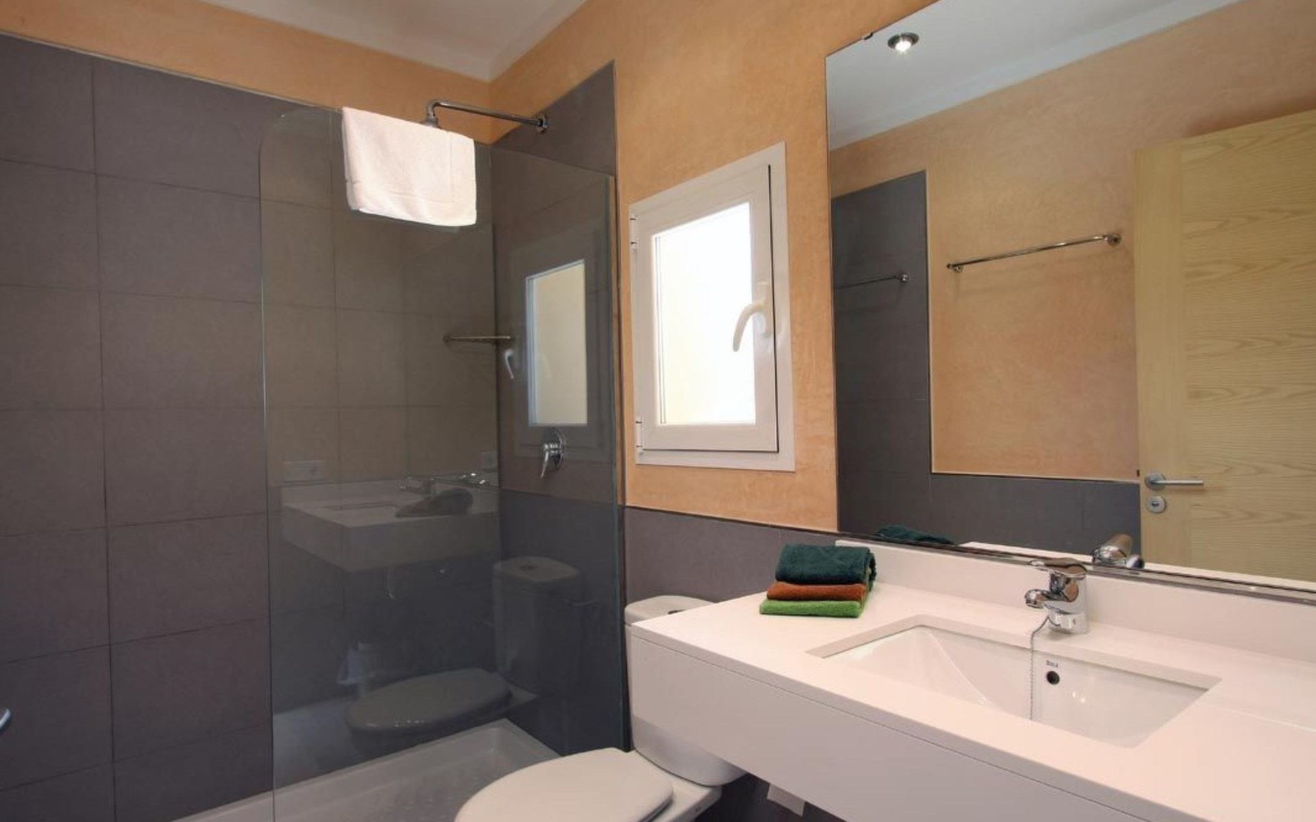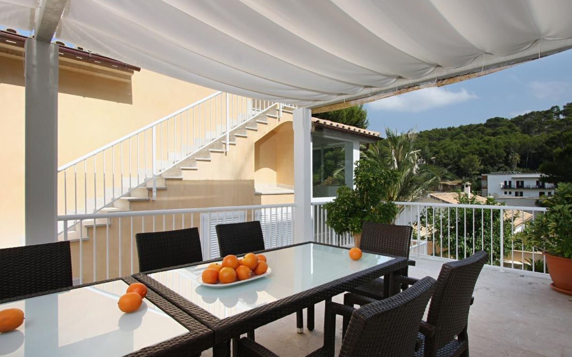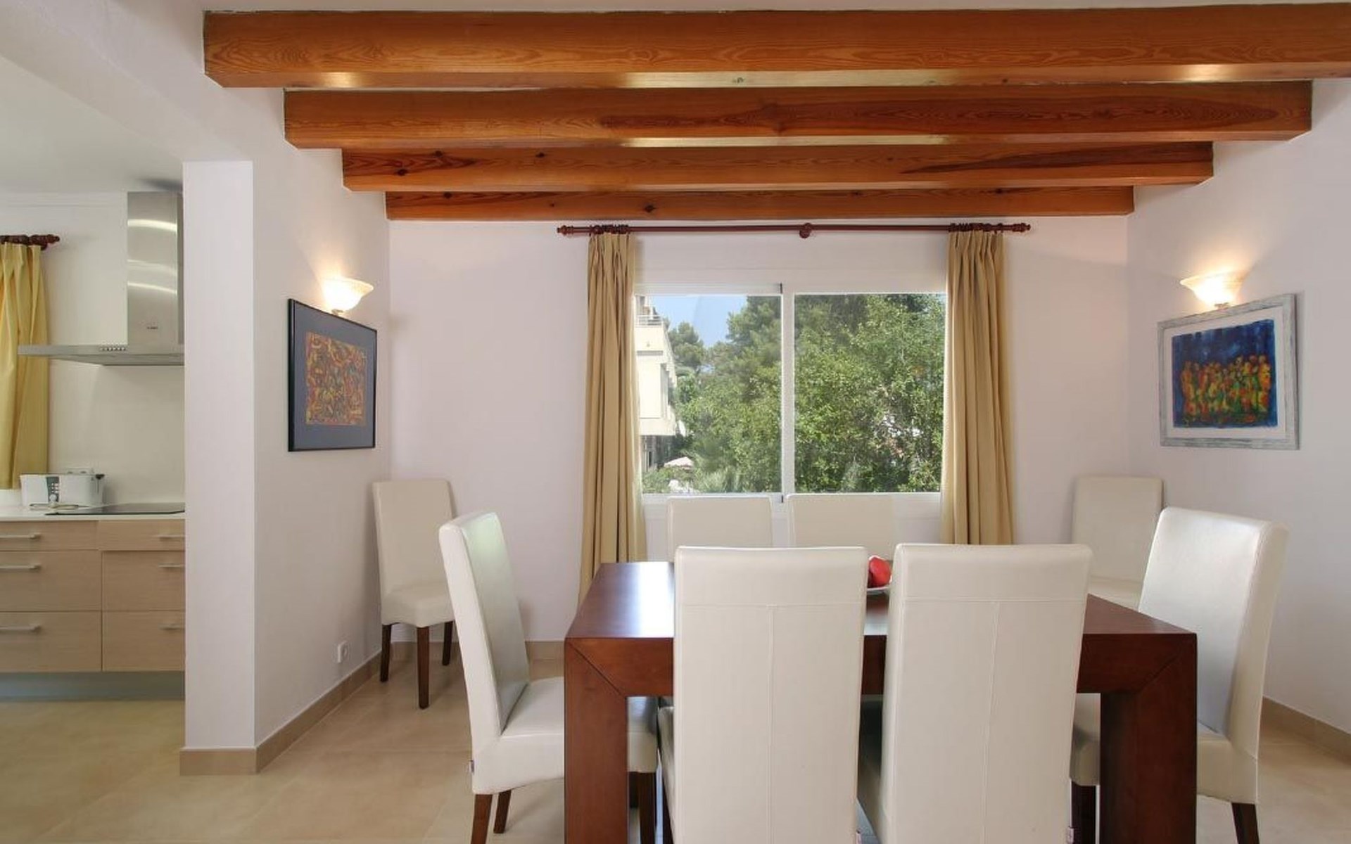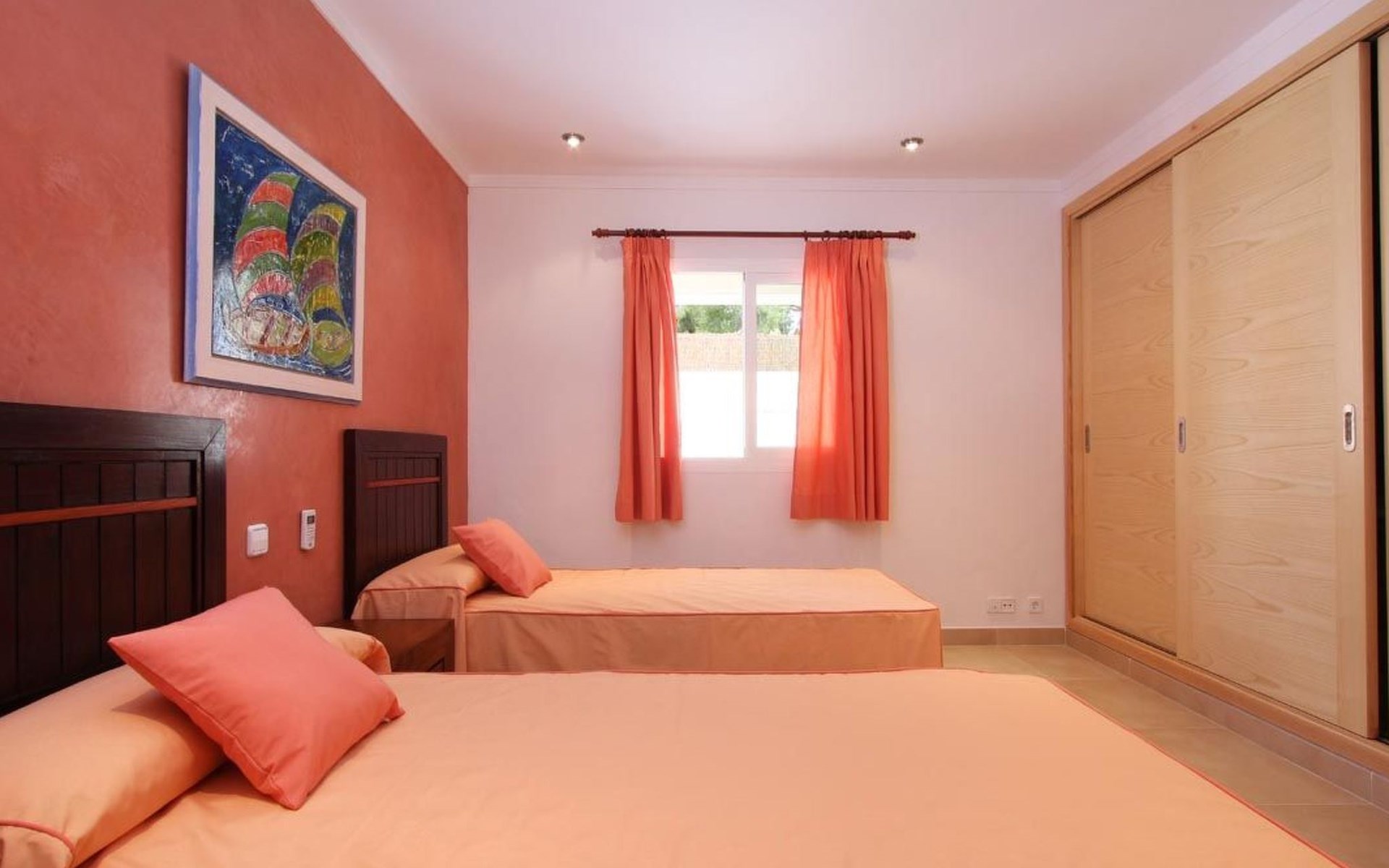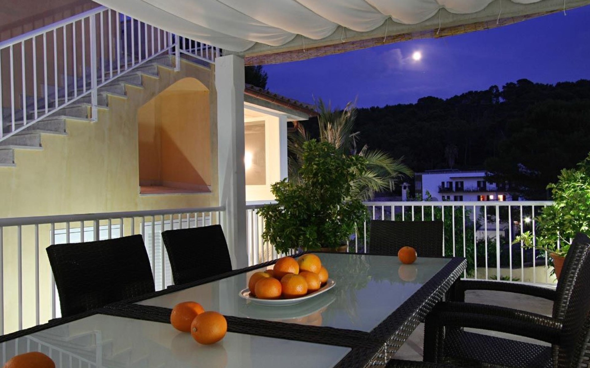 Das Haus ist schön dekoriert und eingerichtet. Von der Straße aus gelangt man über eine Treppe auf das Grundstück. Der Haupteingang befindet sich unter einer kleinen überdachten Terrasse und führt direkt in einen kleinen Saal, der als Diele dient. Auf der linken Seite der Halle befinden sich das Esszimmer, das Wohnzimmer und die Küche. Das Wohnzimmer ist sehr geräumig und zeichnet sich durch seine großen Fenster aus, die ihm eine große Helligkeit und einen schönen Blick bis zum Meer verleihen. Es ist mit drei Sofas, Plasma-TV, Satellit, DVD und Klimaanlage ausgestattet. Das Esszimmer ist ebenfalls geräumig und hell. Es hat einen schönen dunklen Holztisch und weiße Lederstühle. Die Küche ist modern und komfortabel. Sie ist komplett ausgestattet mit Cerankochfeld, Elektroofen, Dunstabzugshaube, Mikrowelle, Geschirrspüler, Kühl-/Gefrierschrank und sogar Klimaanlage. Die Küche hat auch einen Ausgang nach draußen, der direkt zum Poolbereich und den Terrassen führt. Auf der rechten Seite des Flurs befinden sich die vier Schlafzimmer sowie ein Gäste-WC. Zwei dieser Schlafzimmer (ein Doppel- und ein Zweibettzimmer) befinden sich im Erdgeschoss des Hauses. Die anderen beiden Schlafzimmer sind ebenfalls ein Doppel- und ein Zweibettzimmer. Jedes der vier Schlafzimmer hat ein eigenes Badezimmer (eines davon mit Badewanne und die anderen drei mit Dusche). Alle Schlafzimmer sind mit Einbauschränken und Klimaanlage/Wärmepumpe ausgestattet, was Casa Medina zu einer idealen Wahl sowohl für die heißen Sommermonate als auch für die kühleren Herbst- und Frühlingsmonate macht.