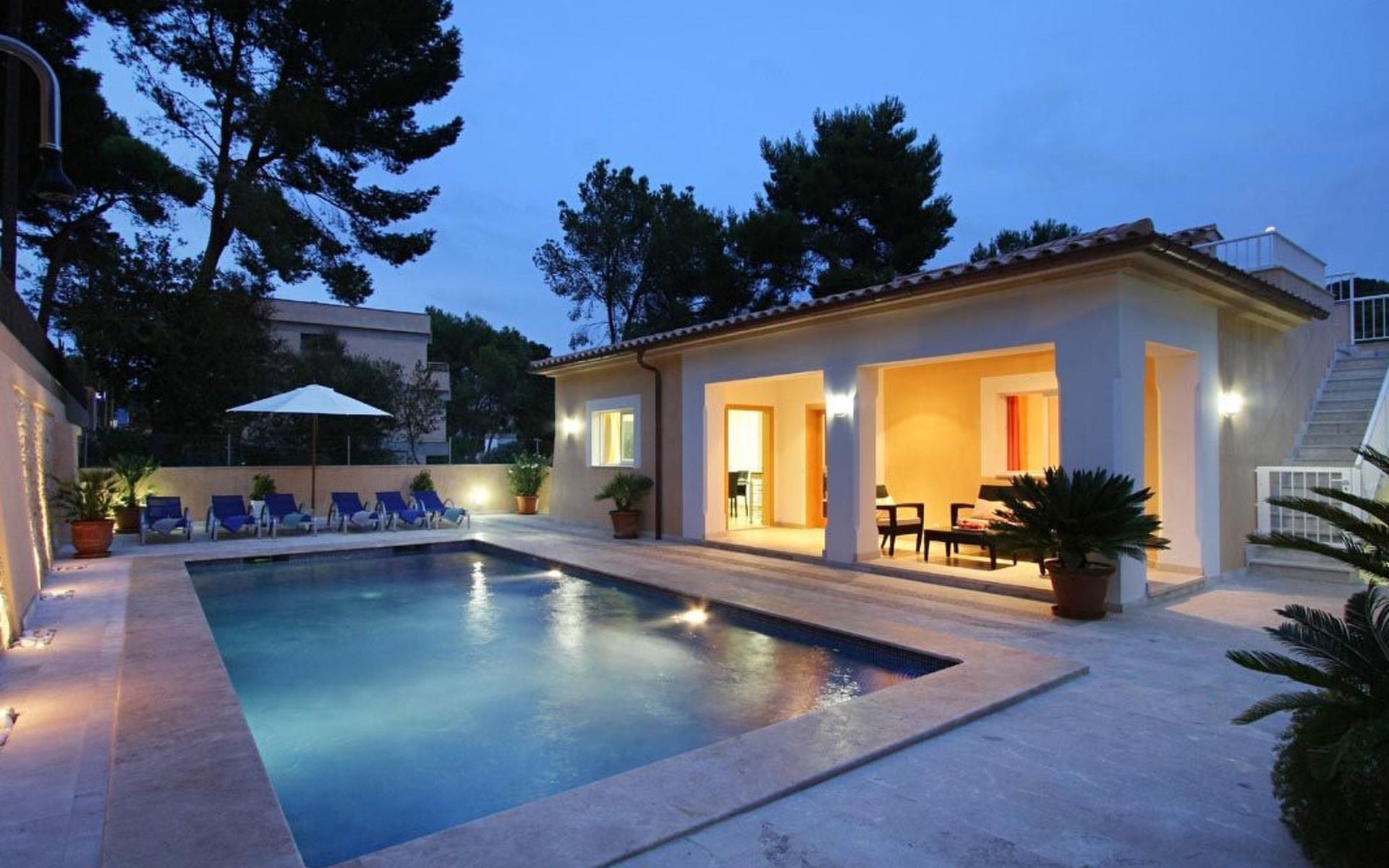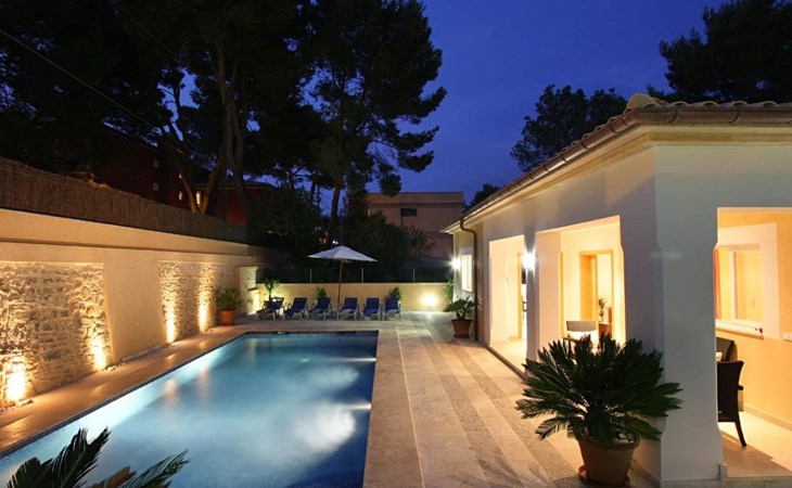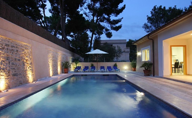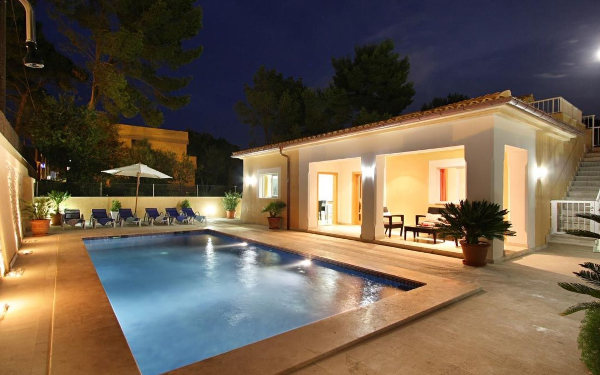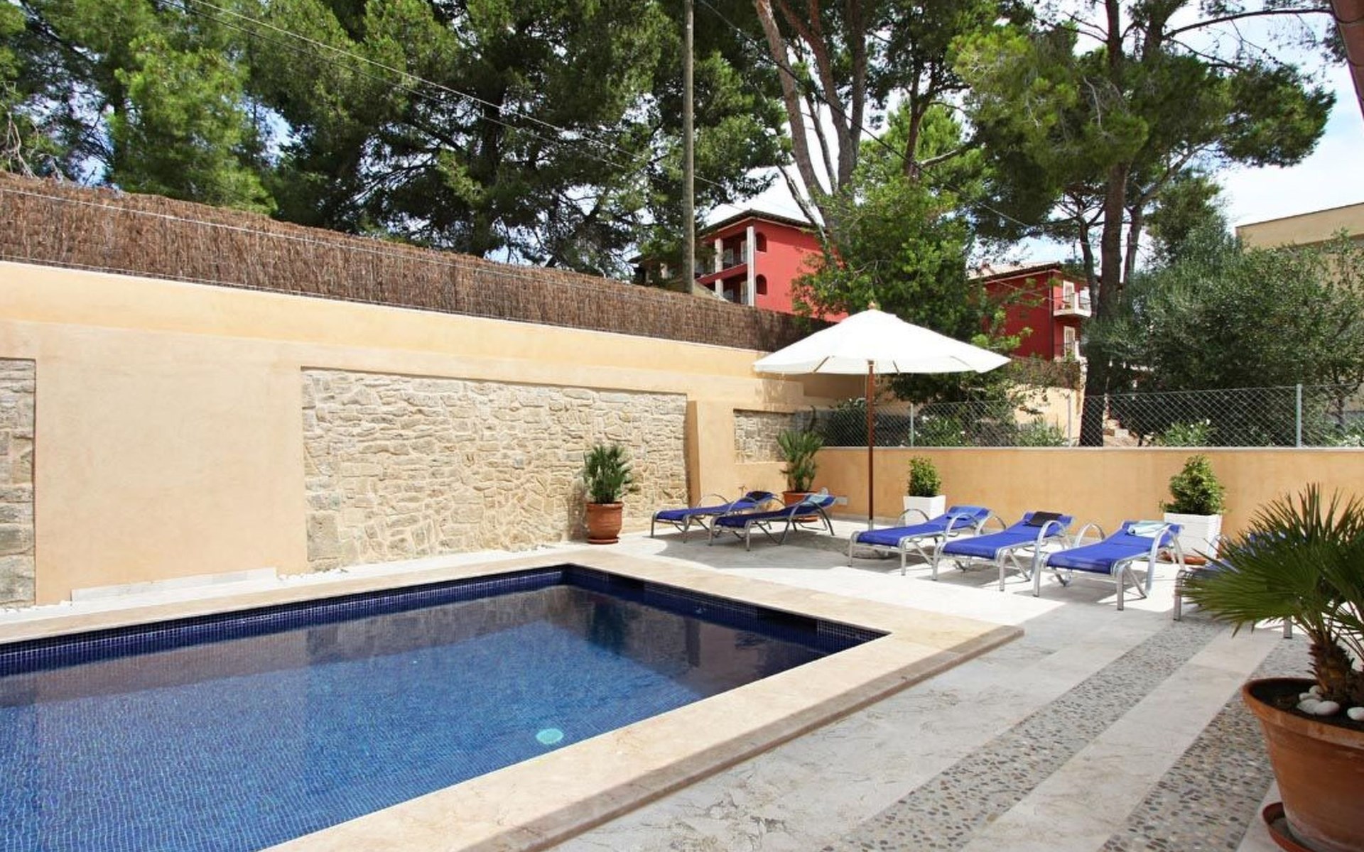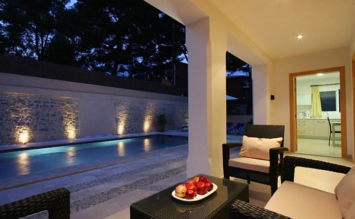 Der Außenbereich des Hauses ist ebenfalls sehr schön gestaltet und verfügt über einen schönen Swimmingpool im römischen Stil (mit einer Treppe), eine Außendusche, eine offene Terrasse, die ideal zum Sonnenbaden ist, und eine weitere, die von einer originellen Pergola überdacht ist und ideal für Abendessen im Freien ist. Nachts fällt das schöne Lichtspiel im Poolbereich auf, durch das der Pool und die schöne Kopfsteinpflaster-Mauer eine andere Dimension und Textur zu bekommen scheinen.