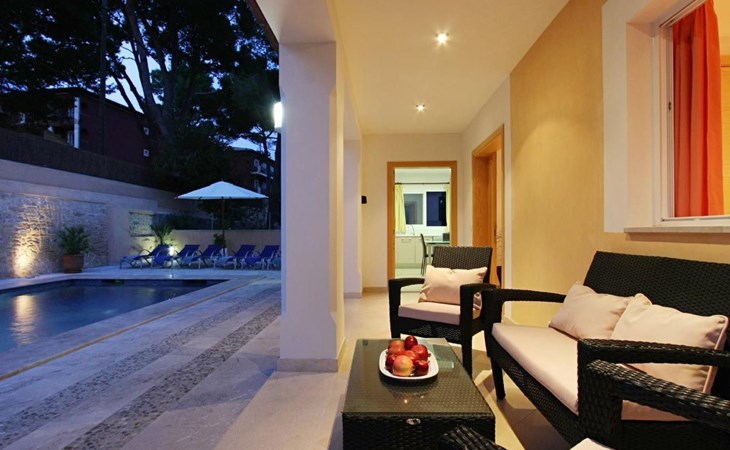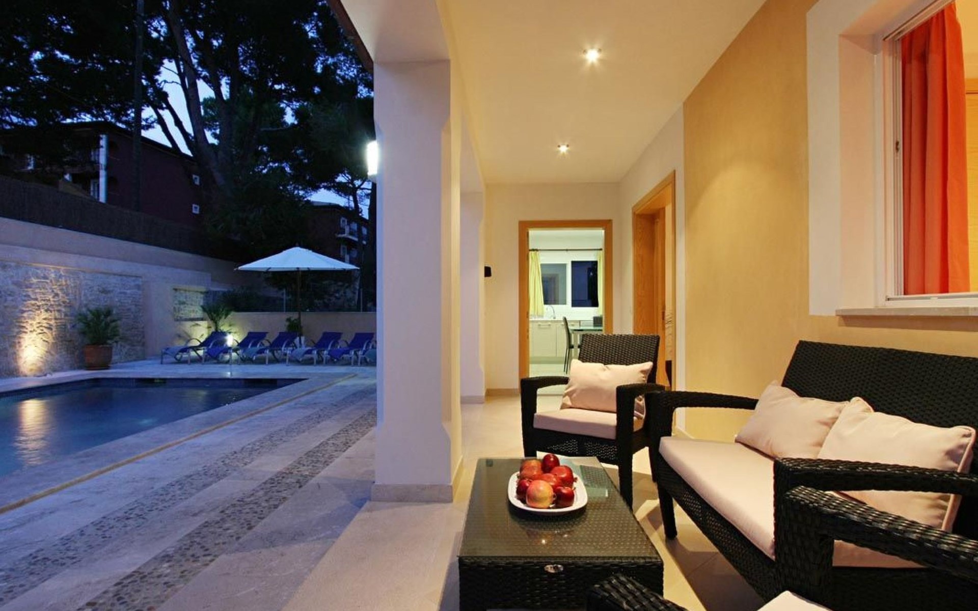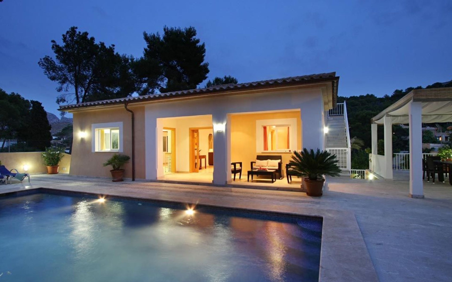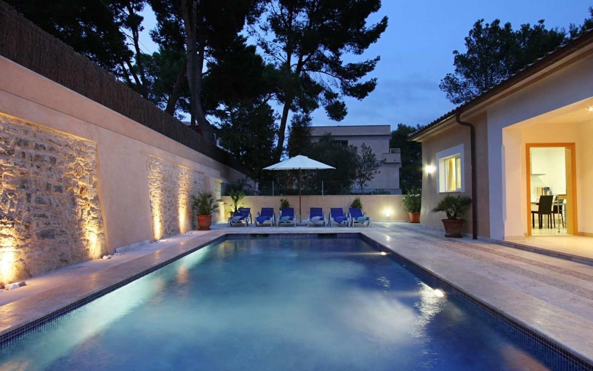Der Außenbereich des Hauses ist ebenfalls sehr schön gestaltet und verfügt über einen schönen Swimmingpool im römischen Stil (mit einer Treppe), eine Außendusche, eine offene Terrasse, die ideal zum Sonnenbaden ist, und eine weitere, die von einer originellen Pergola überdacht ist und ideal für Abendessen im Freien ist. Nachts fällt das schöne Lichtspiel im Poolbereich auf, durch das der Pool und die schöne Kopfsteinpflaster-Mauer eine andere Dimension und Textur zu bekommen scheinen.