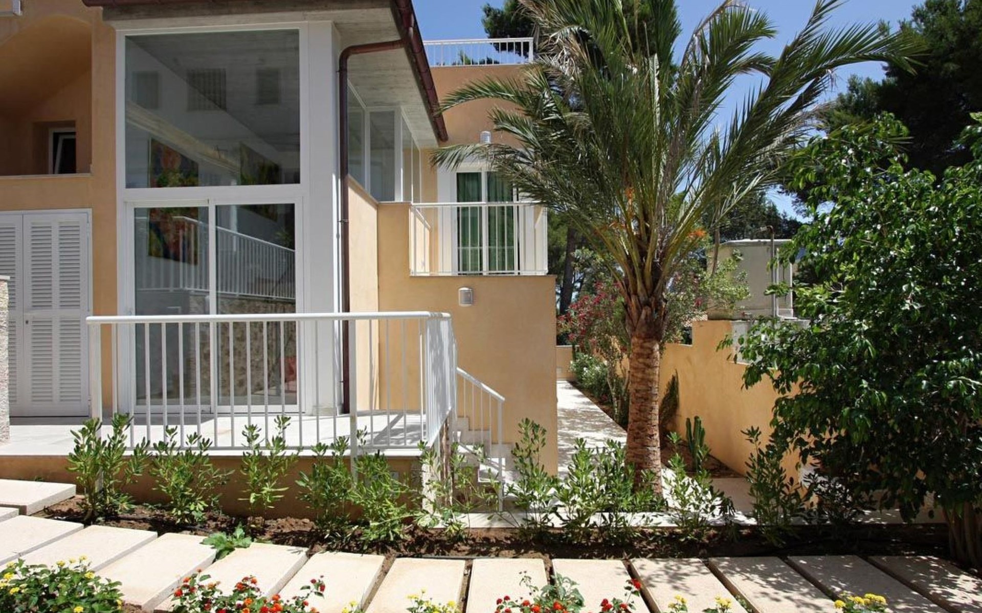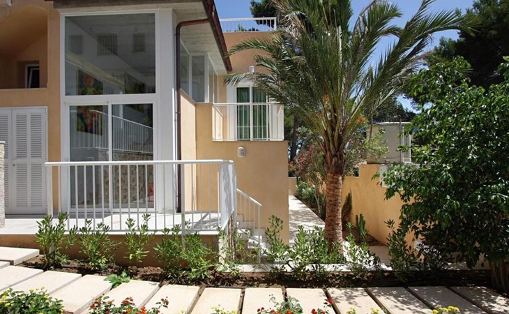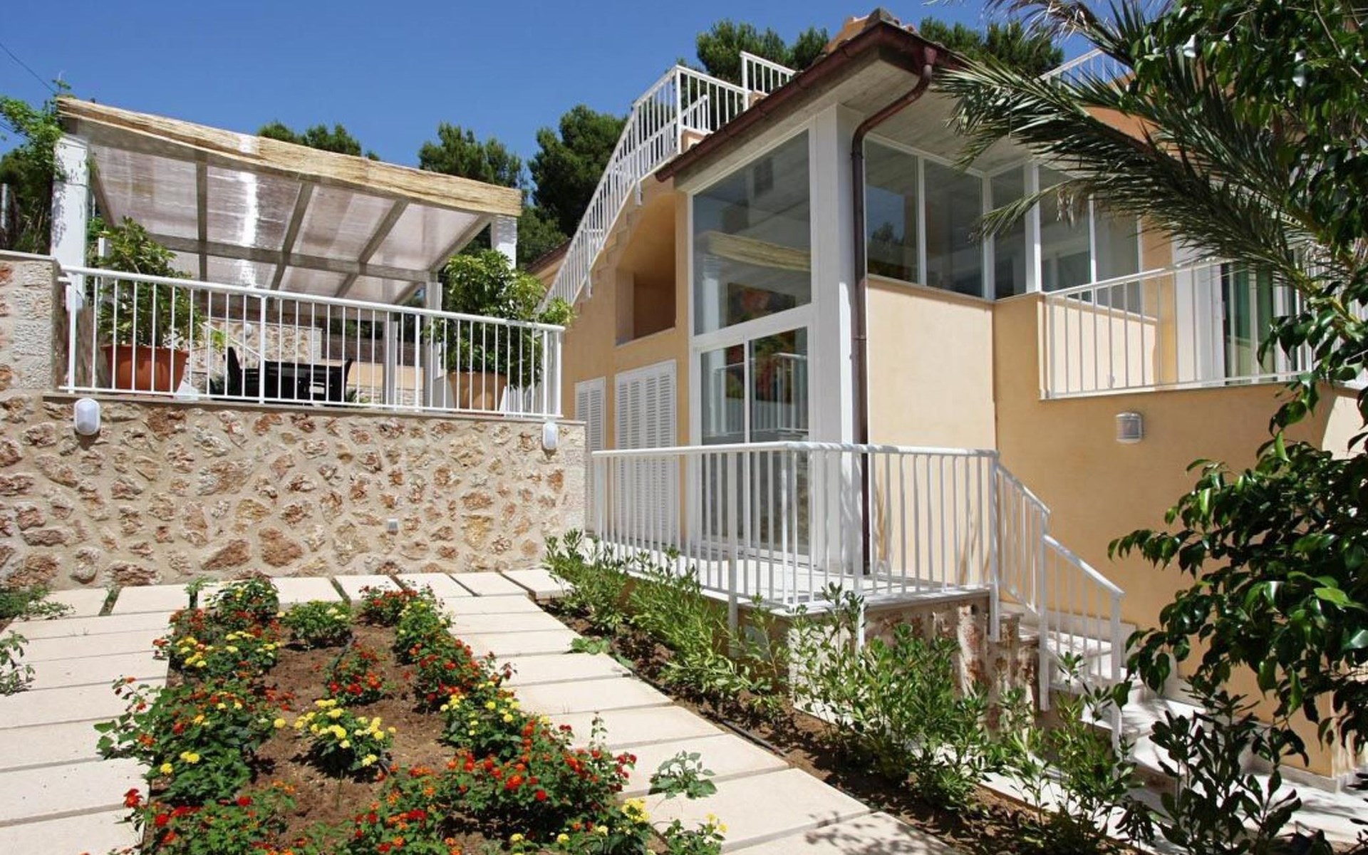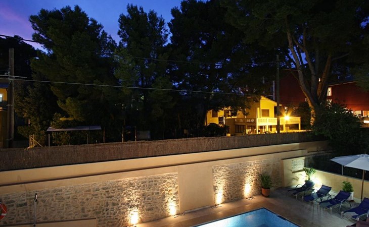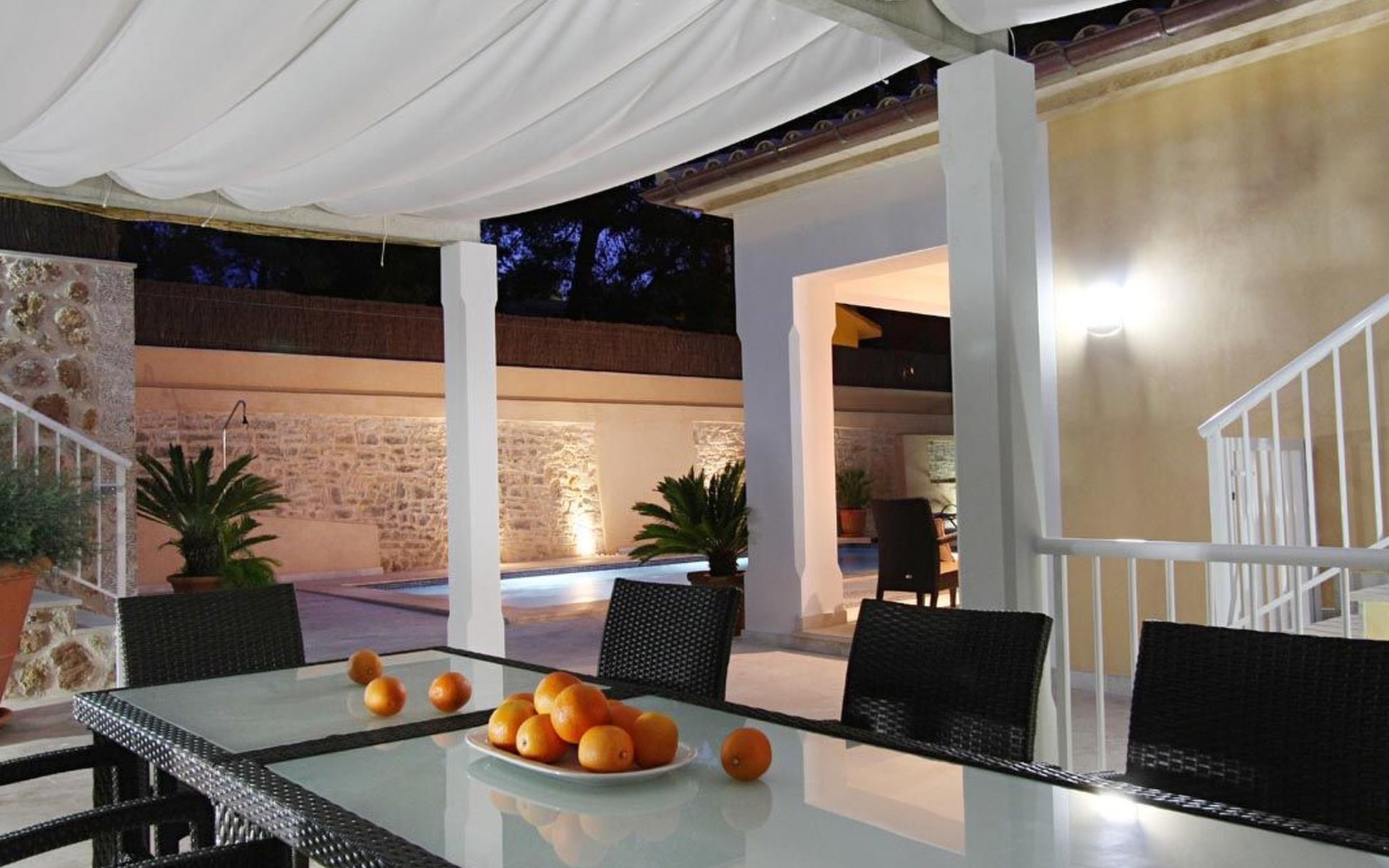 Der Außenbereich des Hauses ist ebenfalls sehr schön gestaltet und verfügt über einen schönen Swimmingpool im römischen Stil (mit einer Treppe), eine Außendusche, eine offene Terrasse, die ideal zum Sonnenbaden ist, und eine weitere, die von einer originellen Pergola überdacht ist und ideal für Abendessen im Freien ist. Nachts fällt das schöne Lichtspiel im Poolbereich auf, durch das der Pool und die schöne Kopfsteinpflaster-Mauer eine andere Dimension und Textur zu bekommen scheinen.