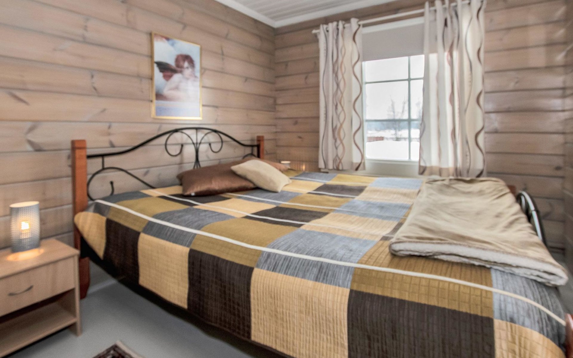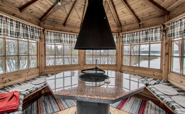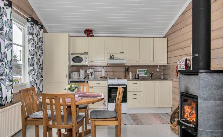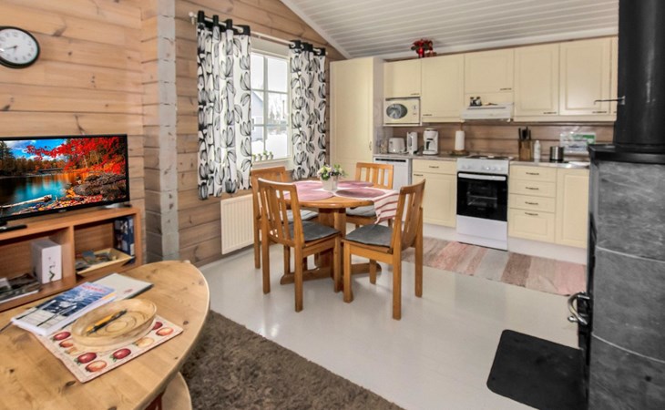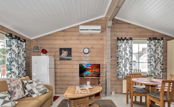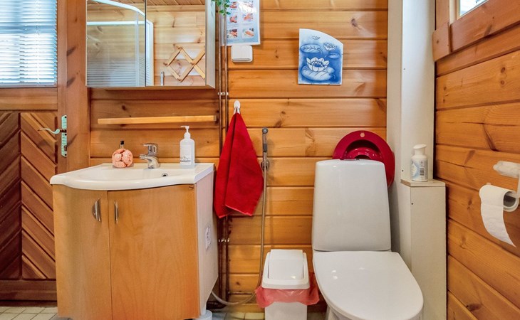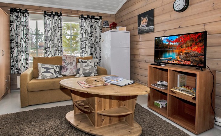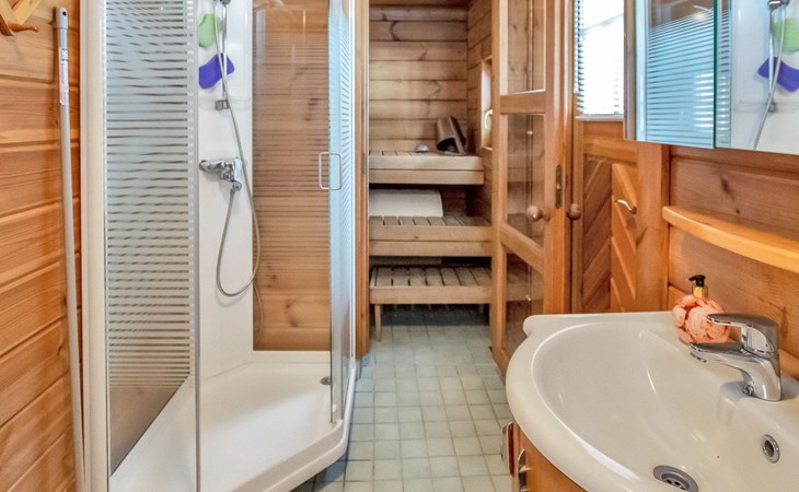 The cabin has a bedroom with double bed. Living room/kitchen, heat reserving fireplace, air source heat pump, spreadable sofa bed in the living room. There is an electric sauna, shower cubicle and toilet in the washroom in the same building.