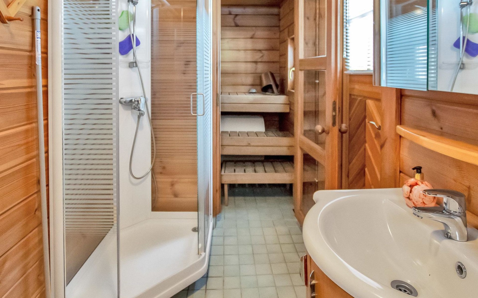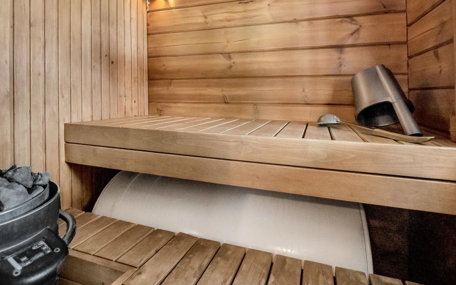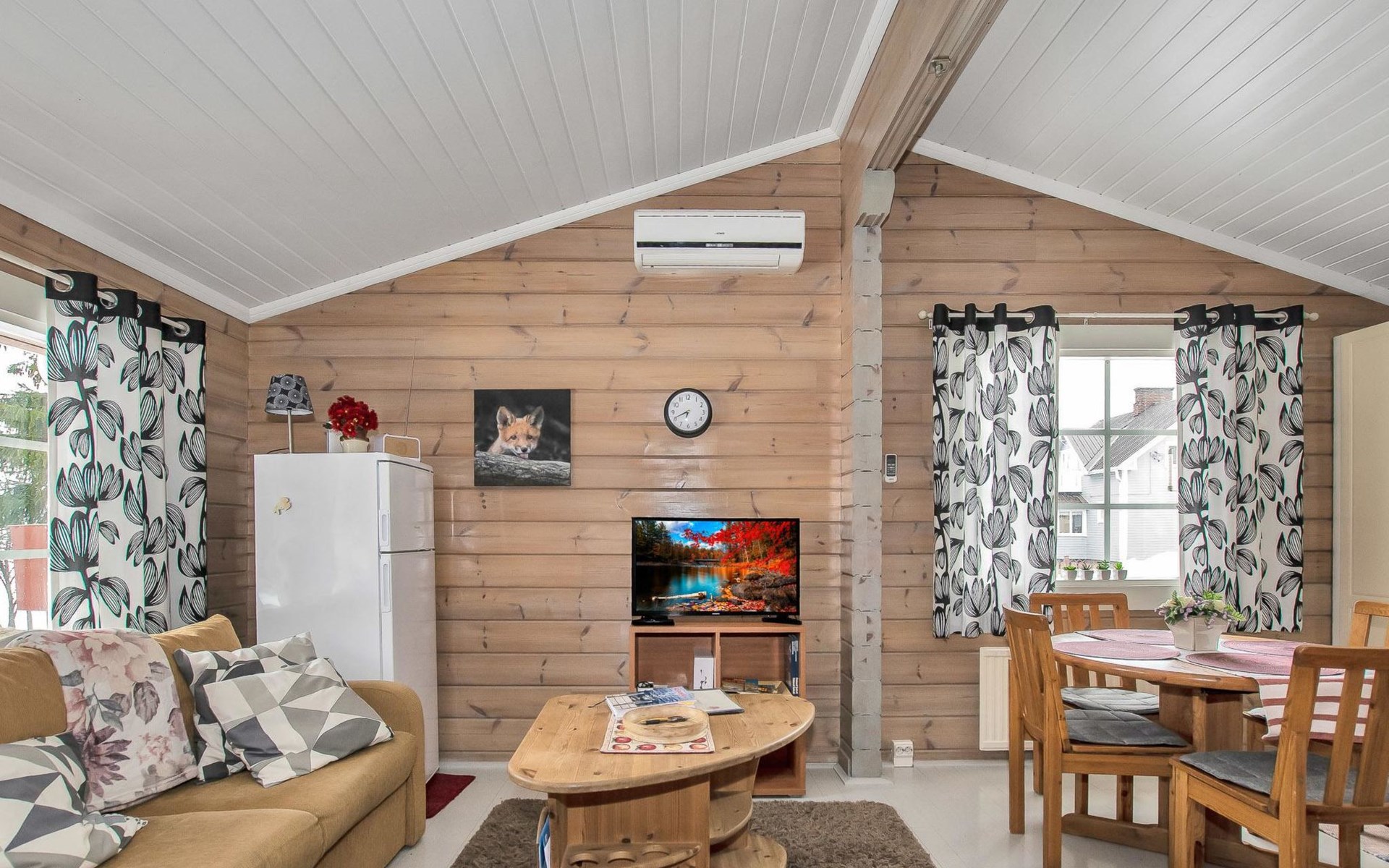The cabin has a bedroom with double bed. Living room/kitchen, heat reserving fireplace, air source heat pump, spreadable sofa bed in the living room. There is an electric sauna, shower cubicle and toilet in the washroom in the same building.