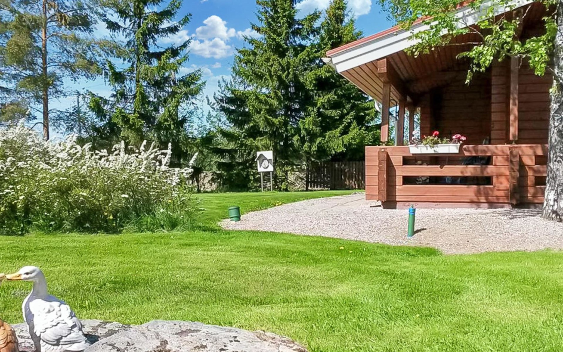 The front yard is covered with lawn, tiled walking path to the stairs leading to the beach. There is a pier on the beach, access to swim from the pier. In summer, there is garden furniture in the yard.