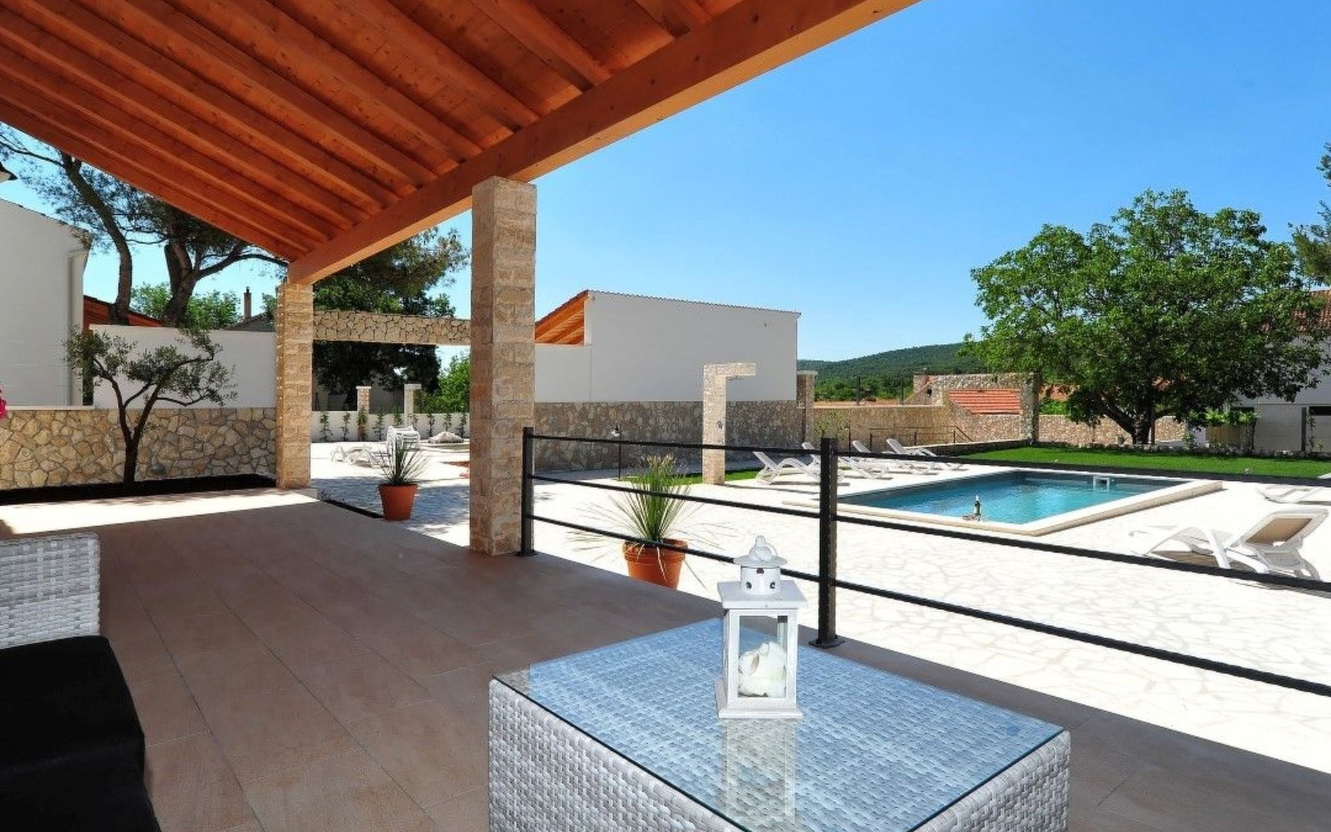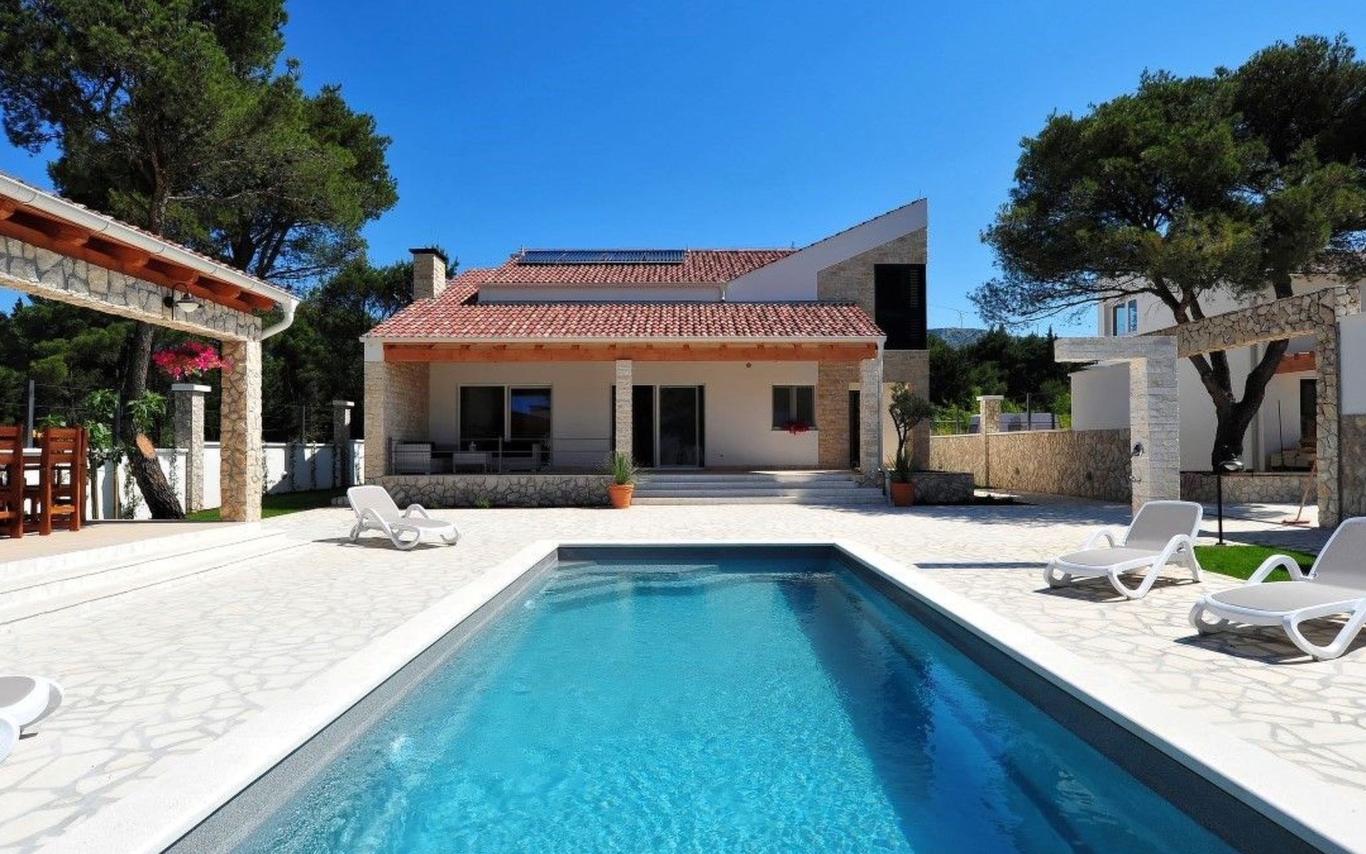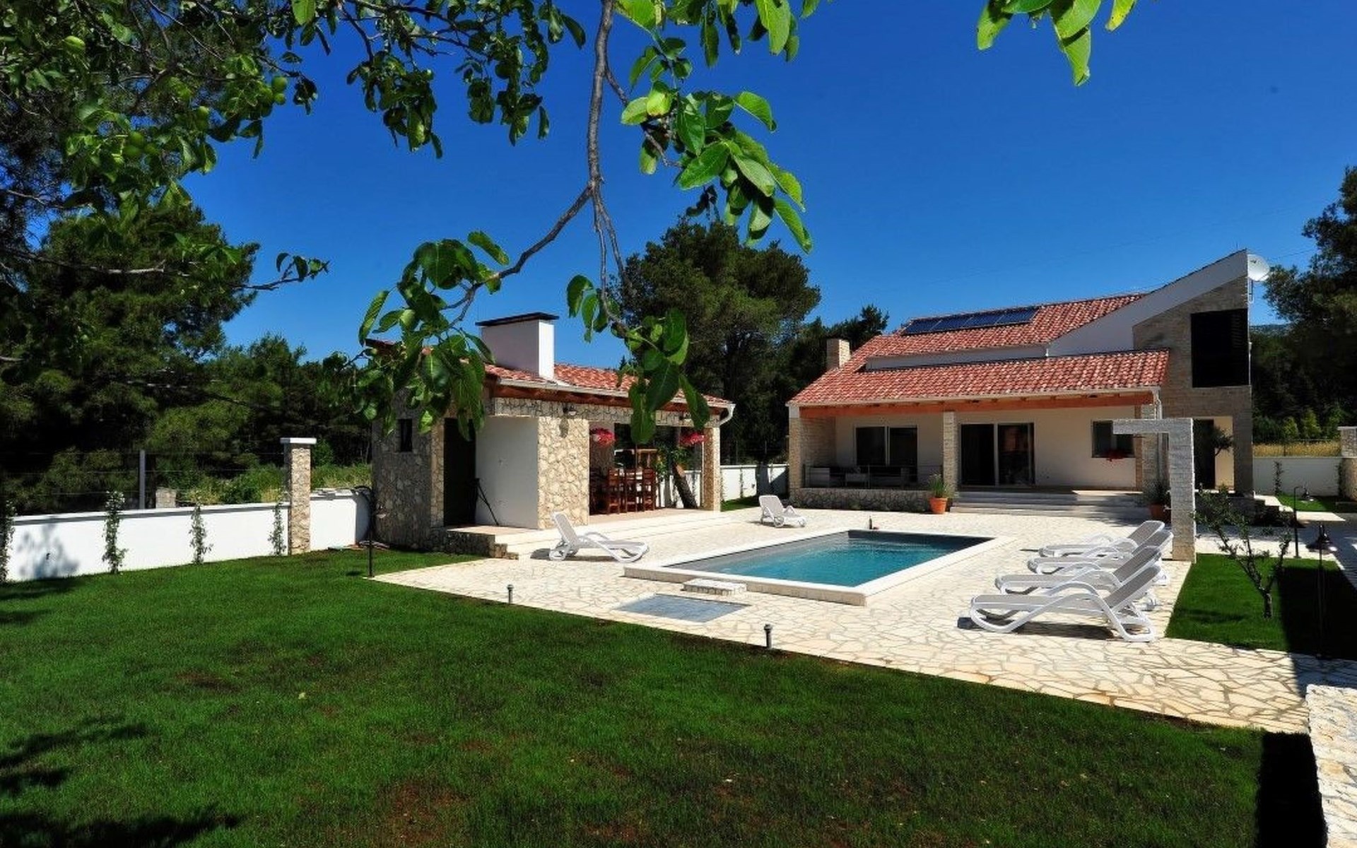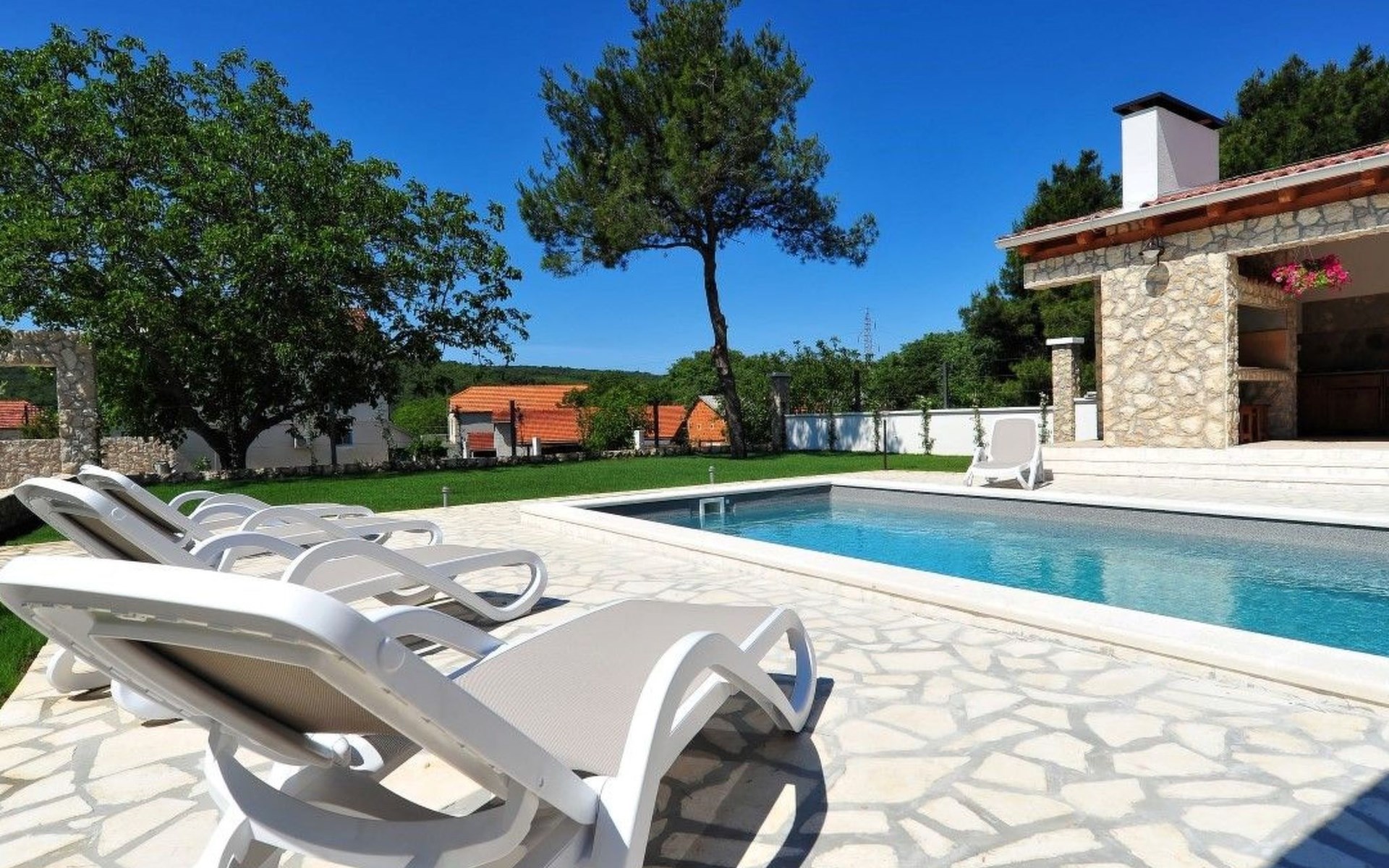 Der Außenbereich der Villa ist ein echtes Highlight und bietet den Gästen ihre eigene private Oase. Das Herzstück ist der atemberaubende Swimmingpool, der an warmen Sommertagen für Abkühlung sorgt und von großzügigen Terrassen umgeben ist, auf denen Sie sich in der Sonne sonnen oder inmitten des wunderschön gepflegten Gartens im Freien speisen können. Dieser Ort ist zum Entspannen und für schöne Erinnerungen im Kreise der Liebsten gedacht.