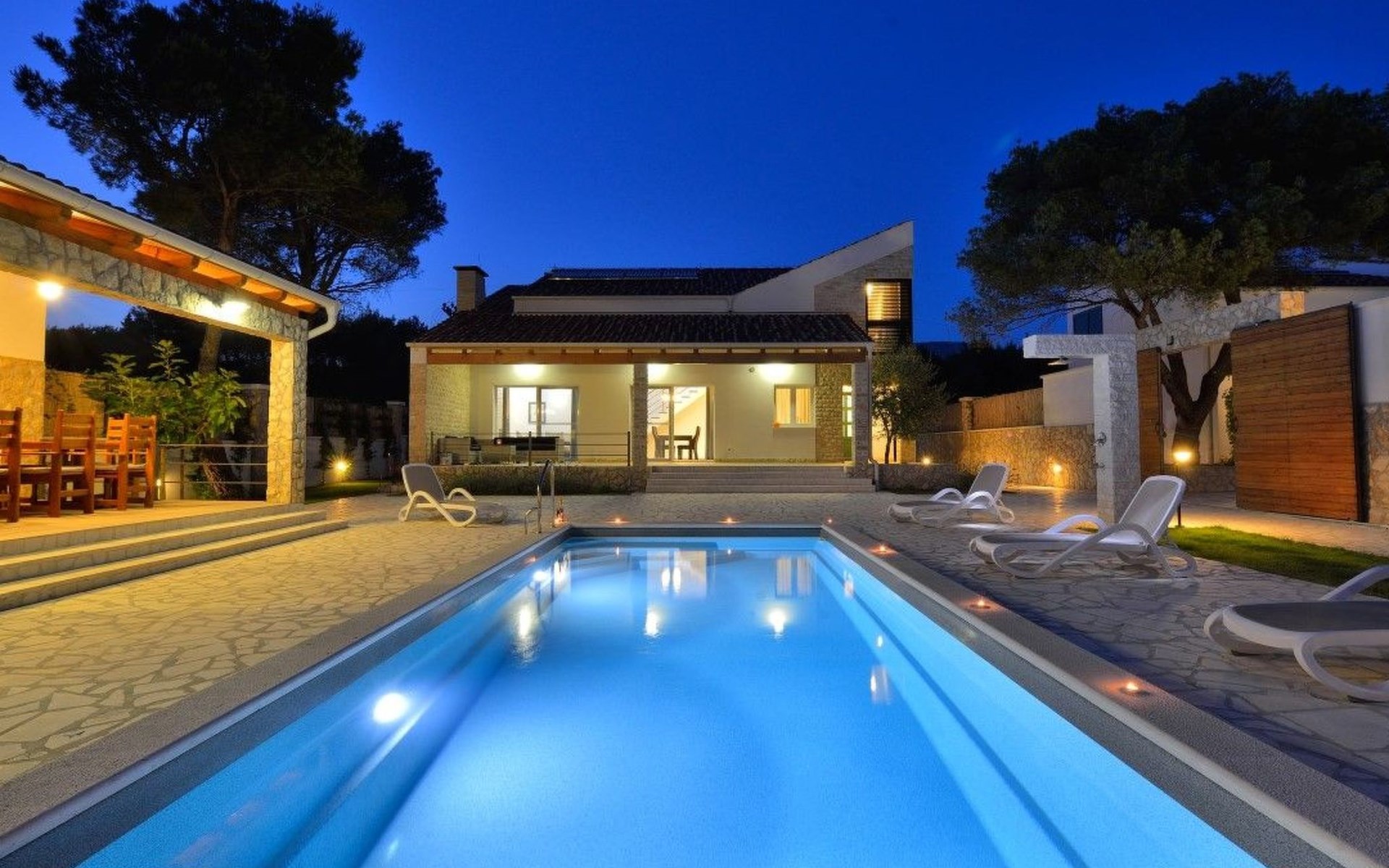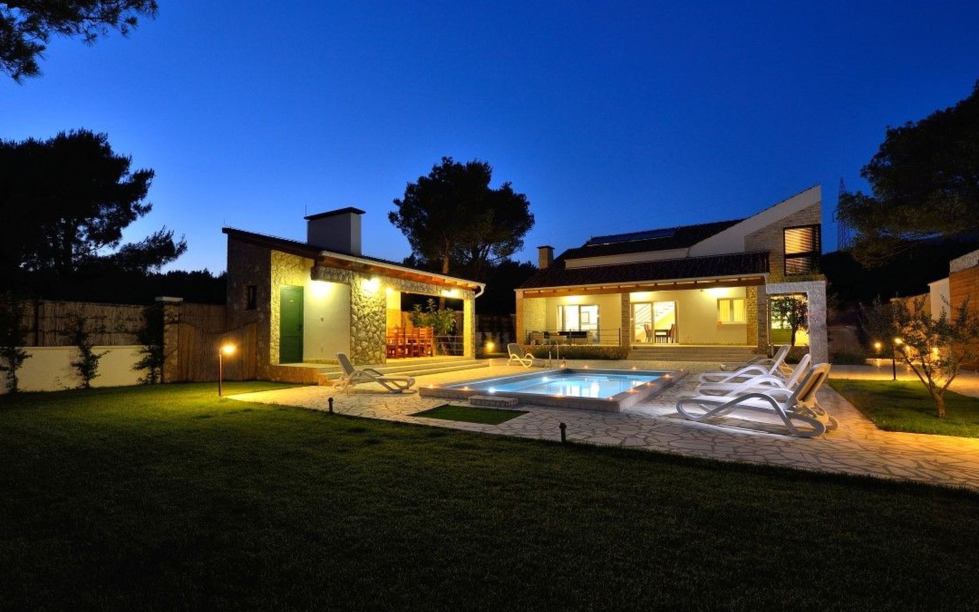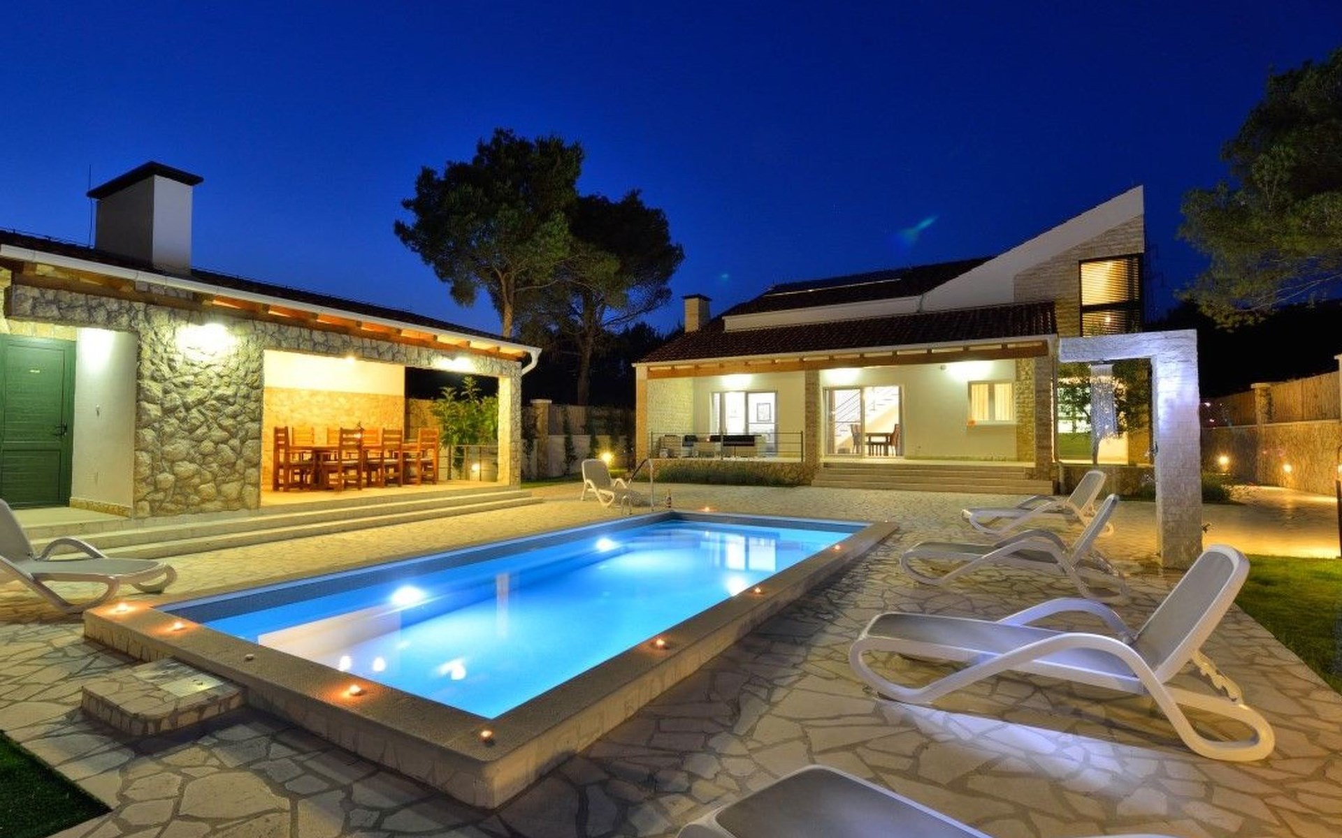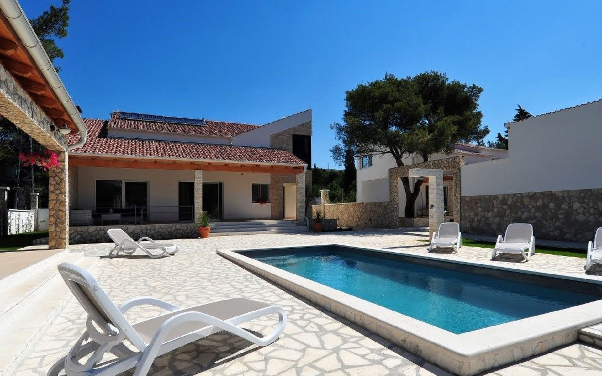 Der Außenbereich der Villa ist ein echtes Highlight und bietet den Gästen ihre eigene private Oase. Das Herzstück ist der atemberaubende Swimmingpool, der an warmen Sommertagen für Abkühlung sorgt und von großzügigen Terrassen umgeben ist, auf denen Sie sich in der Sonne sonnen oder inmitten des wunderschön gepflegten Gartens im Freien speisen können. Dieser Ort ist zum Entspannen und für schöne Erinnerungen im Kreise der Liebsten gedacht.
