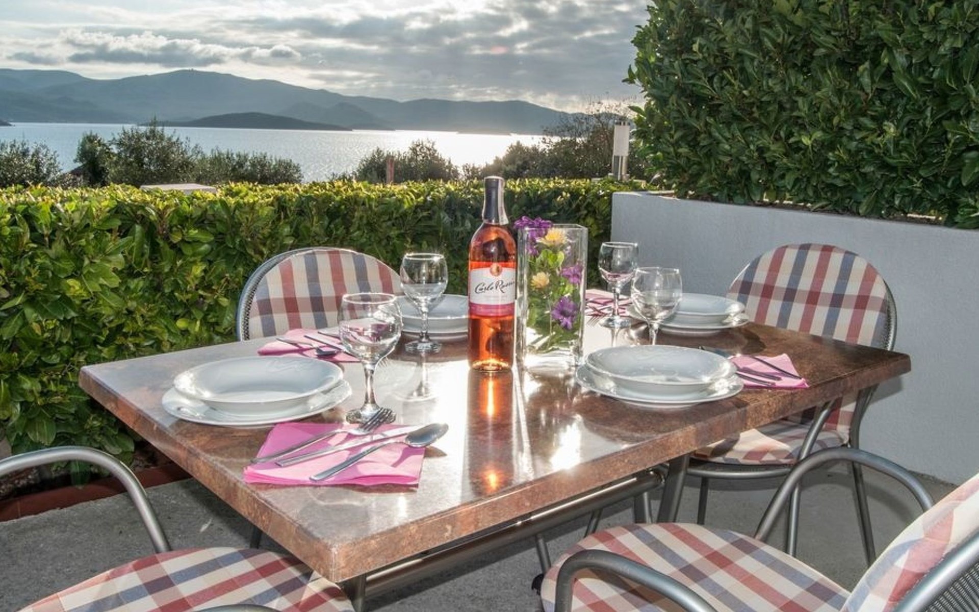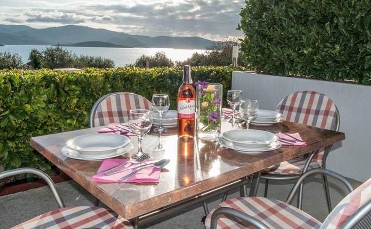 Treten Sie hinaus auf die herrliche Terrasse des Apartments, wo Komfort und Natur aufeinandertreffen. Dieser einladende Platz ist mit Gartenmöbeln, einem Sonnenschirm und zwei Gartenliegen ausgestattet, ideal, um die dalmatinische Sonne zu genießen oder Mahlzeiten im Freien zu sich zu nehmen. Der Gemeinschaftsgarten bietet eine üppige, grüne Kulisse für gemütliche Nachmittage. Außerdem bietet die exklusive Dachterrasse einen ruhigen Ort für private Entspannung, wo Sie in aller Ruhe abschalten können.
