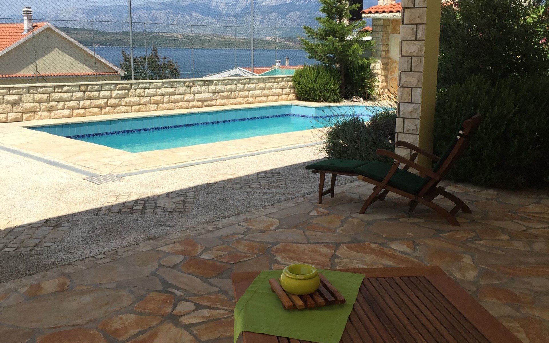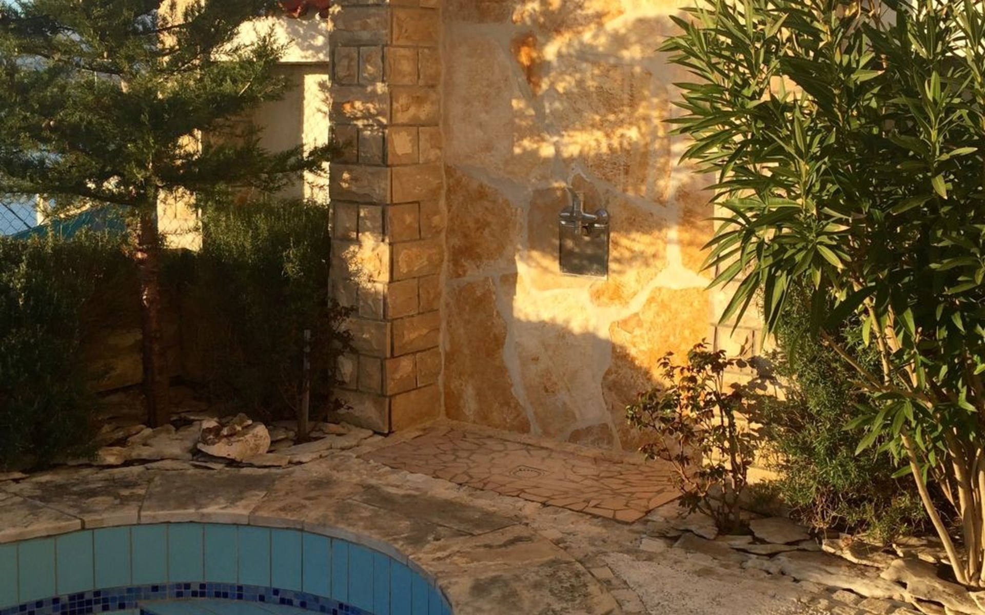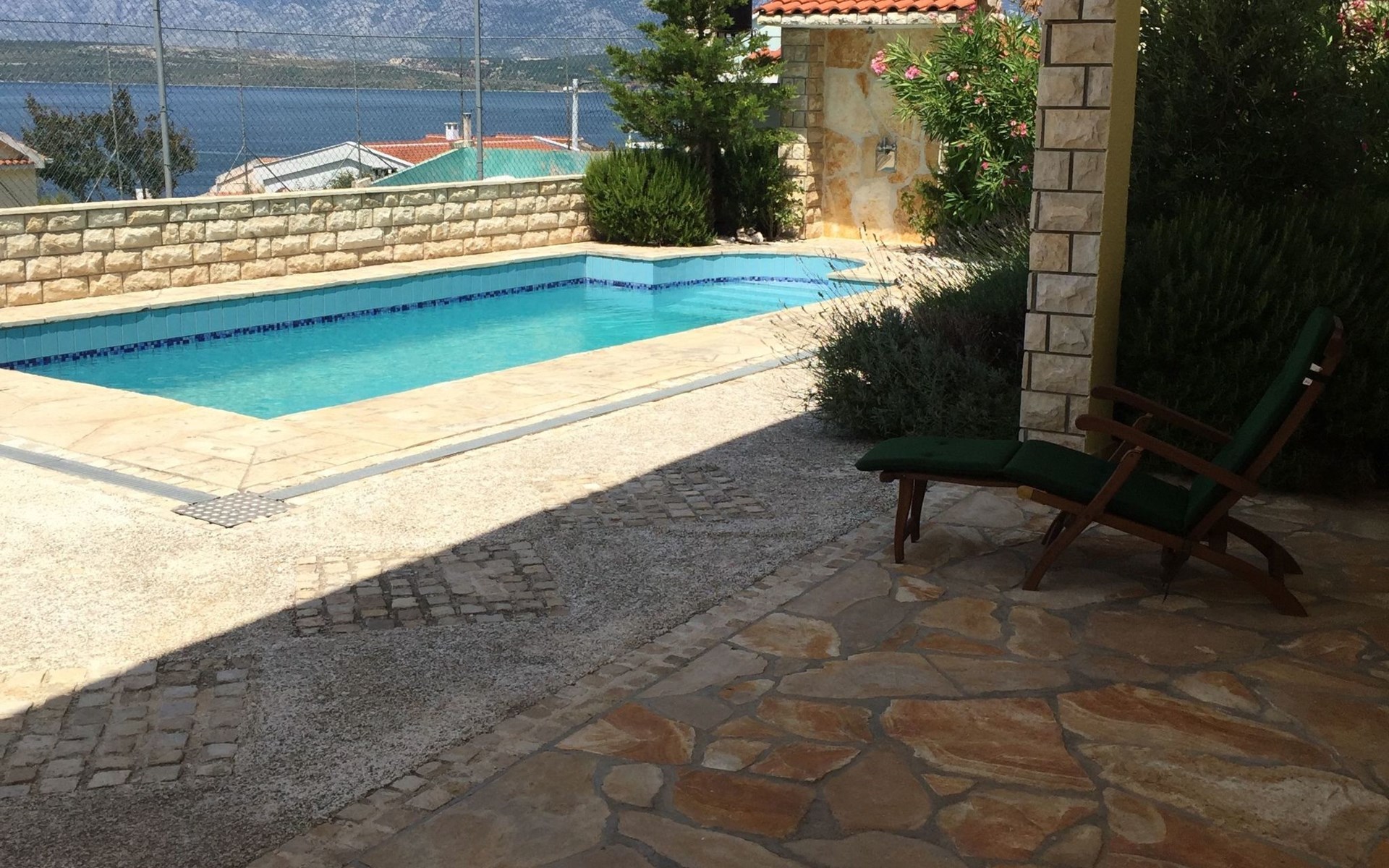 Herzstück des Anwesens ist natürlich der rund 30 m² große Swimmingpool, der zum Sprung ins kühle Nass einlädt. Die Poollandschaft ist mit einer Außendusche ausgestattet. Der Garten der neue Loungebereich und die Grillmöglichkeit darf von allen Gästen genutzt werden.