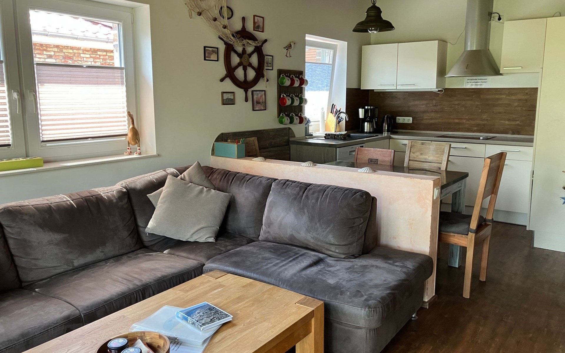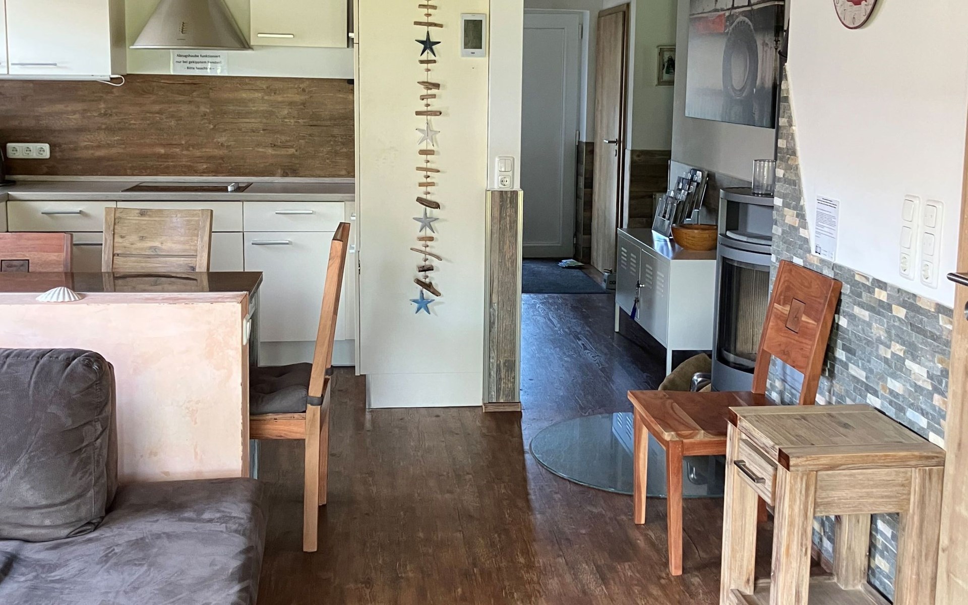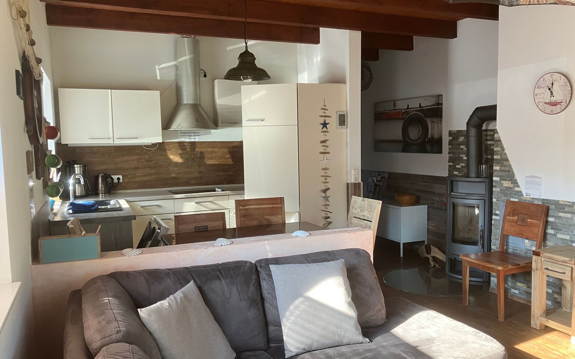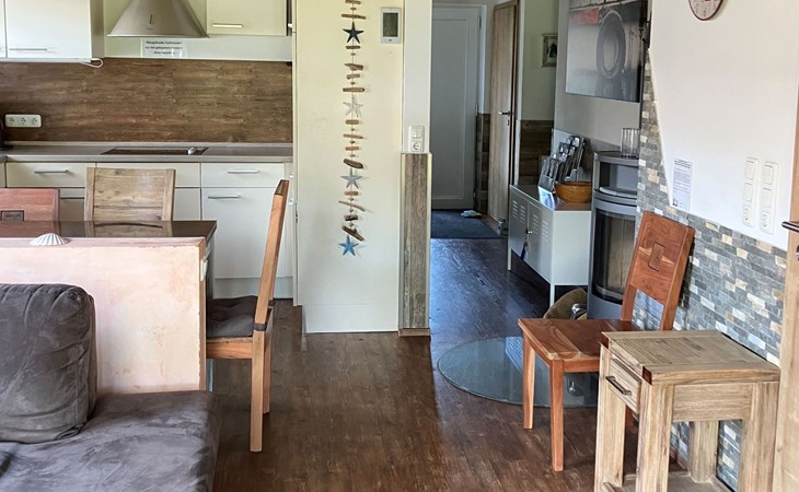 Im Inneren des Ferienhauses erwartet Sie eine hochwertige Ausstattung. Die eingeschossige Anordnung umfasst zwei moderne Duschbäder mit bodengleichen Duschen, was nahezu barrierefreien Komfort gewährleistet. Der offene Koch- und Wohnbereich mit seinem gemütlichen Ofen macht das Zusammensein besonders angenehm. Praktisch ist auch der separate Abstellraum mit Waschmaschine und Eisschrank sowie die mit Rollläden ausgestatteten Schlafzimmer, die für eine angenehme Nachtruhe sorgen.
