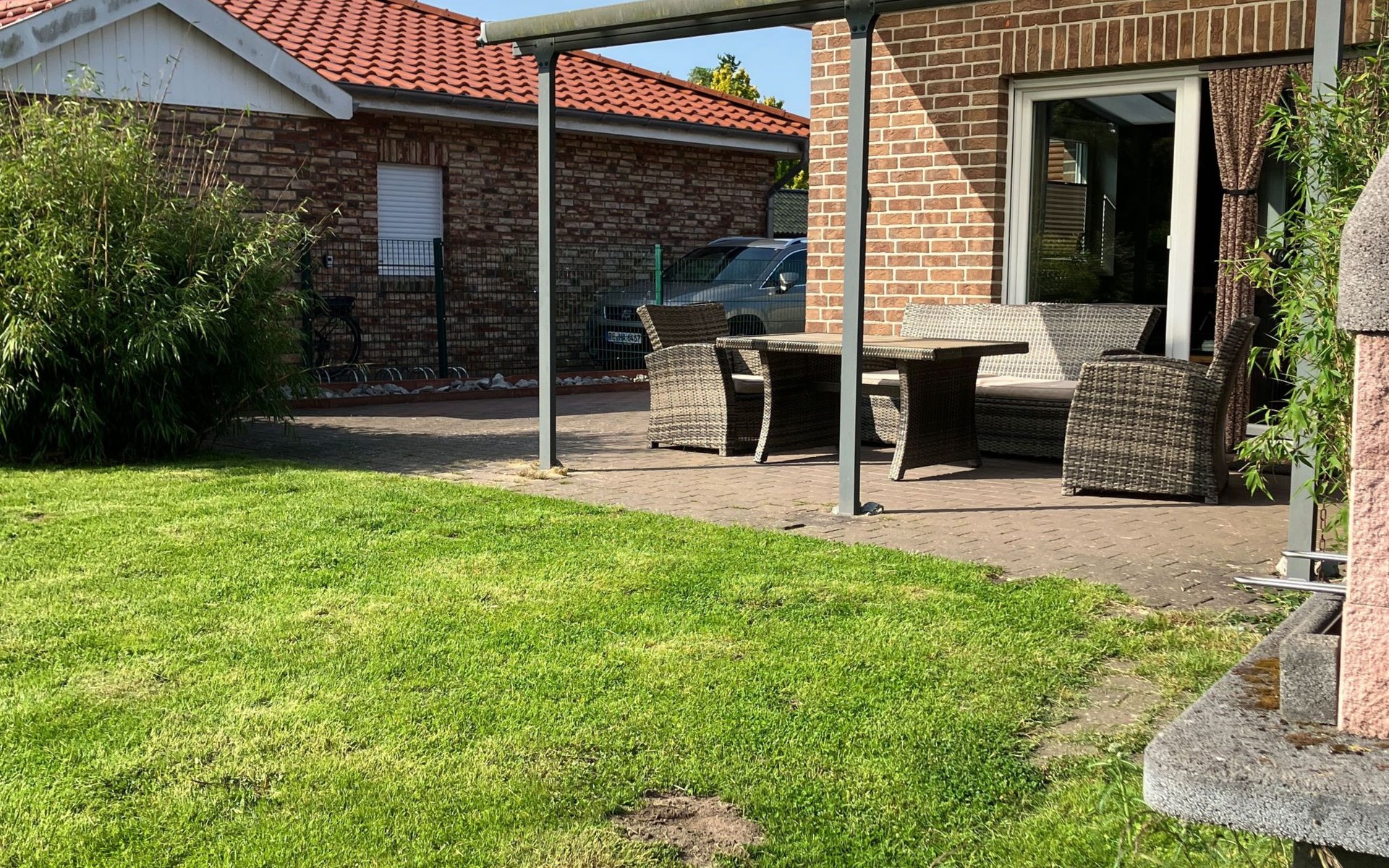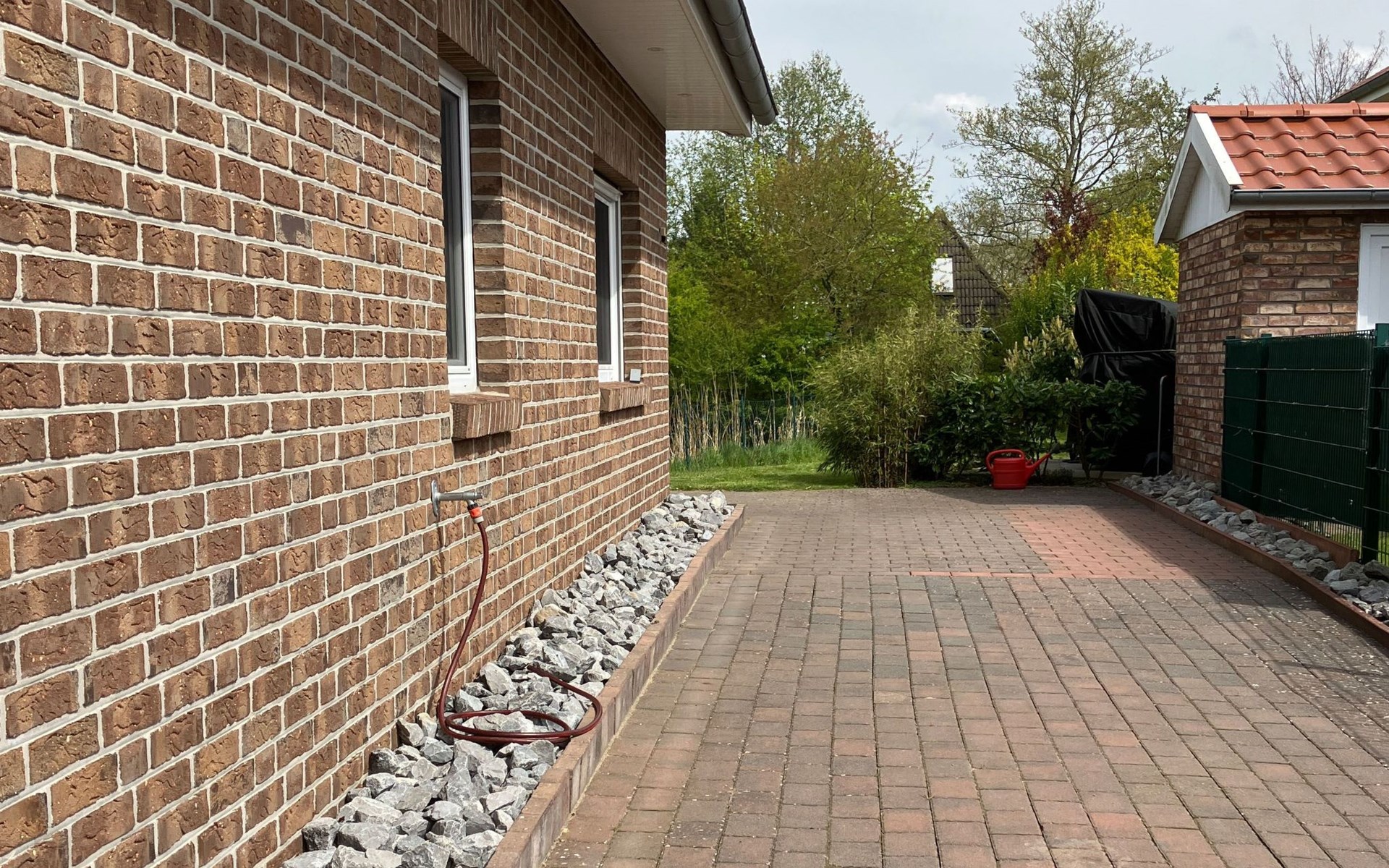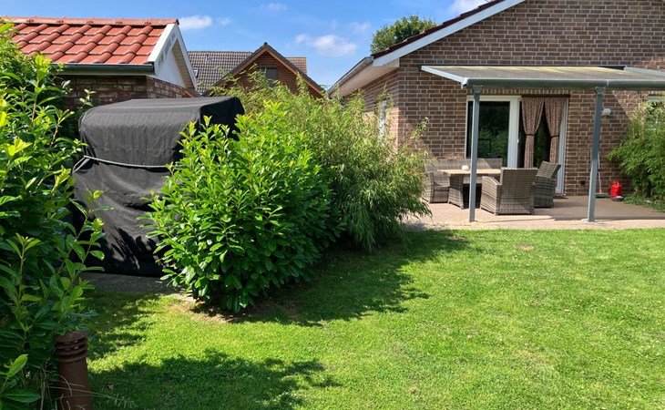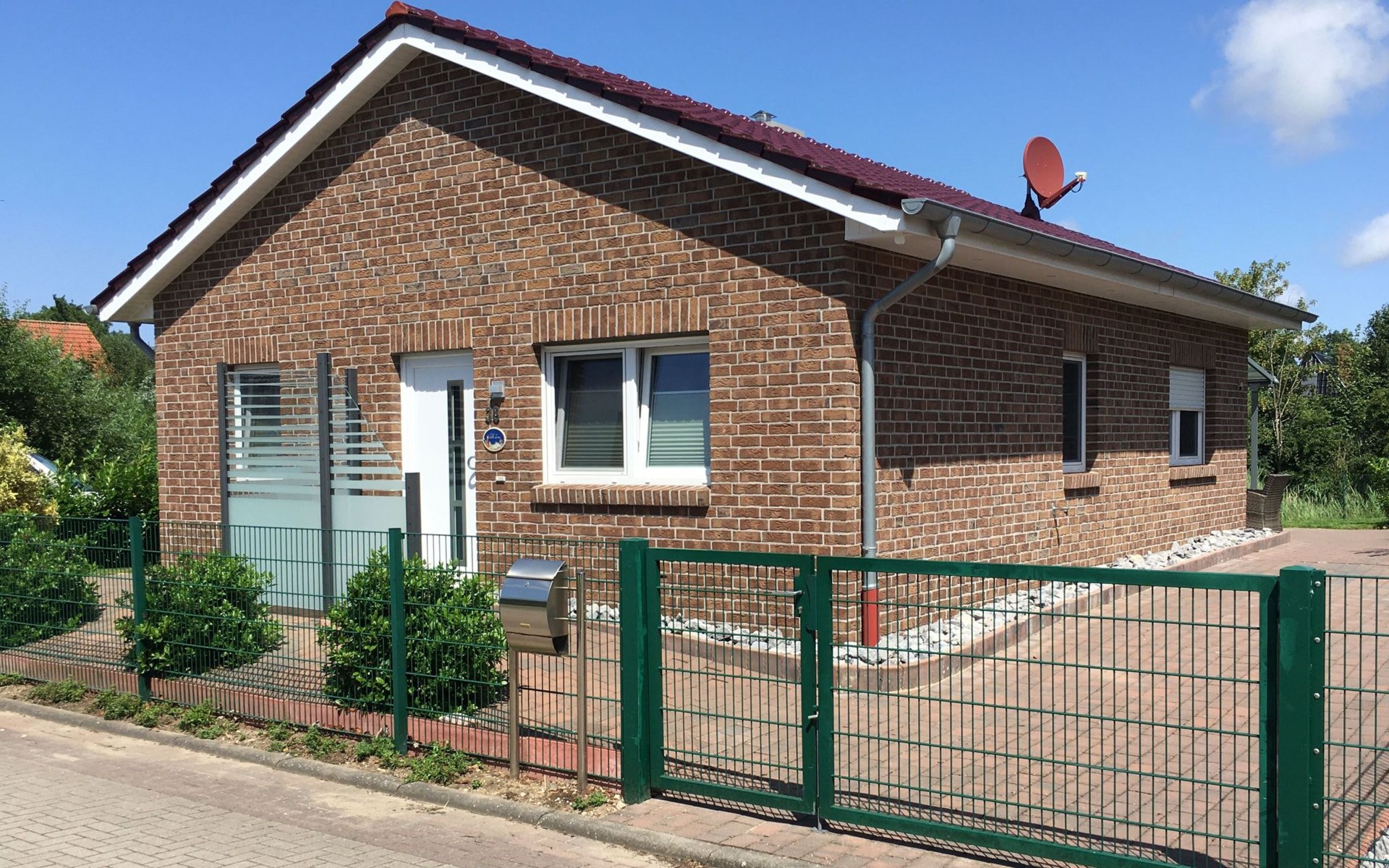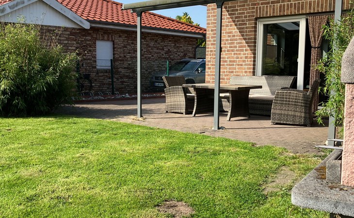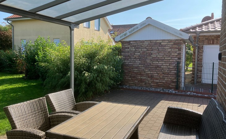 Unser Außenbereich bietet mit seiner vollständigen Umzäunung (Höhe mind. 1,00m) Sicherheit und Freiheit gleichermaßen, ideal für Hundebesitzer. Der eingezäunte Garten lädt zum Verweilen und Spielen ein, während ein Strandkorb Entspannung bietet.