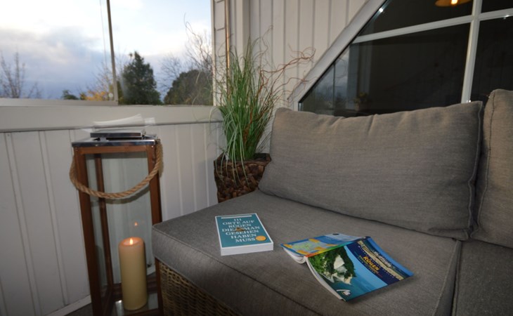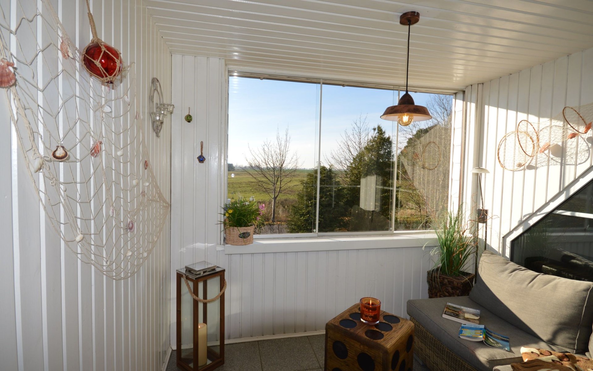 Die Loggia ist ein in den Wohnbereich integrierter Raum, der durch eine Balkontür betreten wird und rundum fast komplett verglast ist. Ein überdimensionales Außenfenster mit Schiebetüren lässt in diesem Raum ein balkonähnliches Ambiente entstehen, wozu die Gartenmöbel ebenfalls beitragen. Je nach Wind- und Wetterlage profitieren Sie somit von einem geschützten Sitzplatz mit einem weitreichenden Ausblick über die Insel. Ein Parkplatz ist auf dem Grundstück für Sie direkt am Haus erreichbar.