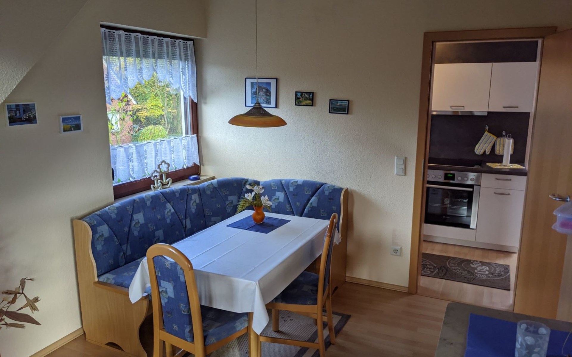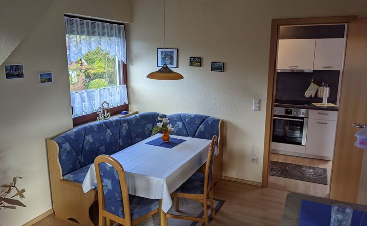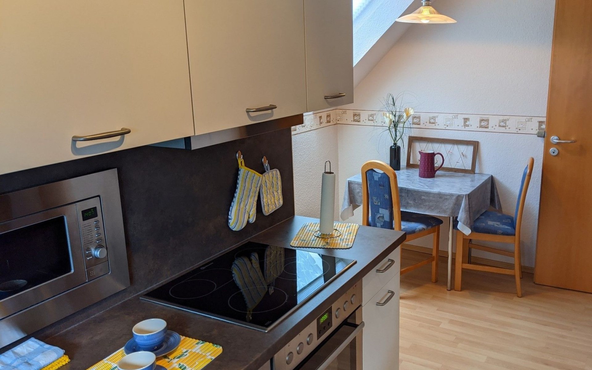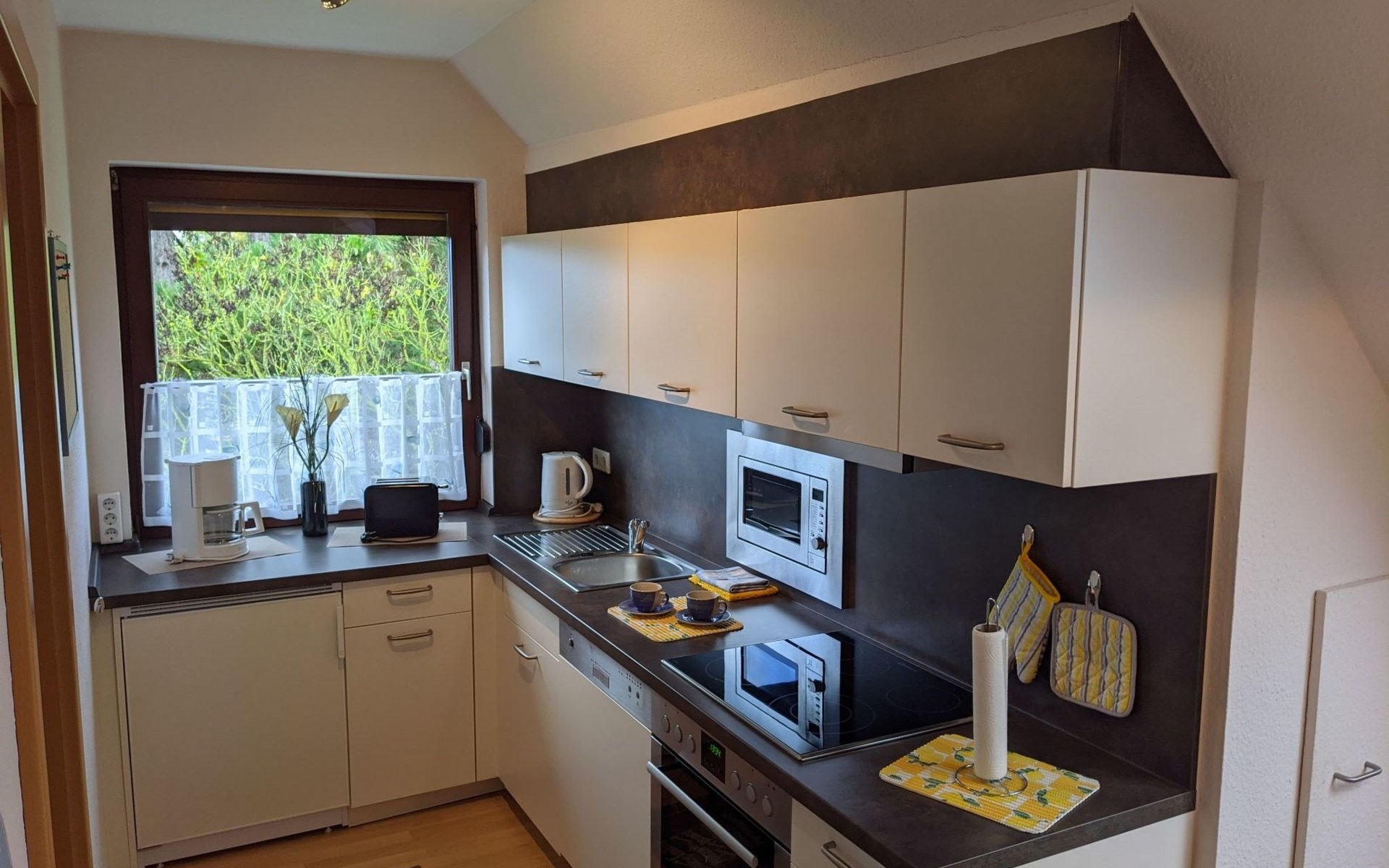 Die helle, voll ausgestattete Einbauküche mit Cerankochfeld, Backofen, Geschirrspülmaschine, Kühlschrank, Mikrowelle, Wasserkocher, Kaffeemaschine, Besteck, reichlich Geschirr und einer kleinen Frühstücksecke ist ideal zum gemeinsamen Frühstück und die Selbstversorgung geeignet.