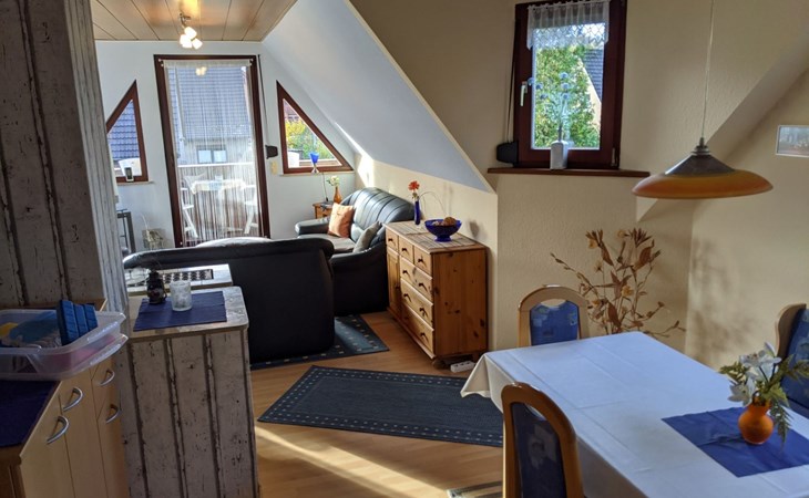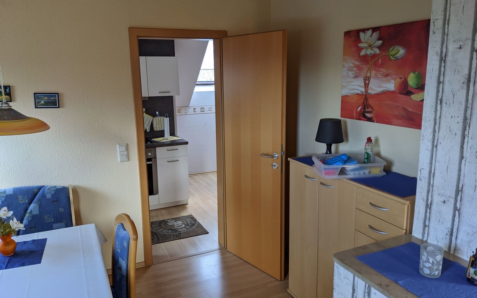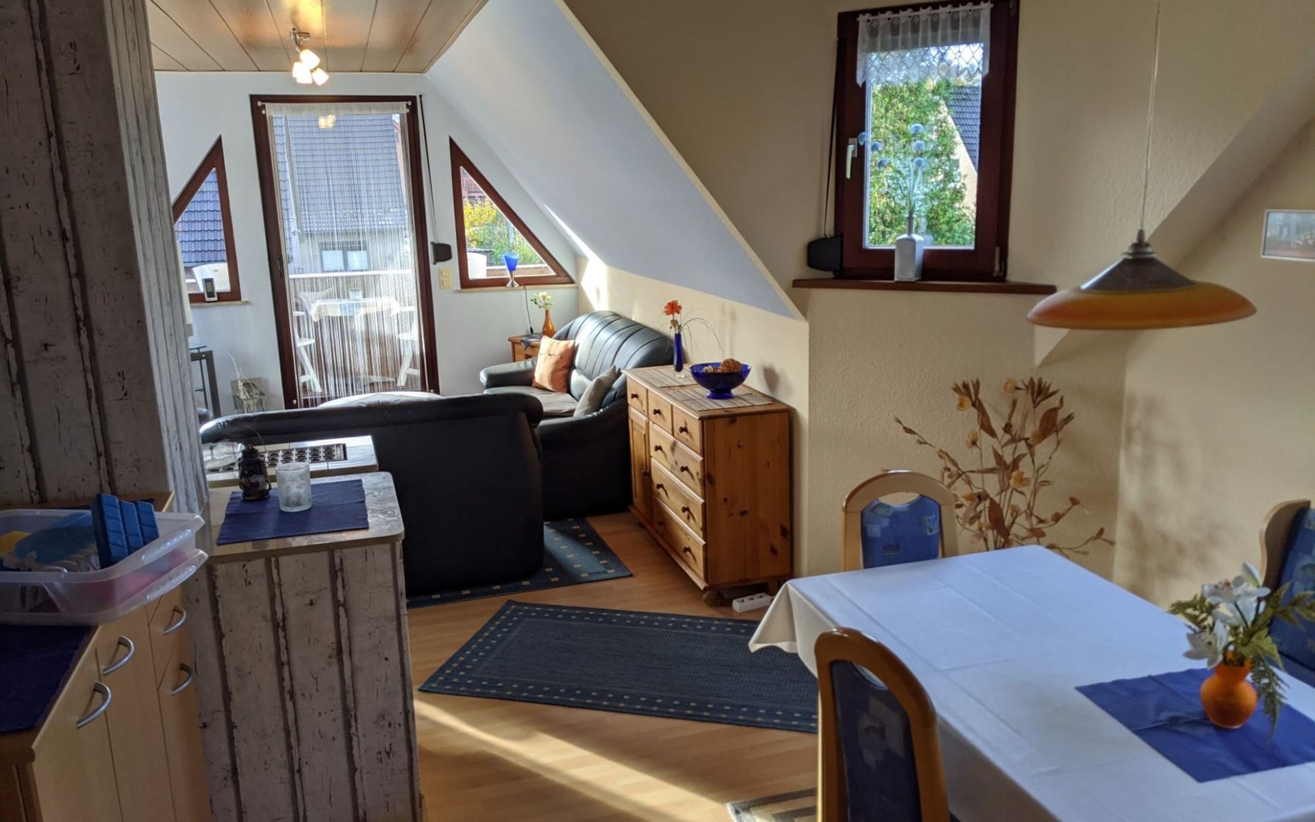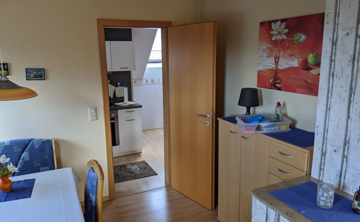 Die helle, voll ausgestattete Einbauküche mit Cerankochfeld, Backofen, Geschirrspülmaschine, Kühlschrank, Mikrowelle, Wasserkocher, Kaffeemaschine, Besteck, reichlich Geschirr und einer kleinen Frühstücksecke ist ideal zum gemeinsamen Frühstück und die Selbstversorgung geeignet.