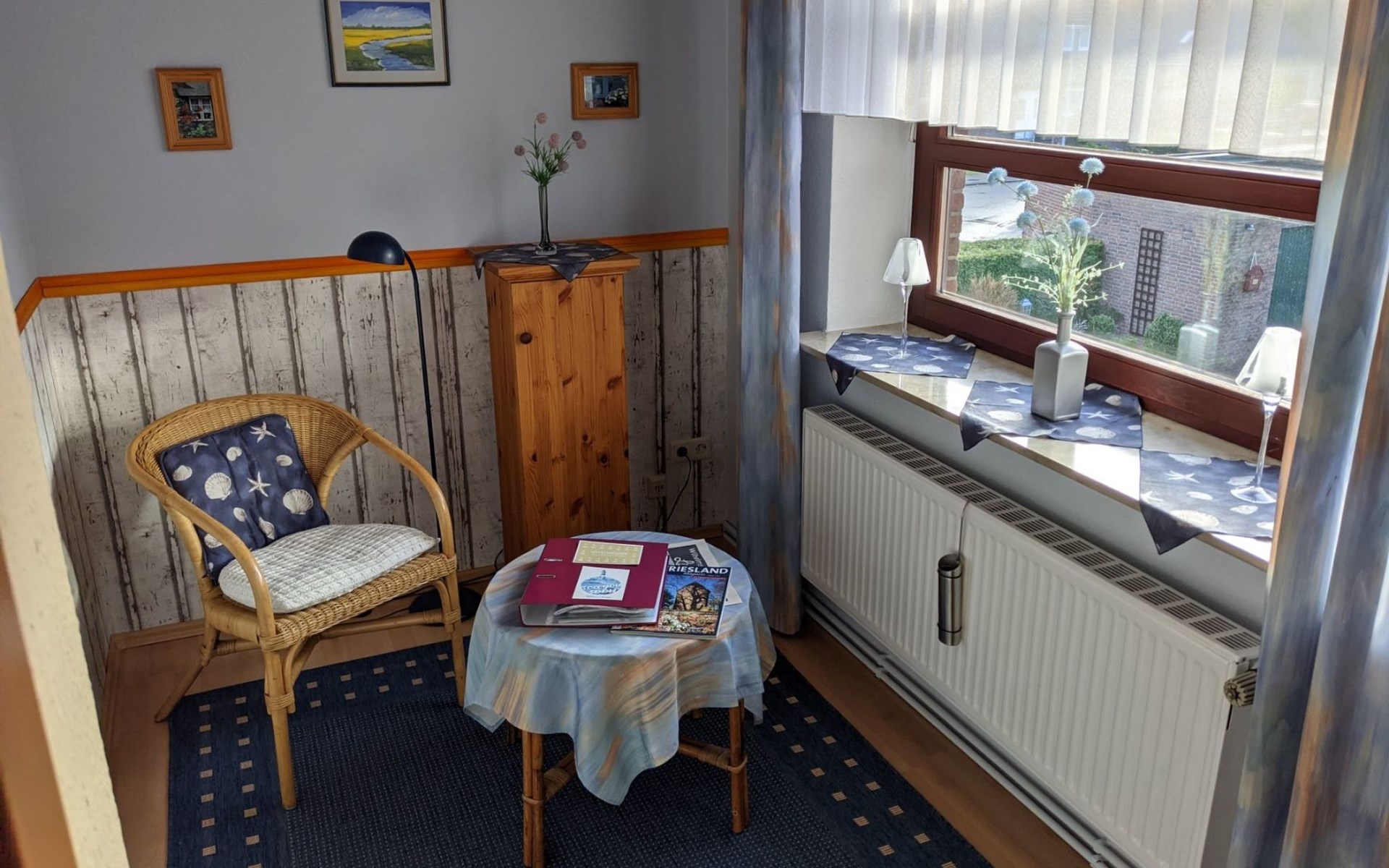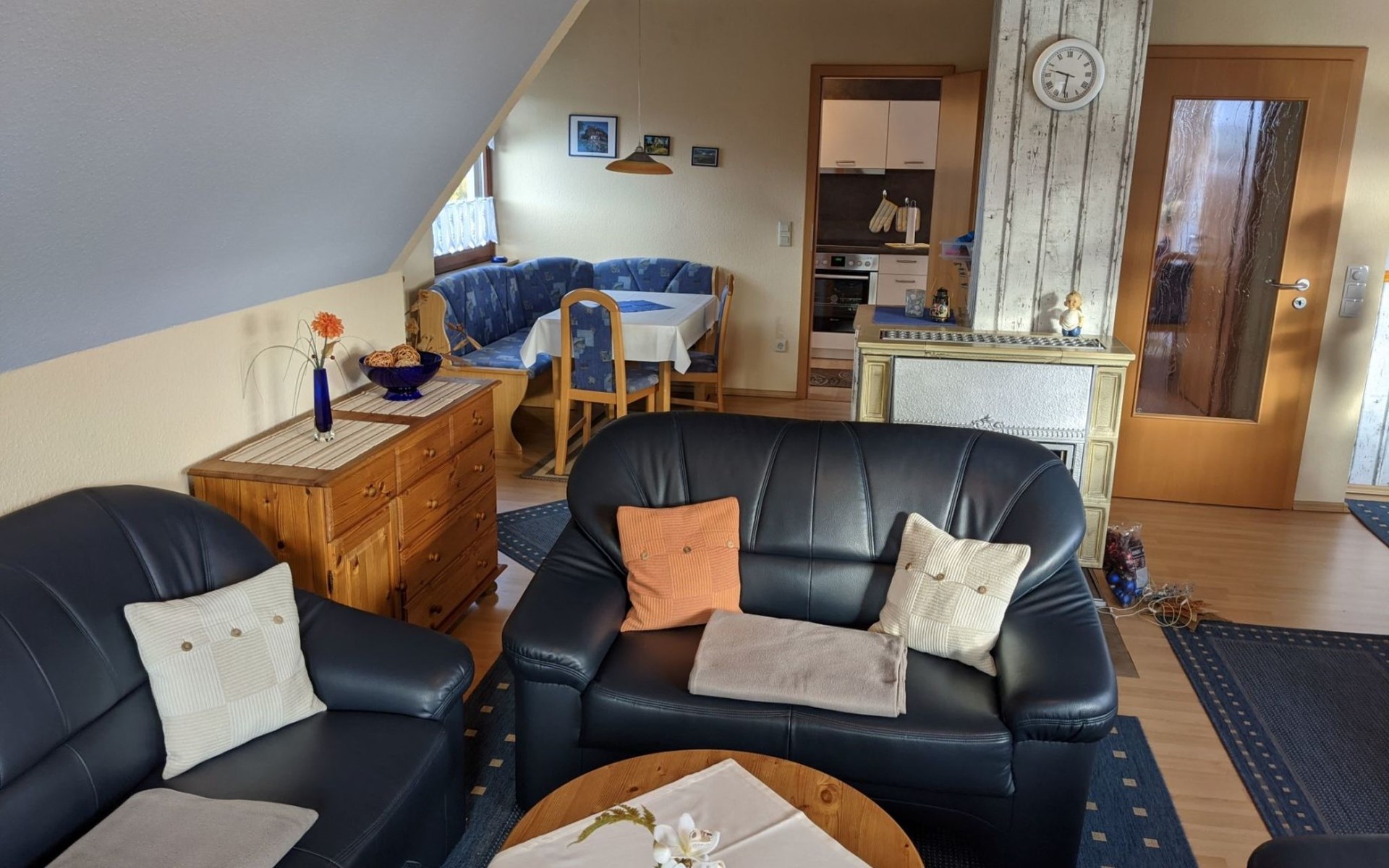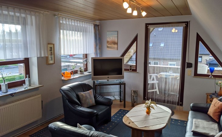 WOHNZIMMER Das offen gestaltete Wohnzimmer ist mit einer gemütlichen Ledersitzecke, bestehend aus 2 Zweisitzern, einem Sessel und einer Holzkommode ausgestattet, in der sich auch der Essbereich mit Eckbank, 2 Stühlen und einem Tisch befindet. Im Wohnzimmer stehen auch der moderne TV-Flachbildschirm mit Satellitenfernsehen und ein Radio. Für Leseratten gibt es eine kleine, separat eingerichtete Sitzecke. Vom Wohnzimmer geht es auf die große Loggia, die mit passenden Sitzmöbeln ausgestattet ist. Von hier aus hat man einen wundervollen Blick in den liebevoll gepflegten Garten.