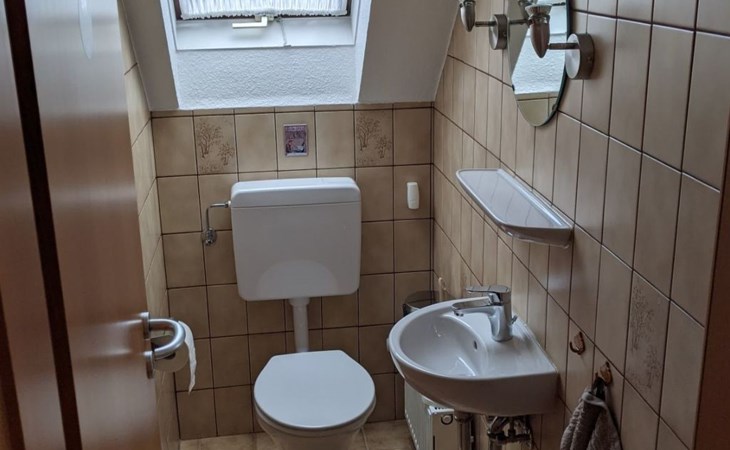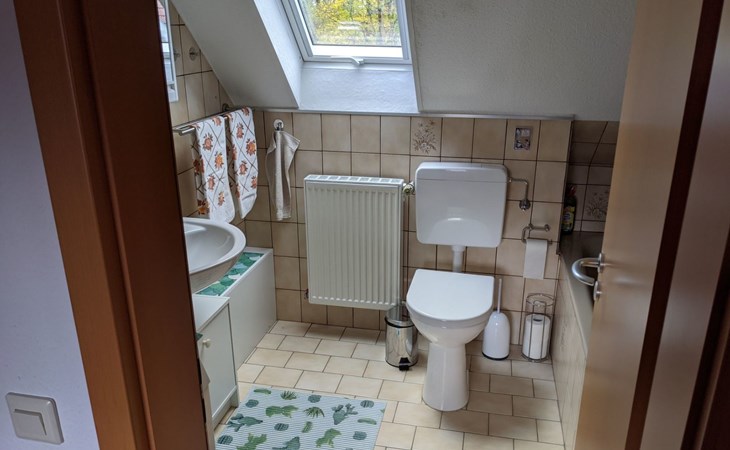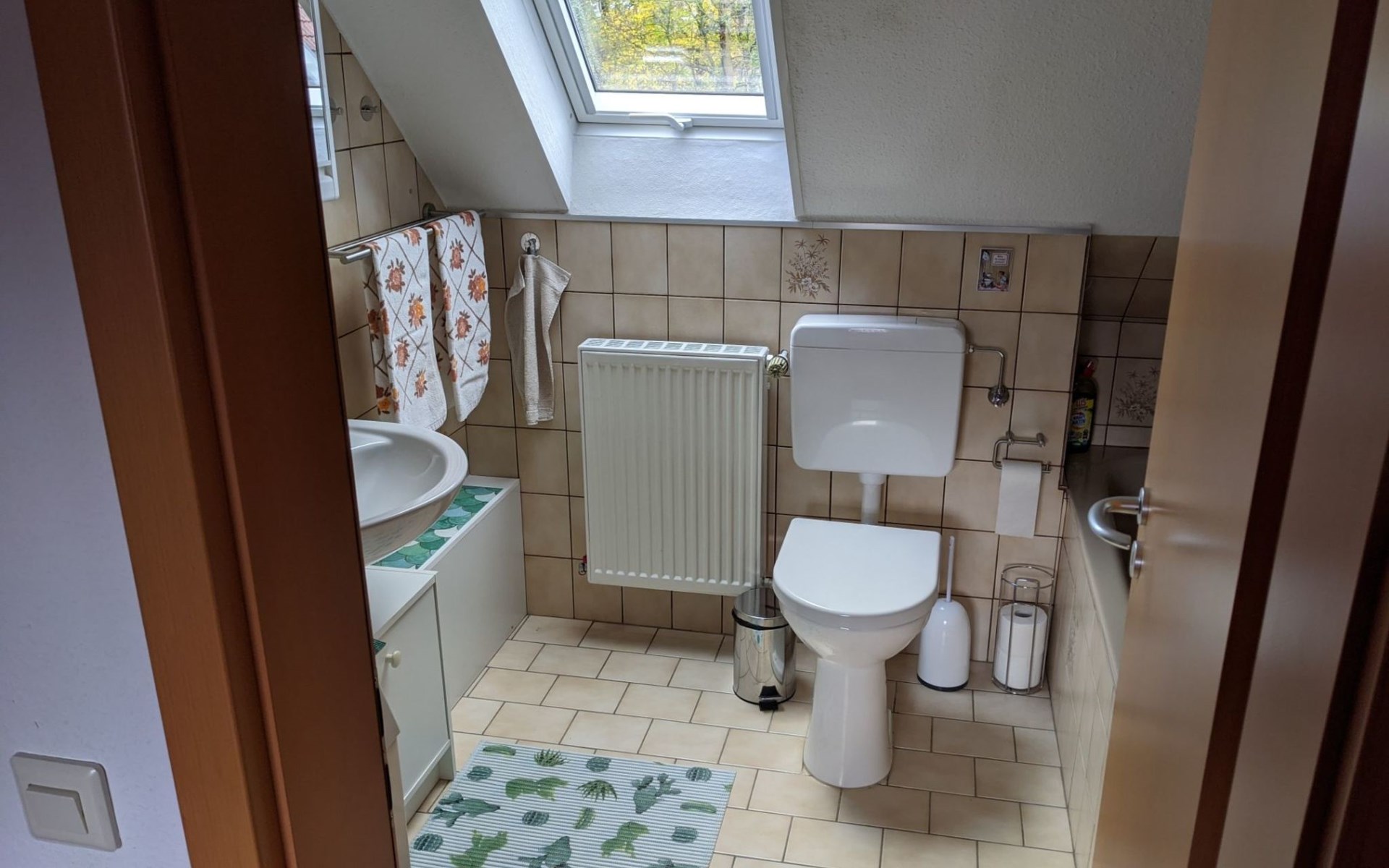 Auch das Gäste-WC ist komplett verfliest. Mit WC, Waschtisch und einem großen Dachfenster bietet es viel Tageslicht und kann für die morgendliche "Katzenwäsche" genutzt werden.