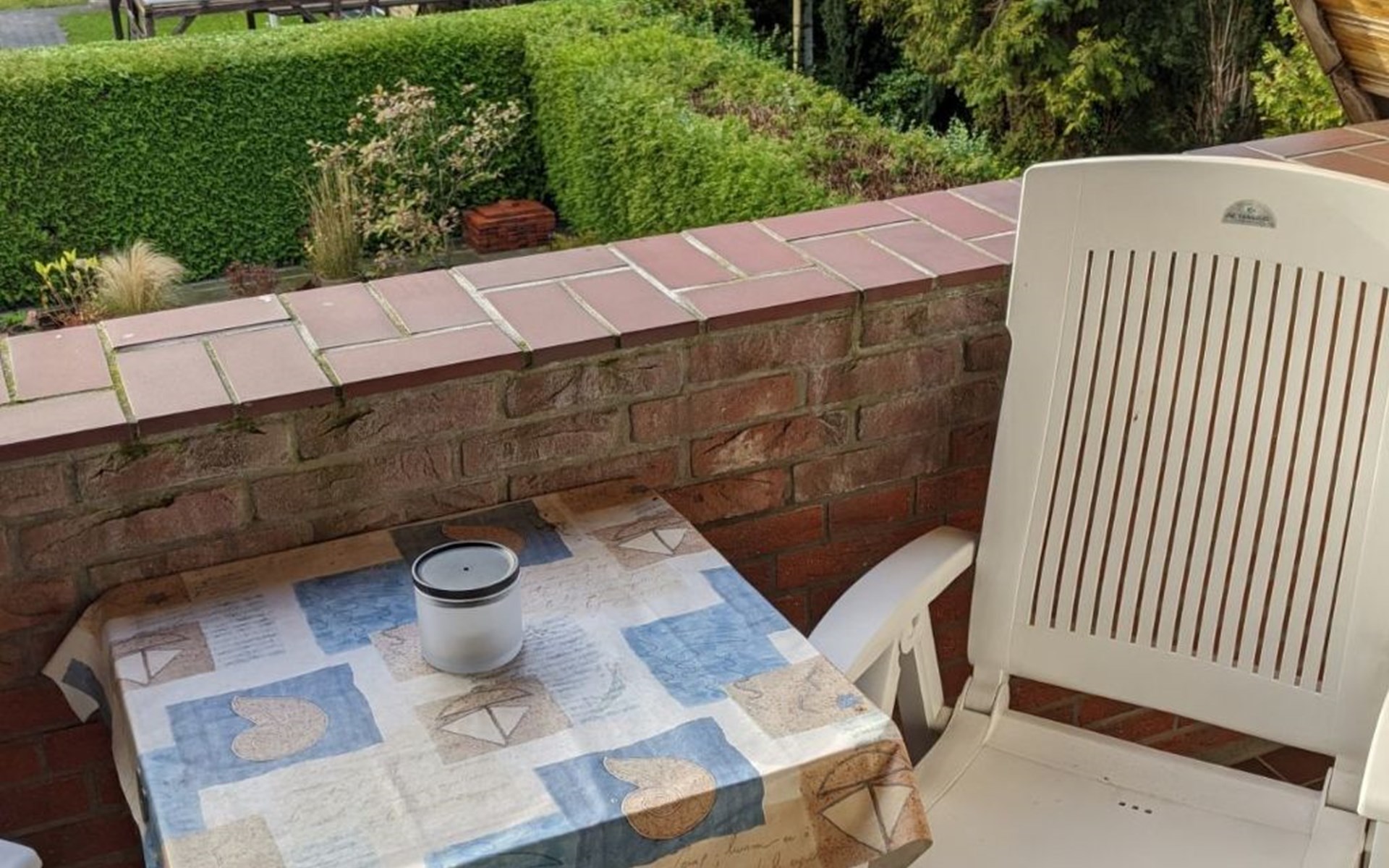 Auf der Loggia mit Blick in den großen Garten stehen 2 Gartenstühle mit Stuhlauflagen und ein Gartentisch. Das Zweifamilienhaus ist von einer großen Gartenhecke umgeben.
