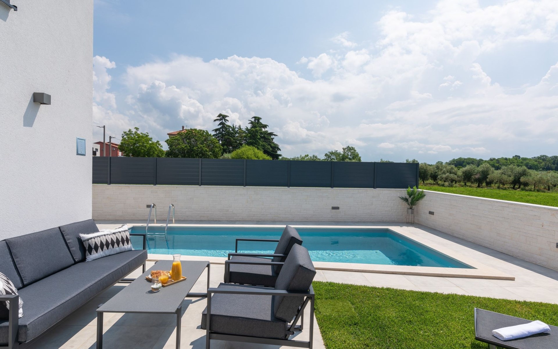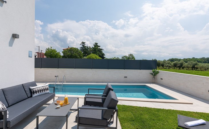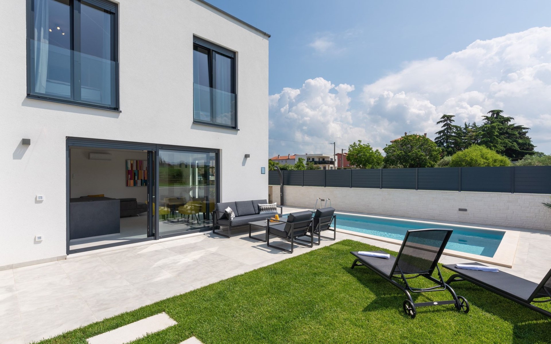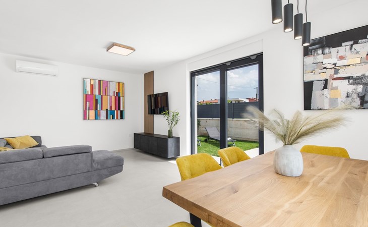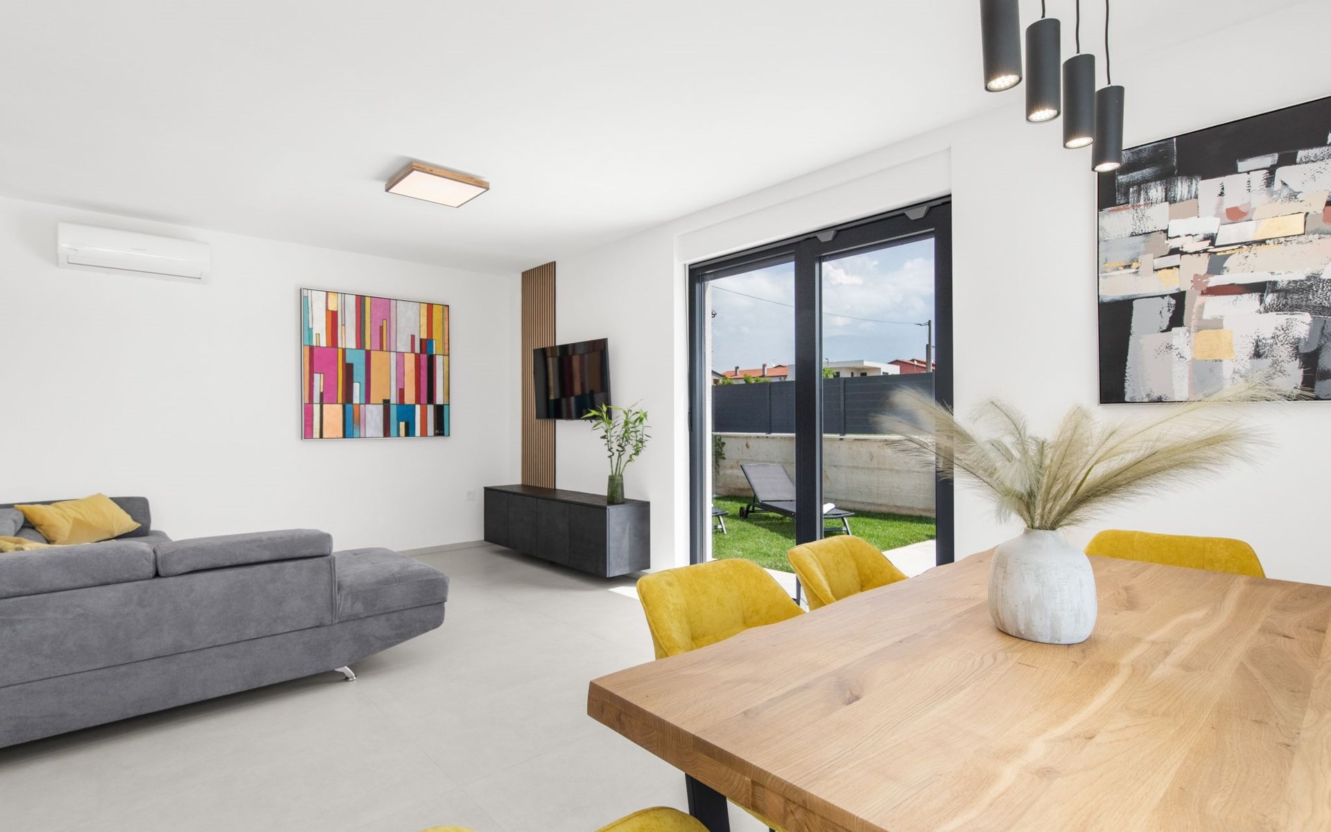 Modernes Reihenhaus "Villa Valero", auf 2 Stockwerken, Baujahr 2023. Im Weiler Strada Contessa, 1 km vom Zentrum von Novigrad, ruhige, sonnige Lage, 2 km vom Meer, 2 km vom Strand. Zur Alleinbenutzung: Grundstück 250 m2 (eingezäunt) mit Rasen, Schwimmbad (20 m2, 140 cm tief, saisonale Verfügbarkeit: 01.Apr. - 01.Nov.). Aussendusche, Terrasse (20 m2), Gartenmöbel, Grill. Im Hause: Internetzugang, Klimaanlage, Waschmaschine. Parkplatz (für 3 Autos) beim Haus auf dem Grundstück. Einkaufsgeschäft 2 km, Supermarkt 2 km, Restaurant 1 km, Bushaltestelle 2.5 km, Bahnstation 37 km, Kieselstrand 2 km, Felsstrand 2 km. Golfplatz (18 Loch) 20 m, Tennis 1.5 km. Nahe gelegene Sehenswürdigkeiten: Aquapark 4 km. Der Besitzer akzeptiert keine Jugendgruppen.