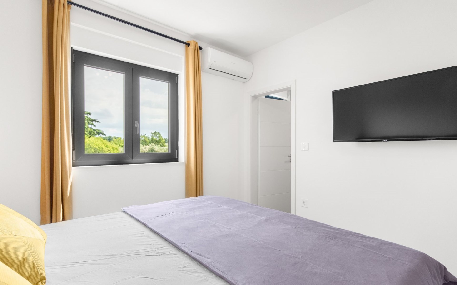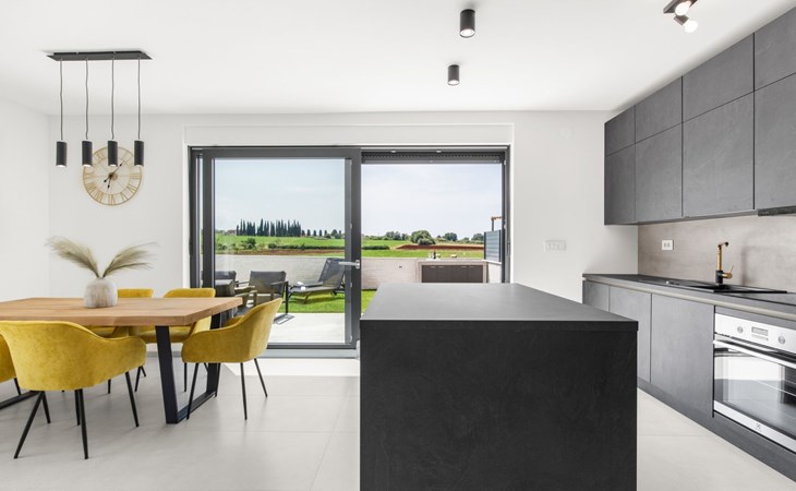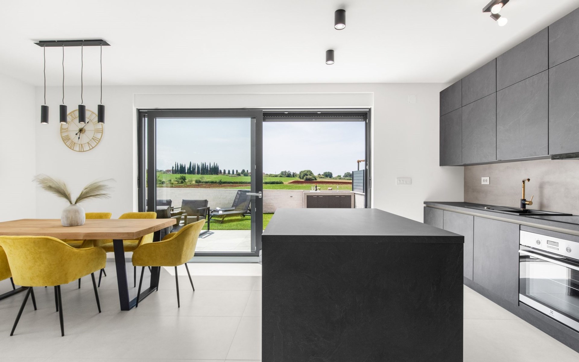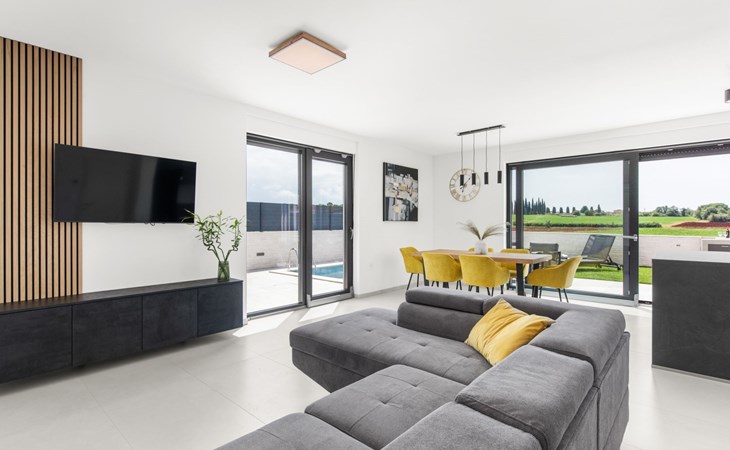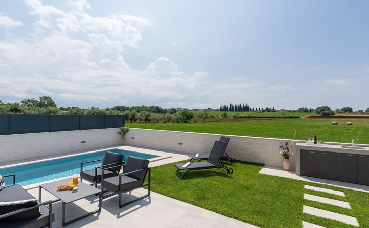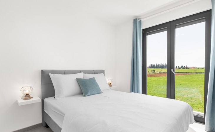 Modernes Reihenhaus "Villa Valero", auf 2 Stockwerken, Baujahr 2023. Im Weiler Strada Contessa, 1 km vom Zentrum von Novigrad, ruhige, sonnige Lage, 2 km vom Meer, 2 km vom Strand. Zur Alleinbenutzung: Grundstück 250 m2 (eingezäunt) mit Rasen, Schwimmbad (20 m2, 140 cm tief, saisonale Verfügbarkeit: 01.Apr. - 01.Nov.). Aussendusche, Terrasse (20 m2), Gartenmöbel, Grill. Im Hause: Internetzugang, Klimaanlage, Waschmaschine. Parkplatz (für 3 Autos) beim Haus auf dem Grundstück. Einkaufsgeschäft 2 km, Supermarkt 2 km, Restaurant 1 km, Bushaltestelle 2.5 km, Bahnstation 37 km, Kieselstrand 2 km, Felsstrand 2 km. Golfplatz (18 Loch) 20 m, Tennis 1.5 km. Nahe gelegene Sehenswürdigkeiten: Aquapark 4 km. Der Besitzer akzeptiert keine Jugendgruppen.