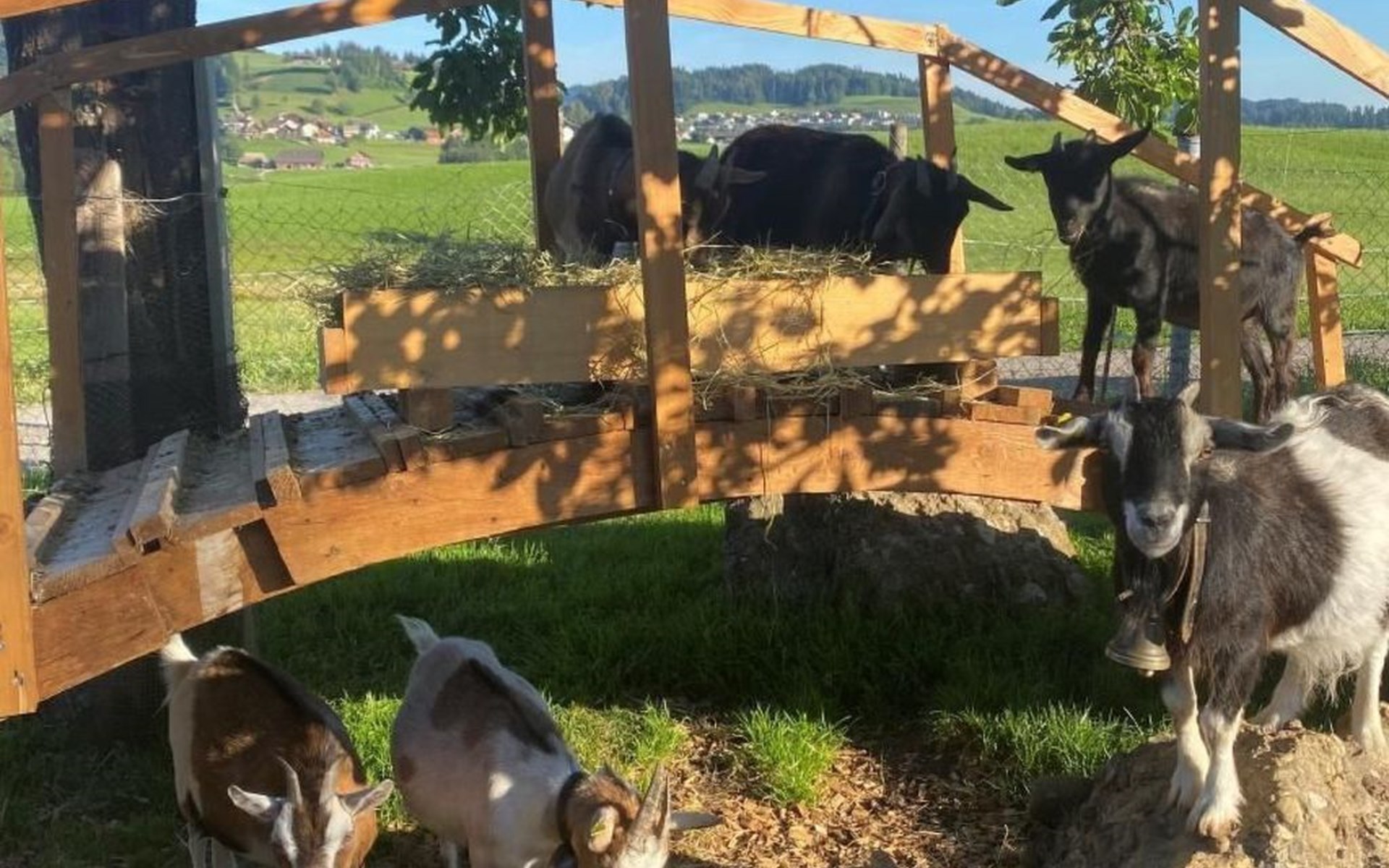 Während den Stallzeiten dürft ihr gerne bei der Versorgung der Tiere dabei sein. Ein Eselspaziergang kann vereinbart werden. Für die Kinder steht ein grosser Spiel- & Fussballplatz, inkl. Trampolin zur Verfügung. Die kleinen Gäste verweilen gerne im Sandkasten.