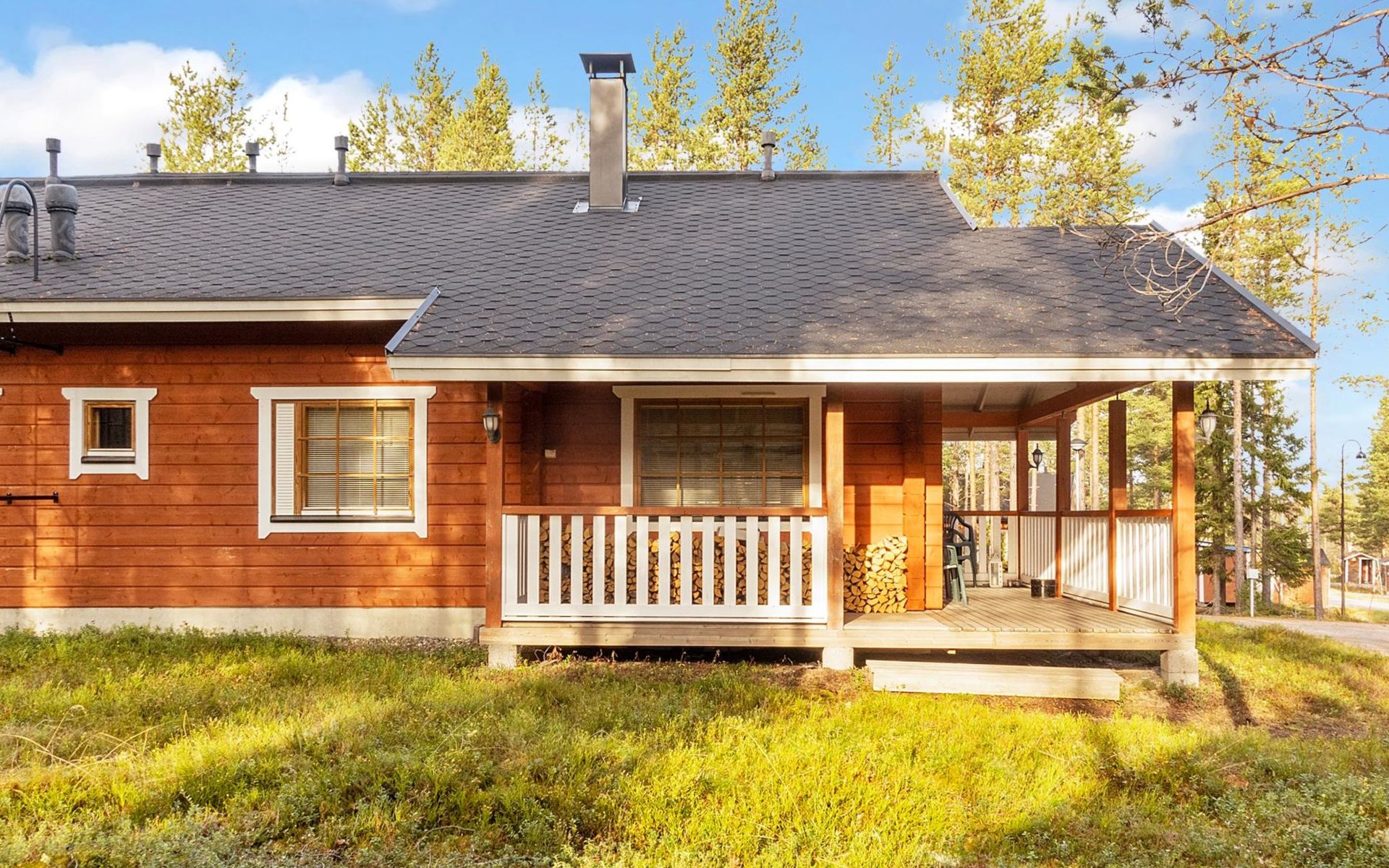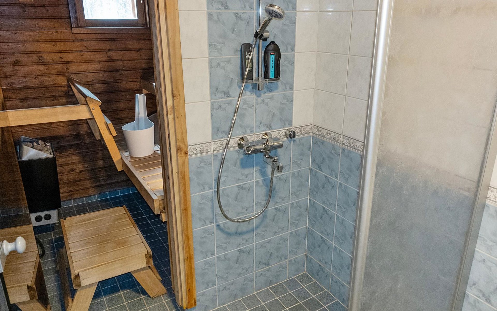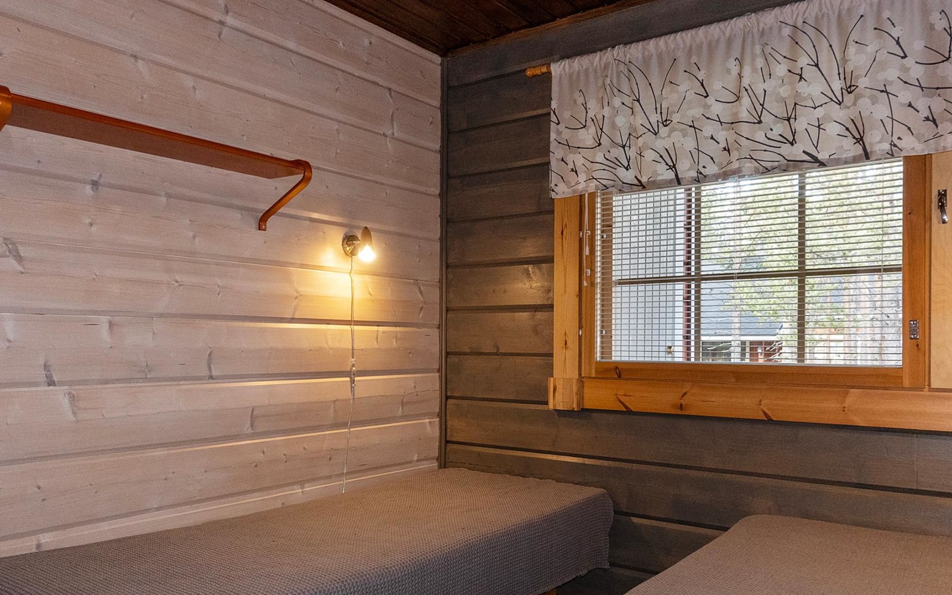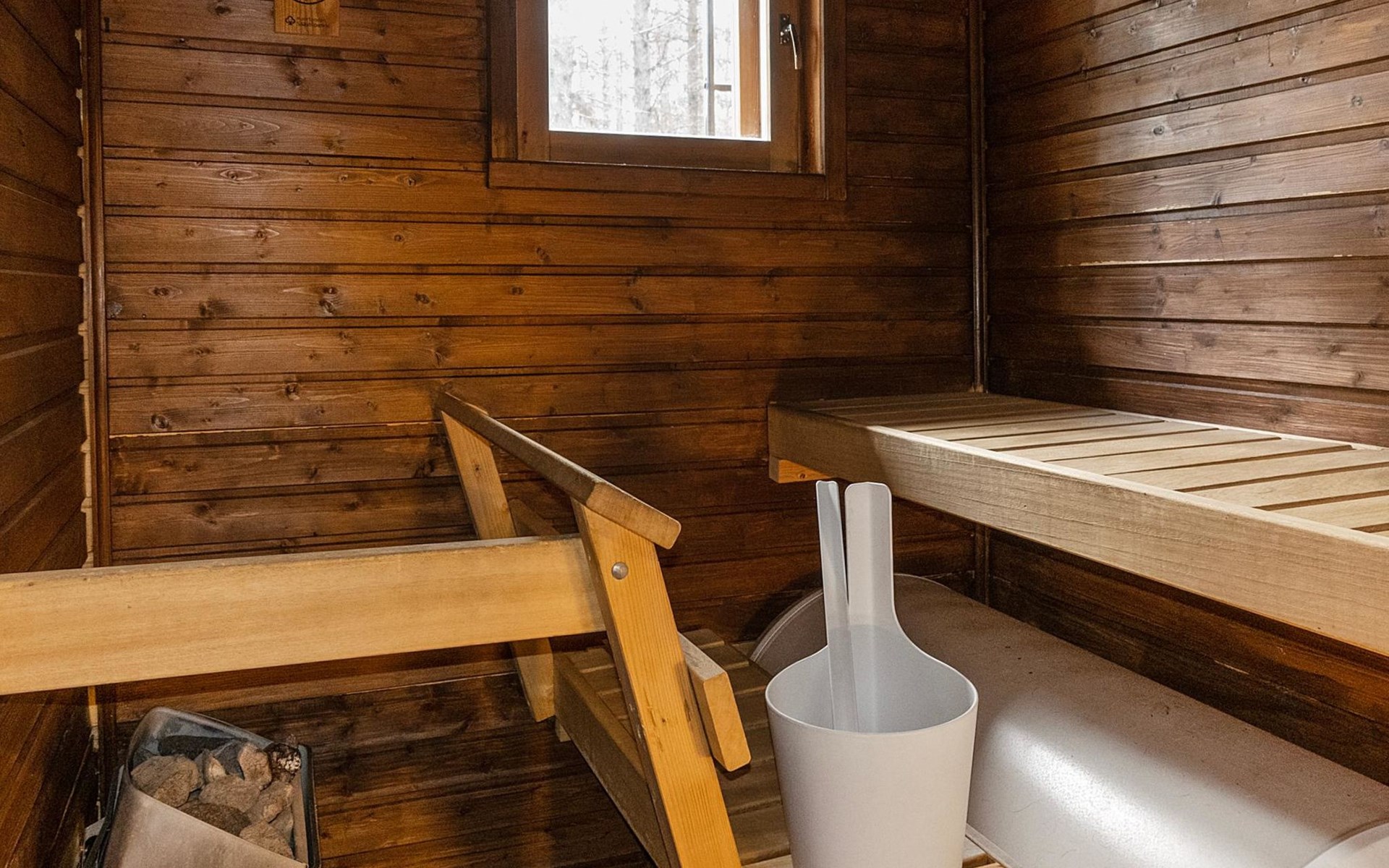 The cabin features a sauna, shower room, separate WC, storage, and a covered terrace.