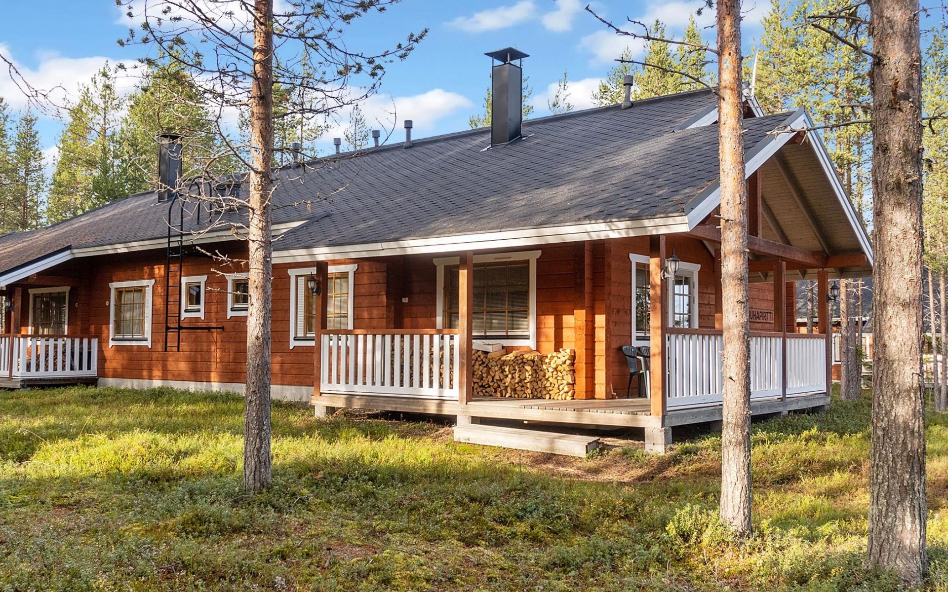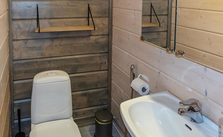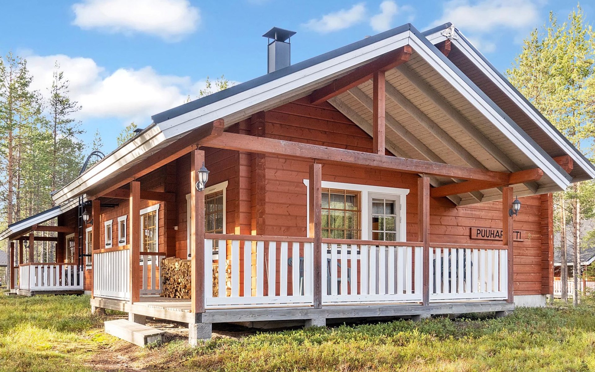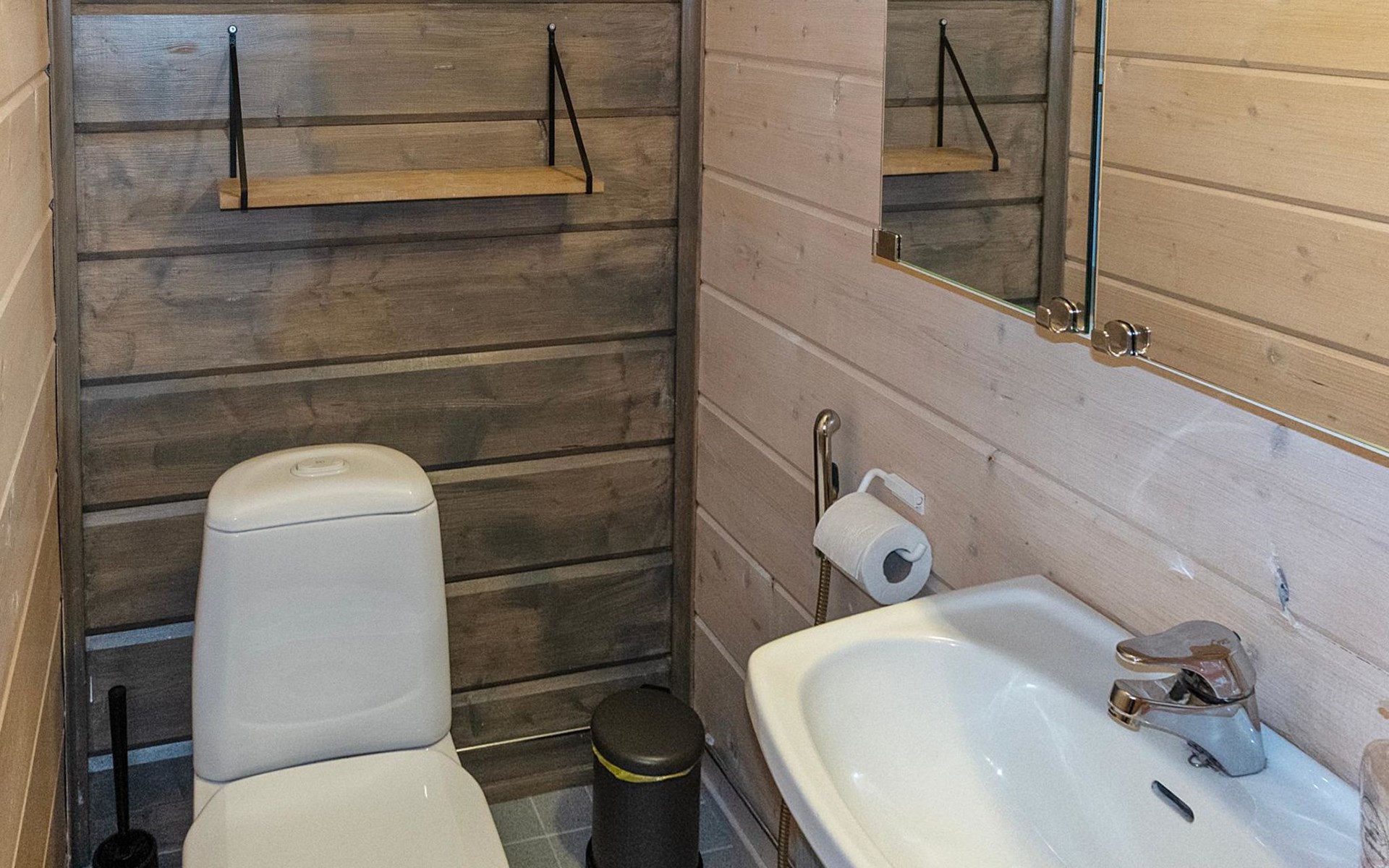 The cabin features a sauna, shower room, separate WC, storage, and a covered terrace.